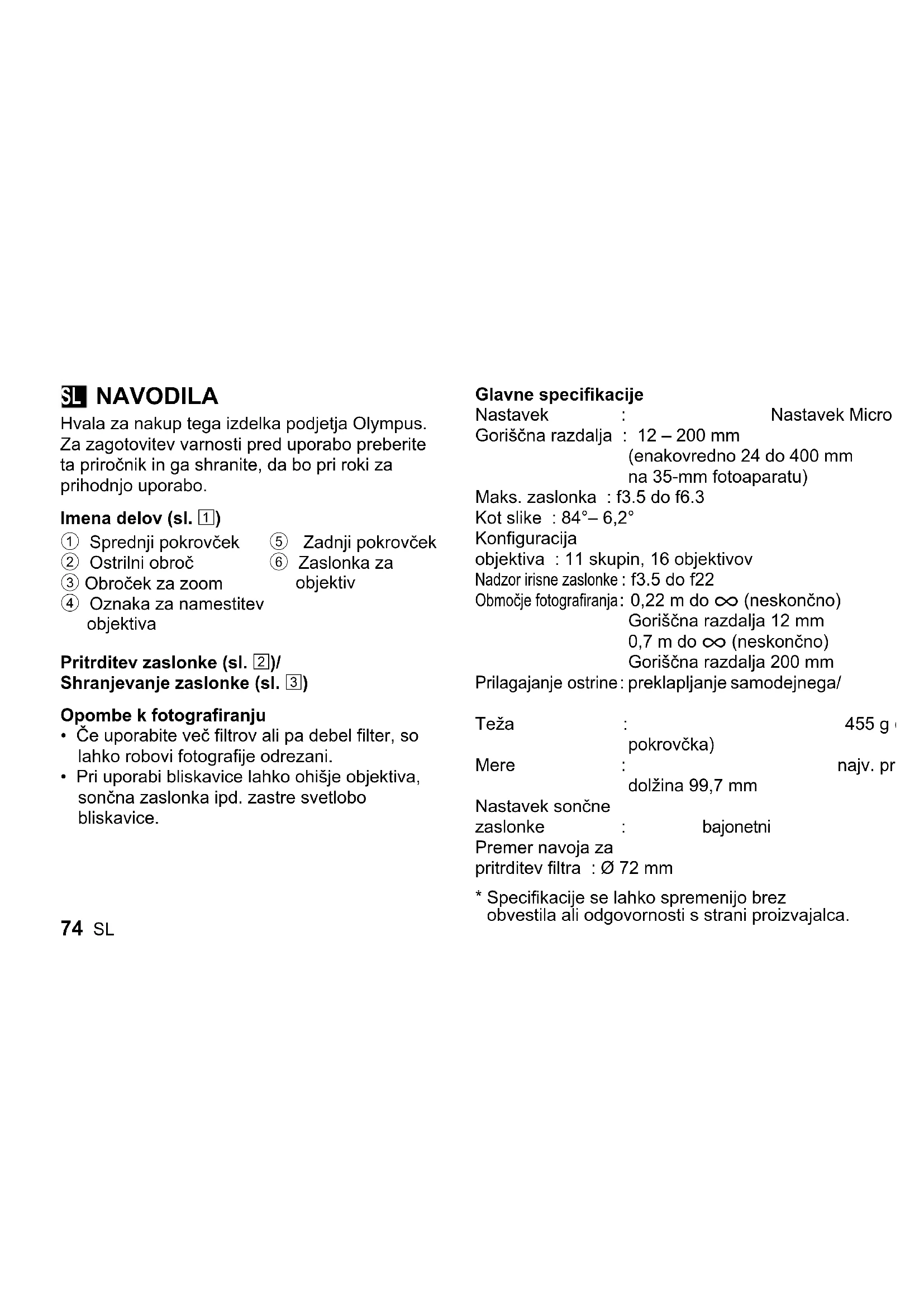 - Specifikacije se lahko spremenijo brez obvestila ali odgovornosti s strani proizvajalca. SLSL 75 Vzdrževanje Z objektiva spihajte prah z izpihovalnikom, ki je na voljo na tržišču. Objektiv nežno obrišite s čistilnim papirjem za objektive. Obvezno preberite naslednja opozorila Varnostni ukrepi