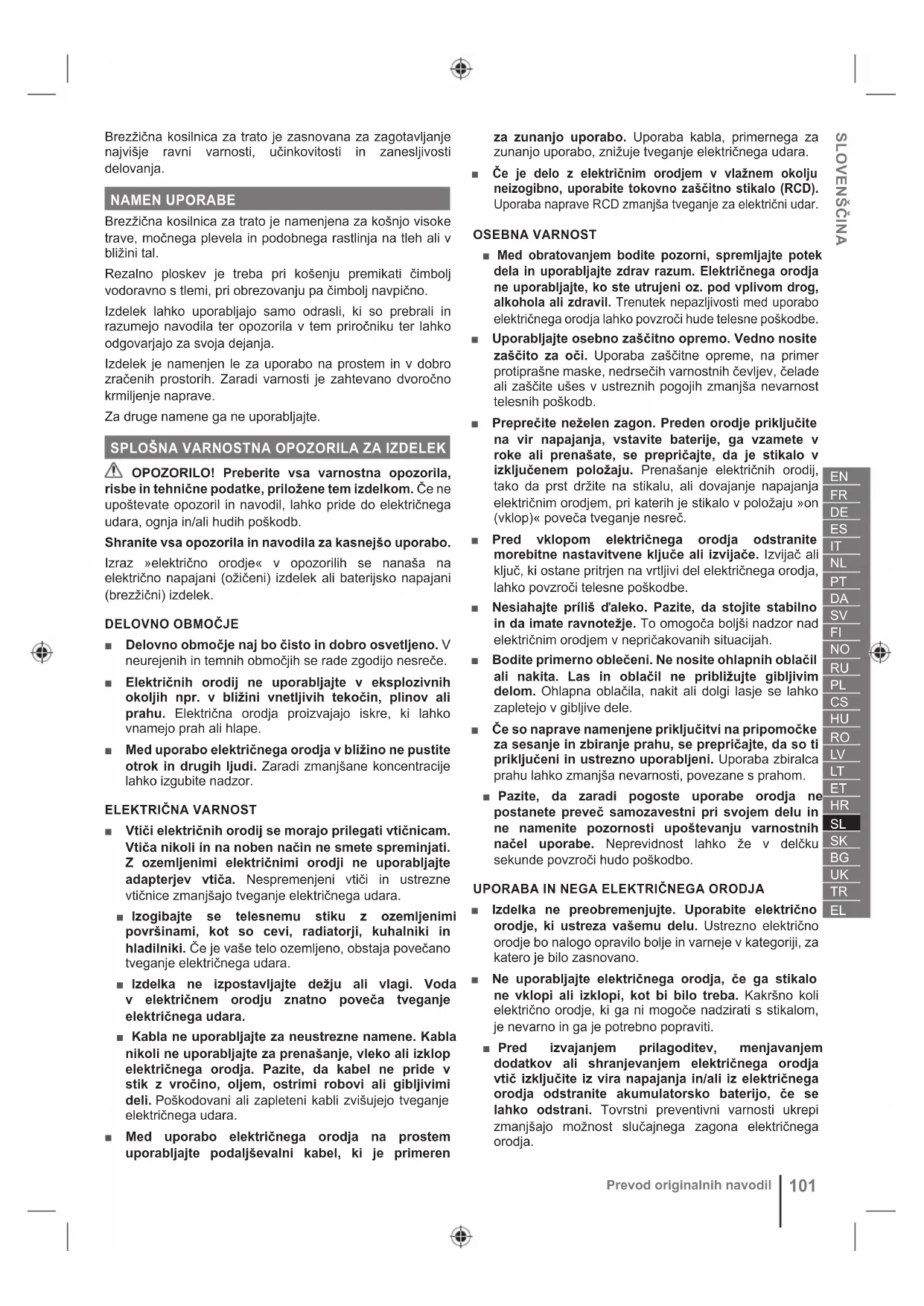 TRAVE ■ Stroja ne uporabljajte v slabem vremenu, predvsem če obstaja nevarnost grmenja. To zmanjša nevarnost udara strele. ■ Temeljito preverite, ali so na območju, kjer nameravate uporabljati stroj, živali. Delujoč stroj lahko poškoduje živali. ■ Temeljito preglejte območje, v katerem boste uporabljali stroj, in odstranite vse kamne, veje, žice, kosti in drug material. Leteči predmeti lahko povzročijo telesne poškodbe. ■ Pred uporabo stroja vedno vizualno preverite, ali sta rezalnik ali rezilo oziroma sestav rezalnika ali rezila poškodovana. Poškodovani deli povečajo nevarnost telesnih poškodb. ■ Upoštevajte navodila za menjavo dodatkov. Neustrezno privite pritrdilne matice ali vijaki rezila lahko poškodujejo rezilo ali povzročijo, da le-to odpade. ■ Nosite zaščito oči, ušes, glave in rok. Ustrezna zaščitna oprema zmanjša telesne poškodbe zaradi letečega drobirja ali slučajnega stika z rezilno nitko ali rezilom. ■ Med uporabo stroja vedno nosite nedrsečo in zaščitno obutev. Naprave ne uporabljajte, če ste bosi ali nosite odprte sandale. S tem se zmanjša možnost poškodb nog, če pridejo v stik s premikajočimi se rezili ali nitkami. ■ Med uporabo stroja vedno nosite dolge hlače. Izpostavljena koža poveča možnost telesnih poškodb zaradi letečih predmetov. ■ Med uporabo stroja naj se opazovalci ne približujejo delovnemu območju. Leteči drobir lahko povzroči hude telesne poškodbe. ■ Stroj vedno uporabljajte z obema rokama. Držanje stroja z obema rokama prepreči izgubo nadzora. ■ Stroj držite izključno za izolirana držala, ker se rezilna nitka ali rezilo lahko dotakne skritih kablov. Rezilna nitka ali rezila, ki pridejo v stik s kablom pod napetostjo, lahko povzročijo prenos napetosti na kovinske dele stroja, zaradi česar operater lahko doživi električni udar. ■ Vedno stabilno stojte in stroj uporabljajte le, ko stojite na tleh. Spolzke ali nestabilne površine lahko povzročijo izgubo ravnotežja ali nadzora nad strojem. ■ Stroja ne uporabljajte na preveč strmih pobočjih. S tem se zmanjša nevarnost izgube nadzora, zdrsa in padca ter posledičnih telesnih poškodb. ■ Med delom na pobočjih hodite s trdnimi koraki in vedno delajte prečno na pobočja, nikoli v smeriSLOVENŠČINA