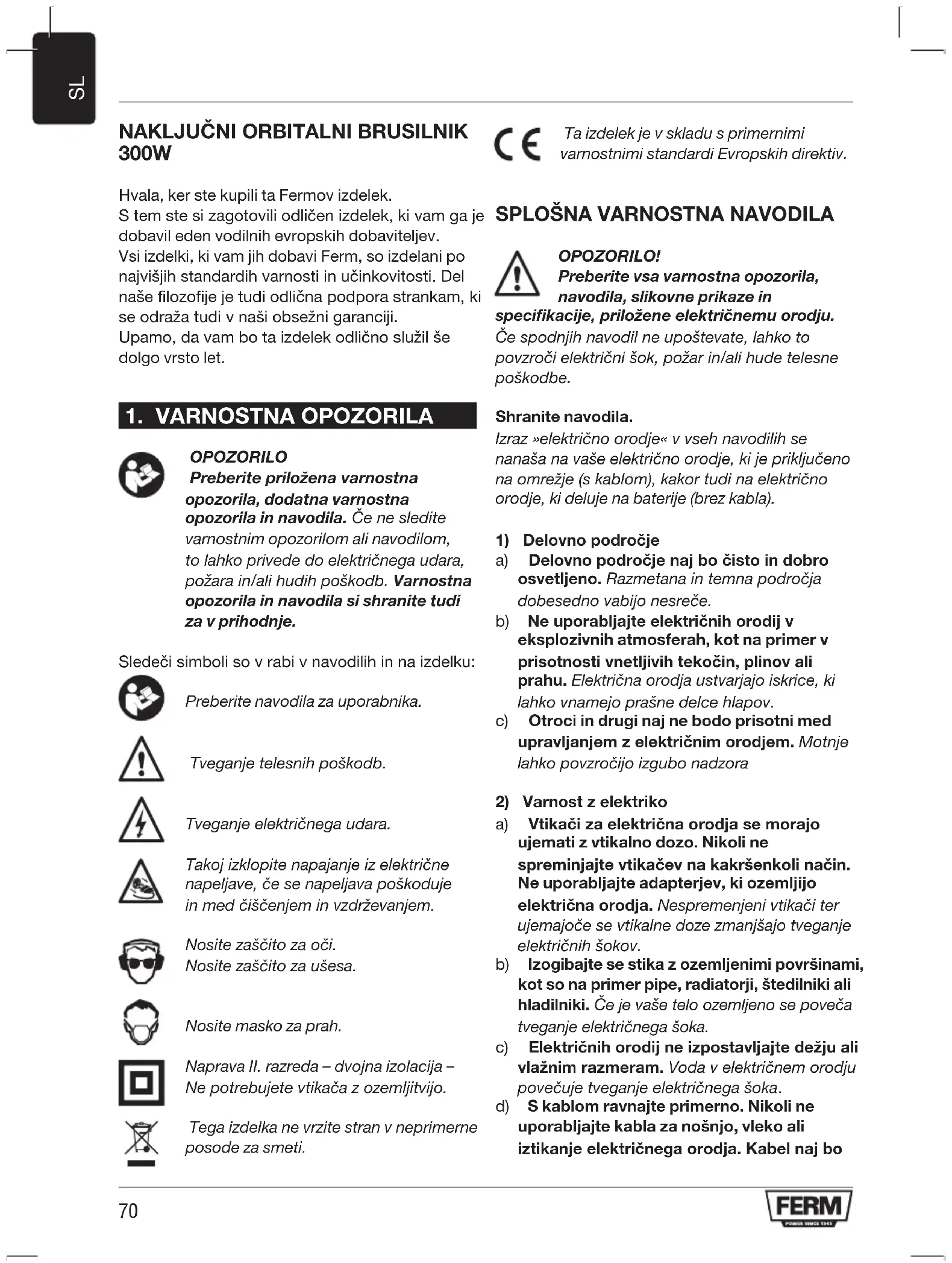 OPOZORILO Preberite priložena varnostna opozorila, dodatna varnostna opozorila in navodila. Če ne sledite varnostnim opozorilom ali navodilom, to lahko privede do električnega udara, požara in/ali hudih poškodb. Varnostna opozorila in navodila si shranite tudi za v prihodnje. Sledeči simboli so v rabi v navodilih in na izdelku: Preberite navodila za uporabnika. Tveganje telesnih poškodb. Tveganje električnega udara. Takoj izklopite napajanje iz električne napeljave, če se napeljava poškoduje in med čiščenjem in vzdrževanjem. Nosite zaščito za oči. Nosite zaščito za ušesa. Nosite masko za prah. Naprava II. razreda – dvojna izolacija – Ne potrebujete vtikača z ozemljitvijo. Tega izdelka ne vrzite stran v neprimerne posode za smeti. Ta izdelek je v skladu s primernimi varnostnimi standardi Evropskih direktiv.