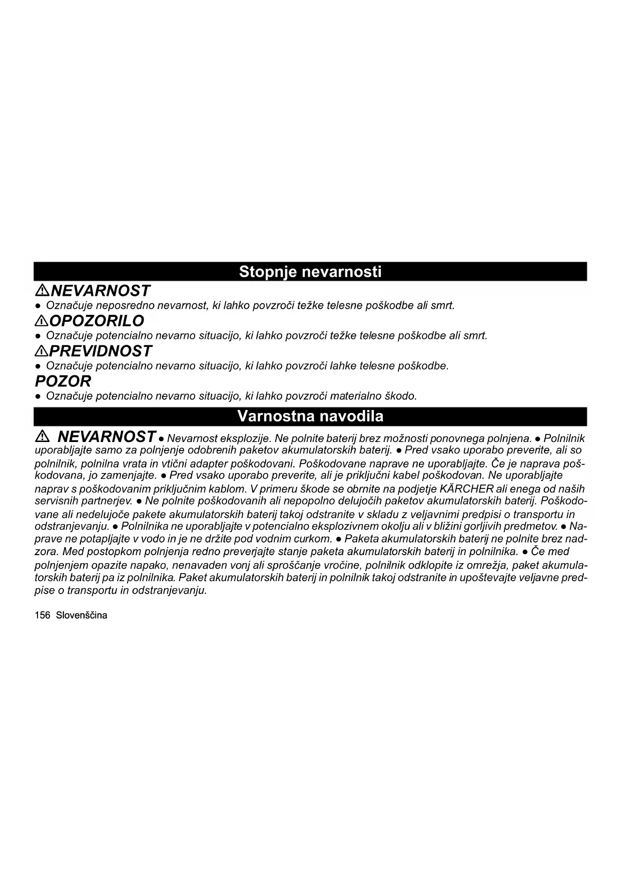 - Tehnični podatki 56 Slovenščina Stopnje nevarnosti NEVARNOST ● Označuje neposredno nevarnost, ki lahko povzroči težke telesne poškodbe ali smrt. 몇 OPOZORILO ● Označuje potencialno nevarno situacijo, ki lahko povzroči težke telesne poškodbe ali smrt. 몇 PREVIDNOST ● Označuje potencialno nevarno situacijo, ki lahko povzroči lahke telesne poškodbe. POZOR ● Označuje potencialno nevarno situacijo, ki lahko povzroči materialno škodo. Varnostna navodila NEVARNOST ● Nevarnost eksplozije. Ne polnite baterij brez možnosti ponovnega polnjena. ● Polnilnik uporabljajte samo za polnjenje odobrenih paketov akumulatorskih baterij. ● Pred vsako uporabo preverite, ali so polnilnik, polnilna vrata in vtični adapter poškodovani. Poškodovane naprave ne uporabljajte. Če je naprava poš- kodovana, jo zamenjajte. ● Pred vsako uporabo preverite, ali je priključni kabel poškodovan. Ne uporabljajte naprav s poškodovanim priključnim kablom. V primeru škode se obrnite na podjetje KÄRCHER ali enega od naših servisnih partnerjev. ● Ne polnite poškodovanih ali nepopolno delujočih paketov akumulatorskih baterij. Poškodo- vane ali nedelujoče pakete akumulatorskih baterij takoj odstranite v skladu z veljavnimi predpisi o transportu in odstranjevanju. ● Polnilnika ne uporabljajte v potencialno eksplozivnem okolju ali v bližini gorljivih predmetov. ● Na- prave ne potapljajte v vodo in je ne držite pod vodnim curkom. ● Paketa akumulatorskih baterij ne polnite brez nad- zora. Med postopkom polnjenja redno preverjajte stanje paketa akumulatorskih baterij in polnilnika. ● Če med polnjenjem opazite napako, nenavaden vonj ali sproščanje vročine, polnilnik odklopite iz omrežja, paket akumula- torskih baterij pa iz polnilnika. Paket akumulatorskih baterij in polnilnik takoj odstranite in upoštevajte veljavne pred- pise o transportu in odstranjevanju.Slovenščina 157 몇 OPOZORILO ● Preverite združljivost napetosti omrežja z napetostjo, navedeno na tipski ploščici napra- ve. ● Priključni kabel in vtični adapter zaščitite pred vročino, ostrimi robovi, oljem in premikajočimi se deli naprave. ● Polnilnika ne odpirajte. Popravila naj izvajajo samo strokovnjaki. ● Pred čiščenjem polnilnika ali izvajanjem upo- rabniških vzdrževalnih del izvlecite vtični adapter iz električne vtičnice. ● Osebe z zmanjšanimi telesnimi, čutnimi ali duševnimi sposobnostmi oziroma s pomanjkljivimi izkušnjami in znanjem smejo uporabljati napravo samo pod ustreznim nadzorom ali če so jih osebe, pristojne za njihovo varnost, poučile o varni uporabi naprave in če razu- mejo potencialne nevarnosti. ● Otroci se ne smejo igrati z napravo. ● Otrokom preprečite igro z napravo. ● Otroci od starosti najmanj 8 let naprej smejo uporabljati napravo, če jih je oseba, pristojna za njihovo varnost, poučila o uporabi ali jih med uporabo pravilno nadzoruje in če razumejo potencialne nevarnosti. ● Otrokom je čiščenje z na- pravo in vzdrževanje naprave dovoljeno samo pod nadzorom. 몇 PREVIDNOST ● Naprave ne priključite na podaljševalni kabel z več vtičnicami skupaj z drugimi napra- vami. ● Vtičnega adapterja ne vlecite za priključni kabel. ● Ne uporabljajte mokrega ali umazanega polnilnika. ● Mokrega ali umazanega paketa akumulatorskih baterij ne postavljajte na polnilna vrata polnilnika. ● Polnilnika ne uporabljajte v prašnem okolju. POZOR ● Nevarnost kratkega stika. Zaščitite polnilne stike pred kovinskimi deli. ● Polnilnika med obratovanjem nikoli ne prekrivajte. ● Polnilnika ne prenašajte tako, da ga držite za priključni kabel. ● Polnilnik uporabljajte samo v suhih notranjih prostorih z nizko vlažnostjo zraka. Namenska uporaba 몇 PREVIDNOST Nevarnost eksplozije! Telesne poškodbe in materialna škoda zaradi eksplozije paketa akumulatorskih baterij. Ne polnite pokvarjenih ali nepopolno delujočih paketov akumulatorskih baterij. Predelave ali spremembe, ki jih ni odobril proizvajalec, so prepovedane.158 Slovenščina Vsaka druga uporaba je nedovoljena. Za nevarnosti, ki nastanejo zaradi nedovoljene uporabe, odgovarja uporab- nik. Polnite samo pakete akumulatorskih baterij sistemov KÄRCHER Battery Power 4 V. Napotek Ustrezni paketi akumulatorskih baterij so označeni s simbolom BP 4 V. Podatke o napetosti najdete na napravi, na paketu akumulatorskih baterij in na njunima tipskima ploščicama. Varovanje okolja Materiali embalaže se lahko reciklirajo. Embalažo odstranite na okolju varen način. Električne in elektronske naprave vsebujejo dragocene materiale z možnostjo recikliranja, pogosto pa tudi sestavne dele, kot so baterije, akumulatorske baterije ali olja, ki lahko pri napačni uporabi ali napačnem odstranjevanju škodujejo zdravju ljudi in okolju. Navedeni sestavni deli so kljub temu potrebni za pravilno delovanje naprave. Naprave, označene s tem simbolom, ne smete odvreči med gospodinjske odpadke. Napotki o sestavinah (REACH) Aktualne informacije najdete na spletnem naslovu: www.kaercher.com/REACH Pribor in nadomestni deli Uporabljajte samo originalni pribor in originalne nadomestne dele, ki zagotavljajo varno in nemoteno delovanje na- prave. Informacije o priboru in nadomestnih delih najdete na spletnem naslovu www.kaercher.com.Slovenščina 159 Garancija V vsaki državi veljajo garancijski pogoji, ki jih je izdala naša pristojna prodajna družba. V garancijskem roku bodo morebitne motnje v delovanju naprave odpravljene brezplačno, če je njihov vzrok napaka v materialu ali napaka pri proizvodnji. Pri uveljavljenju garancije zagotovite dokazilo o nakupu in stopite v stik s prodajalcem ali z najbližjo servisno službo. Naslov najdete na hrbtni strani. Simboli na napravi Simboli na polnilniku Opis naprave Slika A 1 Vtični adapter 2 Priključni kabel 3 Polnilnik Napravo zaščitite pred vlago. Napravo hranite na suhem. Naprave ne pustite na dežju. Na- prava je primerna samo za uporabo v notranjih prostorih. 