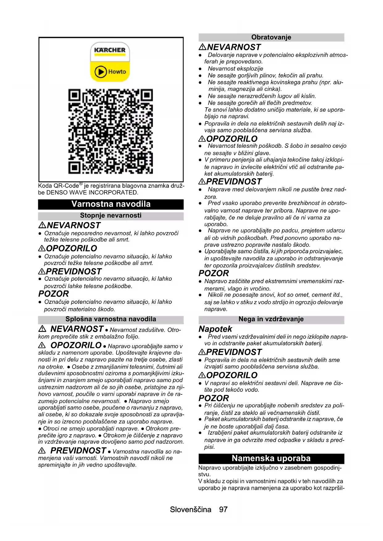 je registrirana blagovna znamka druž- be DENSO WAVE INCORPORATED. Varnostna navodila Stopnje nevarnosti NEVARNOST ● Označuje neposredno nevarnost, ki lahko povzroči težke telesne poškodbe ali smrt. 몇 OPOZORILO ● Označuje potencialno nevarno situacijo, ki lahko povzroči težke telesne poškodbe ali smrt. 몇 PREVIDNOST ● Označuje potencialno nevarno situacijo, ki lahko povzroči lahke telesne poškodbe. POZOR ● Označuje potencialno nevarno situacijo, ki lahko povzroči materialno škodo. Splošna varnostna navodila NEVARNOST ● Nevarnost zadušitve. Otro- kom preprečite stik z embalažno folijo. 몇 OPOZORILO ● Napravo uporabljajte samo v skladu z namenom uporabe. Upoštevajte krajevne da- nosti in pri delu z napravo pazite na tretje osebe, zlasti na otroke. ● Osebe z zmanjšanimi telesnimi, čutnimi ali duševnimi sposobnostmi oziroma s pomanjkljivimi izku- šnjami in znanjem smejo uporabljati napravo samo pod ustreznim nadzorom ali če so jih osebe, pristojne za nji- hovo varnost, poučile o varni uporabi naprave in če ra- zumejo potencialne nevarnosti. ● Napravo smejo uporabljati samo osebe, poučene o ravnanju z napravo, ali osebe, ki so dokazale svoje sposobnosti za upravlja- nje in so izrecno pooblaščene za uporabo naprave. ● Otroci ne smejo uporabljati naprave. ● Otrokom pre- prečite igro z napravo. ● Otrokom je čiščenje z napravo in vzdrževanje naprave dovoljeno samo pod nadzorom. 몇 PREVIDNOST ● Varnostna navodila so na- menjena vaši varnosti. Varnostnih navodil nikoli ne spreminjajte in jih vedno upoštevajte. Obratovanje NEVARNOST ● Delovanje naprave v potencialno eksplozivnih atmos- ferah je prepovedano. ● Nevarnost eksplozije ● Ne sesajte gorljivih plinov, tekočin ali prahu. ● Ne sesajte reaktivnega kovinskega prahu (npr. alu- minija, magnezija ali cinka). ● Ne sesajte nerazredčenih lugov ali kislin. ● Ne sesajte gorečih ali tlečih predmetov. Te snovi lahko dodatno uničijo materiale, ki se upora- bljajo na napravi. ● Popravila in dela na električnih sestavnih delih naj iz- vaja samo pooblaščena servisna služba. 몇 OPOZORILO ● Nevarnost telesnih poškodb. S šobo in sesalno cevjo ne sesajte v bližini glave. ● V primeru penjenja ali uhajanja tekočine takoj izklopi- te napravo in izvlecite električni vtič ali odstranite pa- ket akumulatorskih baterij. 몇 PREVIDNOST ● Naprave med delovanjem nikoli ne pustite brez nad- zora. ● Pred vsako uporabo preverite brezhibnost in obrato- valno varnost naprave ter pribora. Naprave ne upo- rabljajte, če ne deluje pravilno ali če ni varna za uporabo. ● Naprave ne uporabljajte po padcu, prejetem udarcu ali ob vidnih poškodbah. Pred ponovno uporabo na- prave ustrezno popravite nastalo škodo. ● Uporabljajte samo čistila, ki jih priporoča proizvajalec, in upoštevajte navodila za uporabo in odstranjevanje ter opozorila proizvajalcev čistilnih sredstev. POZOR ● Napravo zaščitite pred ekstremnimi vremenskimi raz- merami, vlago in vročino. ● Nikoli ne posesajte snovi, kot so omet, cement itd., saj se lahko v stiku z vodo strdijo in ogrozijo delovanje naprave. Nega in vzdrževanje Napotek ● Pred vsemi vzdrževalnimi deli in nego izklopite napra- vo in odstranite paket akumulatorskih baterij. 몇 PREVIDNOST ● Popravila in dela na električnih sestavnih delih sme izvajat i samo pooblaščena servisna služba. 몇 OPOZORILO ● V napravi so električni sestavni deli. Naprave ne čis- tite pod tekočo vodo. POZOR ● Pri čiščenju ne uporabljajte nobenih sredstev za poli- ranje, čistil za steklo ali večnamenskih čistil. ● Paket akumulatorskih baterij odstranite iz naprave, če je ne boste uporabljali dalj časa. ● Izrabljeni paket akumulatorskih baterij odstranite iz naprave in ga odvrzite med odpadke v skladu s pred- pisi. Namenska uporaba Napravo uporabljajte izključno v zasebnem gospodinj- stvu. V skladu z opisi in varnostnimi napotki v teh navodilih za uporabo je naprava namenjena za uporabo kot razpršil-98 Slovenščina no čistilo za čiščenje notranjosti avtomobilov in tekstila v notranjih prostorih. Za delovanje sta potrebna paket akumulatorskih baterij platforme KÄRCHER Battery Power (+) z nazivno nape- tostjo 18 V in ustrezen polnilnik KÄRCHER z nazivno napetostjo 18 V, ki nista v obsegu dobave. Paketi akumulatorskih baterij in polnilniki, ki niso v ob- segu dobave ali so dodatno potrebni, so dobavljivi kot dodatna oprema. Zaščita okolja Pakirni material je mogoče reciklirati. Embalažo odstranite na okolju varen način. Električne in elektronske naprave vsebujejo dra- gocene materiale z možnostjo recikliranja, pogos- to pa tudi sestavne dele, kot so baterije, akumulatorske baterije ali olja, ki lahko pri napač- ni uporabi ali napačnem odstranjevanju škodujejo zdravju ljudi in okolju. Navedeni sestavni deli so kljub te- mu potrebni za pravilno delovanje naprave. Naprav, označenih s tem simbolom, ne smete odvreči med go- spodinjske odpadke. Napotki o sestavinah (REACH) Aktualne informacije najdete na spletnem naslovu: www.kaercher.de/REACH Servisna služba V primeru vprašanj ali motenj v delovanju vam z vese- ljem pomaga naša podružnica KÄRCHER. Pribor in nadomestni deli Uporabljajte samo originalni pribor in originalne nado- mestne dele, ki zagotavljajo varno in nemoteno delova- nje naprave. Informacije o priboru in nadomestnih delih najdete na spletnem naslovu www.kaercher.com. Obseg dobave Obseg dobave je upodobljen na embalaži. Pri odstra- njevanju embalaže preverite, ali je vsebina popolna. Če manjka pribor ali če so med transportom nastale po- škodbe, obvestite prodajalca. Garancija V vsaki državi veljajo garancijski pogoji, ki jih je izdala naša pristojna prodajna družba. V garancijskem roku bodo morebitne motnje v delovanju naprave odpravlje- ne brezplačno, če je njihov vzrok napaka v materialu ali napaka v izdelavi. Pri uveljavljanju garancije zagotovite dokazilo o nakupu in stopite v stik s proda