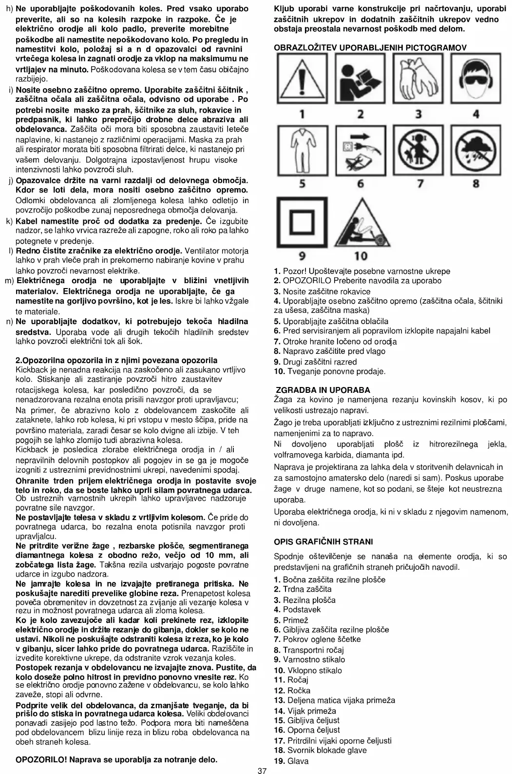zaščitna očala ali zaščitna očala, odvisno od uporabe . Po potrebi nosite masko za prah, ščitnike za sluh, rokavice in predpasnik, ki lahko preprečijo drobne delce abraziva ali obdelovanca. Zaščita oči mora biti sposobna zaustaviti leteče naplavine, ki nastanejo z različnimi operacijami. Maska za prah ali respirator morata biti sposobna filtrirati delce, ki nastanejo pri vašem delovanju. Dolgotrajna izpostavljenost hrupu visoke intenzivnosti lahko povzroči sluh. j) Opazovalce držite na varni razdalji od delovnega območja. Kdor se loti dela, mora nositi osebno zaščitno opremo. Odlomki obdelovanca ali zlomljenega kolesa lahko odletijo in povzročijo poškodbe zunaj neposrednega območja delovanja. k) Kabel namestite proč od dodatka za predenje. Če izgubite nadzor, se lahko vrvica razreže ali zapogne, roko ali roko pa lahko potegnete v predenje. l) Redno čistite zračnike za električno orodje. Ventilator motorja lahko v prah vleče prah in prekomerno nabiranje kovine v prahu lahko povzroči nevarnost elektrike. m) Električnega orodja ne uporabljajte v bližini vnetljivih materialov. Električnega orodja ne uporabljajte, če ga namestite na gorljivo površino, kot je les. Iskre bi lahko vžgale te materiale. n) Ne uporabljajte dodatkov, ki potrebujejo tekoča hladilna sredstva. Uporaba vode ali drugih tekočih hladilnih sredstev lahko povzroči električni tok ali šok. 2.Opozorilna opozorila in z njimi povezana opozorila Kickback je nenadna reakcija na zaskočeno ali zasukano vrtljivo kolo. Stiskanje ali zastiranje povzroči hitro zaustavitev rotacijskega kolesa, kar posledično povzroči, da se nenadzorovana rezalna enota prisili navzgor proti upravljavcu; Na primer, če abrazivno kolo z obdelovancem zaskočite ali zataknete, lahko rob kolesa, ki pri vstopu v mesto ščipa, pride na površino materiala, zaradi česar se kolo dvigne ali izbije. V teh pogojih se lahko zlomijo tudi abrazivna kolesa. Kickback je posledica zlorabe električnega orodja in / ali nepravilnih delovnih postopkov ali pogojev in se ga je mogoče izogniti z ustreznimi previdnostnimi ukrepi, navedenimi spodaj. Ohranite trden prijem električnega orodja in postavite svoje telo in roko, da se boste lahko uprli silam povratnega udarca. Ob ustreznih varnostnih ukrepih lahko upravljavec nadzoruje povratne sile navzgor. Ne postavljajte telesa v skladu z vrtljivim kolesom. Če pride do povratnega udarca, bo rezalna enota potisnila navzgor proti upravljalcu. Ne pritrdite verižne žage , rezbarske plošče, segmentiranega diamantnega kolesa z obodno režo, večjo od 10 mm, ali zobčatega lista žage. Takšna rezila ustvarjajo pogoste povratne udarce in izgubo nadzora. Ne jamrajte kolesa in ne izvajajte pretiranega pritiska. Ne poskušajte narediti prevelike globine reza. Prenapetost kolesa poveča obremenitev in dovzetnost za zvijanje ali vezanje kolesa v rezu in možnost povratnega udarca ali zloma kolesa. Ko je kolo zavezujoče ali kadar koli prekinete rez, izklopite električno orodje in držite rezanje do gibanja, dokler se kolo ne ustavi. Nikoli ne poskušajte odstraniti kolesa iz reza, ko je kolo v gibanju, sicer lahko pride do povratnega udarca. Raziščite in izvedite korektivne ukrepe, da odstranite vzrok vezanja koles. Postopek rezanja v obdelovancu ne izvajajte znova. Pustite, da kolo doseže polno hitrost in previdno ponovno vnesite rez. Ko se električno orodje ponovno zažene v obdelovancu, se kolo lahko zaveže, stopi ali odvrne. Podprite velik del obdelovanca, da zmanjšate tveganje, da bi prišlo do stiska in povratnega udarca kolesa. Veliki obdelovanci ponavadi zasijejo pod lastno težo. Podpora mora biti nameščena pod obdelovancem blizu linije reza in blizu roba obdelovanca na obeh straneh kolesa. OPOZORILO! Naprava se uporablja za notranje delo. Kljub uporabi varne konstrukcije pri načrtovanju, uporabi zaščitnih ukrepov in dodatnih zaščitnih ukrepov vedno obstaja preostala nevarnost poškodb med delom.