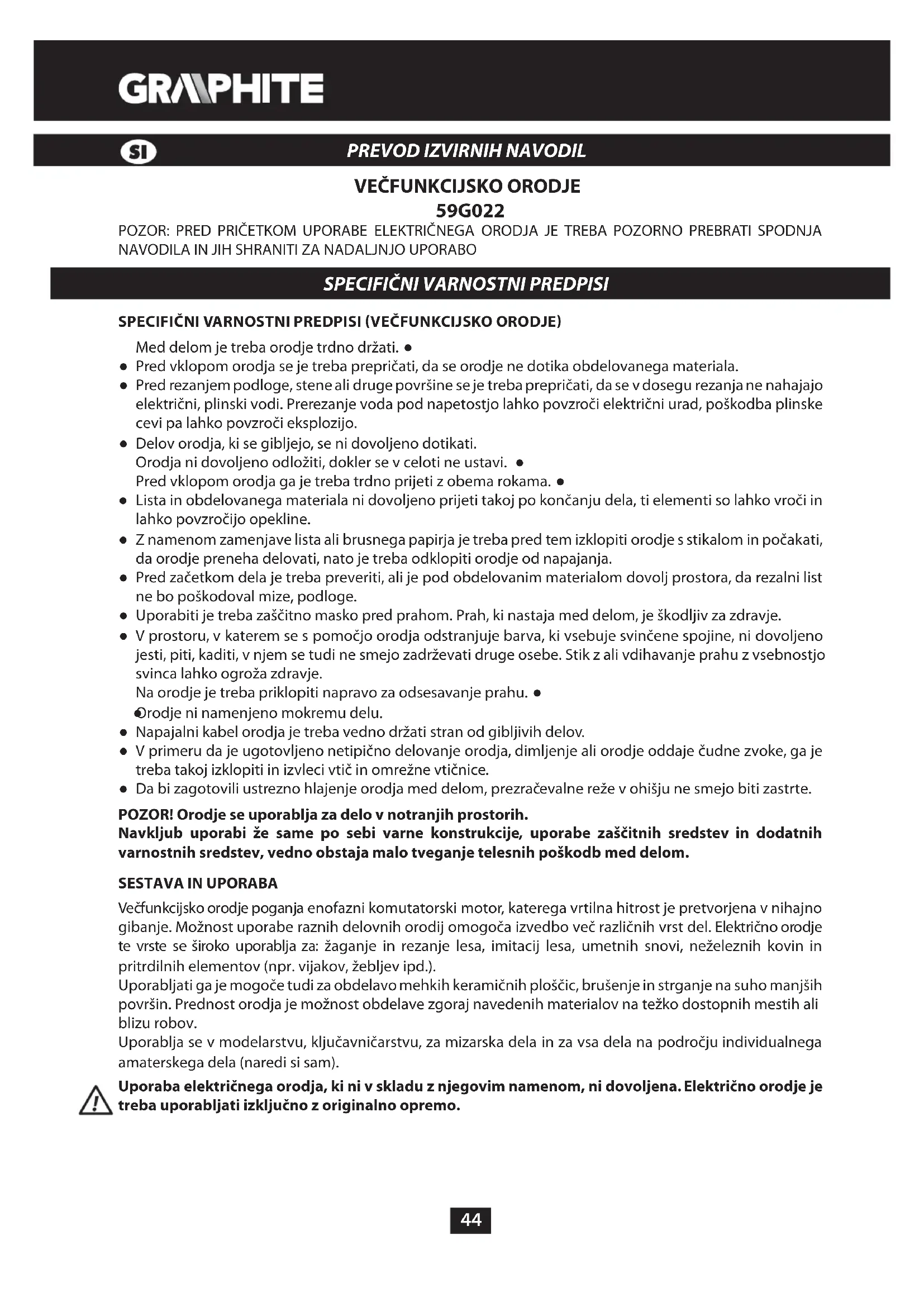 SPECIFIČNI VARNOSTNI PREDPISI VEČFUNKCIJSKO ORODJE Med delom je treba orodje trdno držati. ● Pred vklopom orodja se je treba prepričati, da se orodje ne dotika obdelovanega materiala. ● Pred rezanjem podloge, stene ali druge površine se je treba prepričati, da se v dosegu rezanja ne nahajajo ● električni, plinski vodi. Prerezanje voda pod napetostjo lahko povzroči električni urad, poškodba plinske cevi pa lahko povzroči eksplozijo. Delov orodja, ki se gibljejo, se ni dovoljeno dotikati. ● Orodja ni dovoljeno odložiti, dokler se v celoti ne ustavi. ● Pred vklopom orodja ga je treba trdno prijeti z obema rokama. ● Lista in obdelovanega materiala ni dovoljeno prijeti takoj po končanju dela, ti elementi so lahko vroči in ● lahko povzročijo opekline. Z namenom zamenjave lista ali brusnega papirja je treba pred tem izklopiti orodje s stikalom in počakati, ● da orodje preneha delovati, nato je treba odklopiti orodje od napajanja. Pred začetkom dela je treba preveriti, ali je pod obdelovanim materialom dovolj prostora, da rezalni list ● ne bo poškodoval mize, podloge. Uporabiti je treba zaščitno masko pred prahom. Prah, ki nastaja med delom, je škodljiv za zdravje. ● V prostoru, v katerem se s pomočjo orodja odstranjuje barva, ki vsebuje svinčene spojine, ni dovoljeno ● jesti, piti, kaditi, v njem se tudi ne smejo zadrževati druge osebe. Stik z ali vdihavanje prahu z vsebnostjo svinca lahko ogroža zdravje. Na orodje je treba priklopiti napravo za odsesavanje prahu. ● Orodje ni namenjeno mokremu delu. ● Napajalni kabel orodja je treba vedno držati stran od gibljivih delov. ● V primeru da je ugotovljeno netipično delovanje orodja, dimljenje ali orodje oddaje čudne zvoke, ga je ● treba takoj izklopiti in izvleci vtič in omrežne vtičnice. Da bi zagotovili ustrezno hlajenje orodja med delom, prezračevalne reže v ohišju ne smejo biti zastrte. ● POZOR! Orodje se uporablja za delo v notranjih prostorih. Navkljub uporabi že same po sebi varne konstrukcije, uporabe zaščitnih sredstev in dodatnih varnostnih sredstev, vedno obstaja malo tveganje telesnih poškodb med delom.