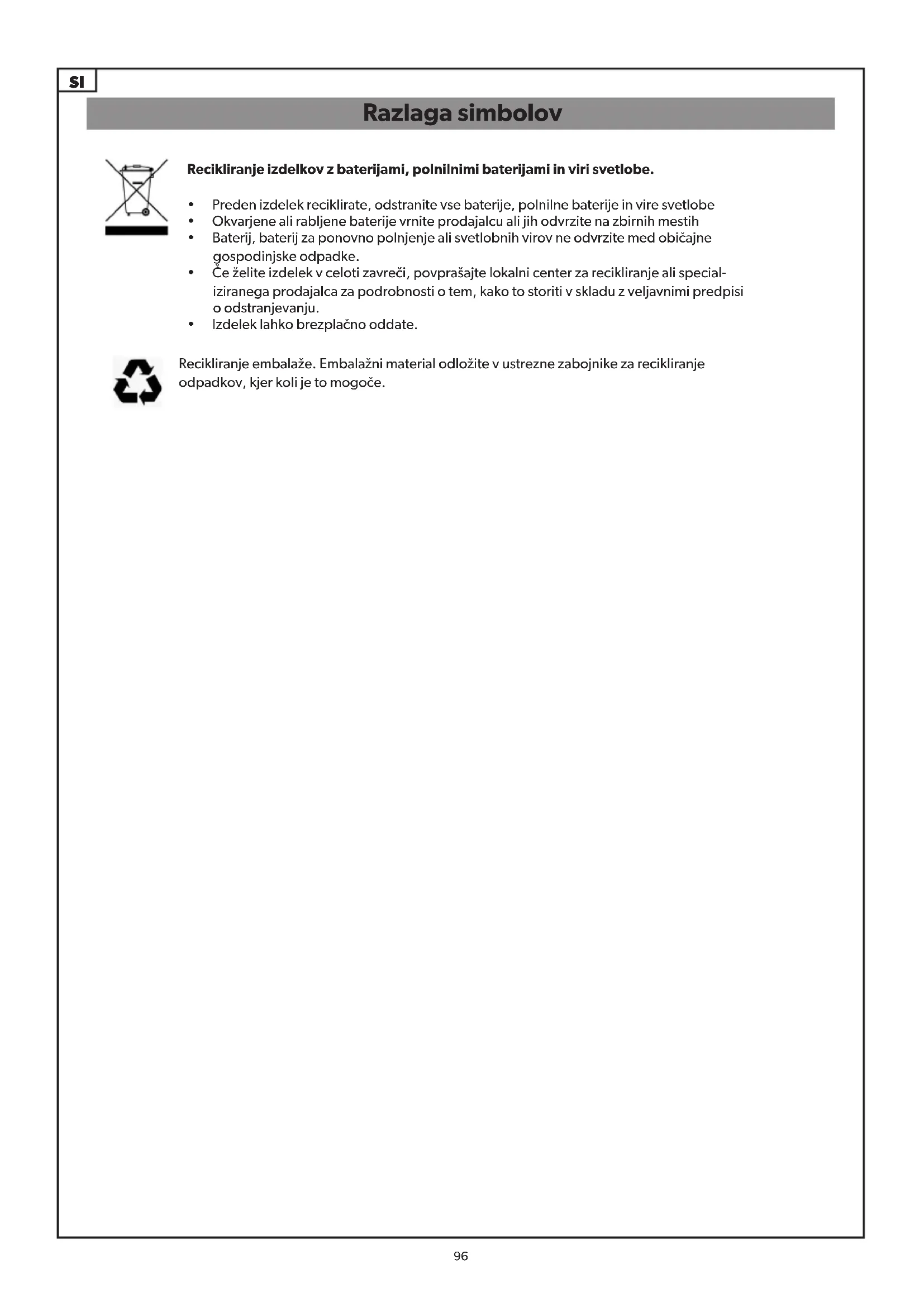 - Baterij, baterij za ponovno polnjenje ali svetlobnih virov ne odvrzite med običajne gospodinjske odpadke.