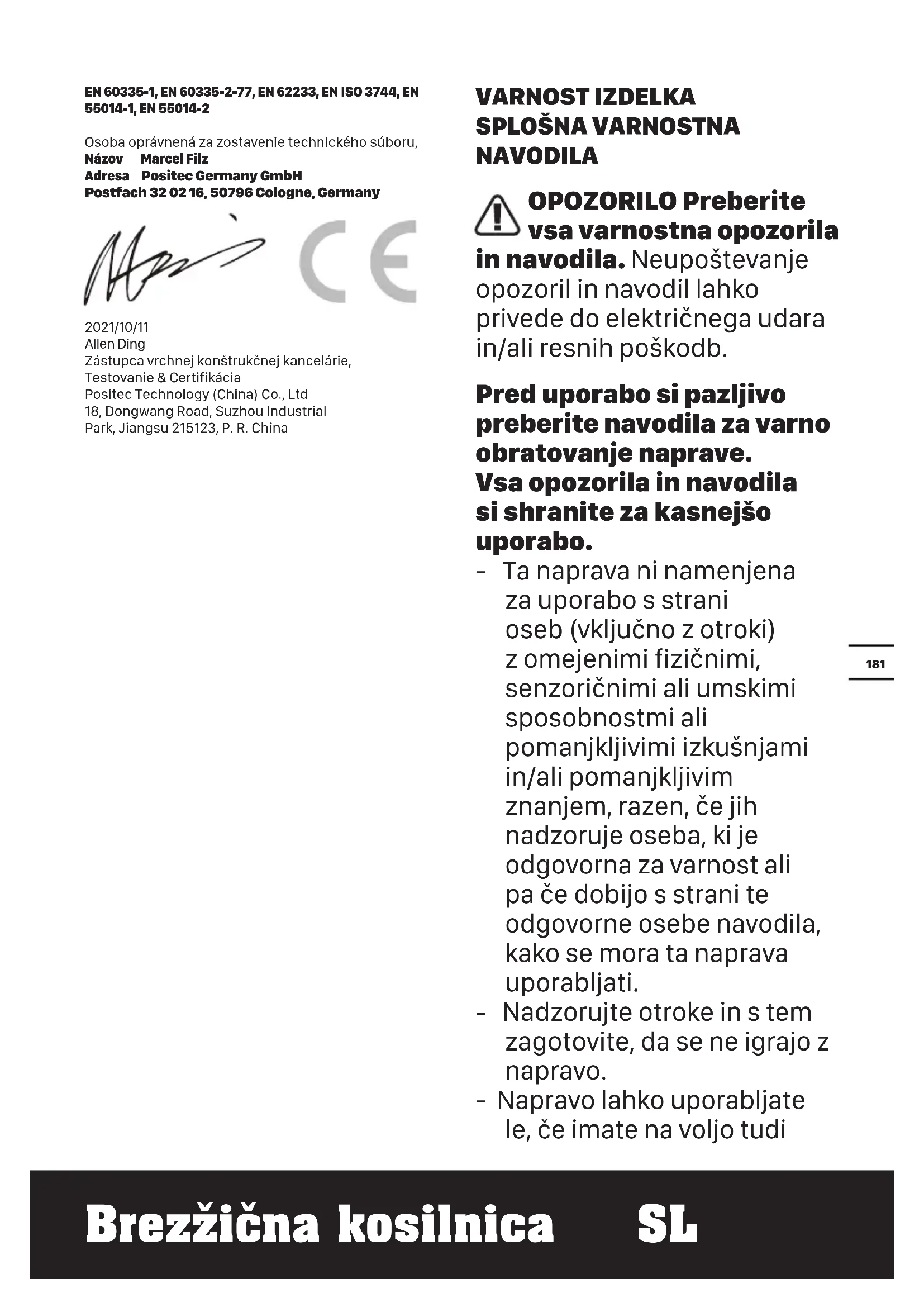 UPORABO Varna uporaba Usposabljanje a) Pazljivo preberite navodila. Pred uporabo naprave se temeljito seznanite s pravili za pravilno uporabo opreme; b) Nikoli ne dovolite otrokom ali osebam, ki niso seznanjene s temi navodili, da bi uporabljale kosilnico. Lokalni predpisi lahko tudi predpisujejo starost uporabnika naprave; c) Nikoli ne kosite, ko se v neposredni bližini nahajajo osebe, še posebej otroci ali domače živali; d) zavedajte se, da je za nezgode ali škodo, povzročeno na drugih osebah ali njihovi lastnini, odgovoren uporabnik ali lastnik. Priprava a) Pri košnji bodite vedno obuti v čvrsto obutev in imejte oblečene dolge hlače. Opreme ne uporabljajte bosi ali če imate obute odprte sandale; b) temeljito preglejte območje uporabe opreme in odstranite morebitne predmete, ki bi jih naprava med delovanjem lahko vrgla v zrak; c) Pred pričetkom uporabe poglejte, ali so morda obrabljeni ali poškodovani noži, vijaki nožev ali rezilni skop. Da bi preprečili neuravnoteženost, morate obrabljene ali poškodovane nože ter vijake nožev zamenjati le v celotnem setu; Zamenjajte poškodovane ali nečitljive oznake. Delovanje a) Kosite le pri dnevni svetlobi ali dobri umetni svetlobi.; b) Po možnosti ne uporabljajte vrtnega orodja, ko je trava mokra.; c) Na poševnih površinah ali na mokri travi pazite na varno hojo; d) Vedno hodite mirno, nikoli ne tekajte; e) Za rotacijske naprave s kolesi. Na poševnih površinah kosite vedno183 %UH]çLĀQDNRVLOQLFD 6/ v smeri prečno in nikoli navzgor in navzdol; f) Bodite zelo previdni pri spremembi smeri na pobočjih; g) Ne kosite tam, kjer so pobočja zelo strma; h) Kadar s kosilnico kosite vzvratno ali jo vlečete proti sebi, bodite še posebej pozorni;