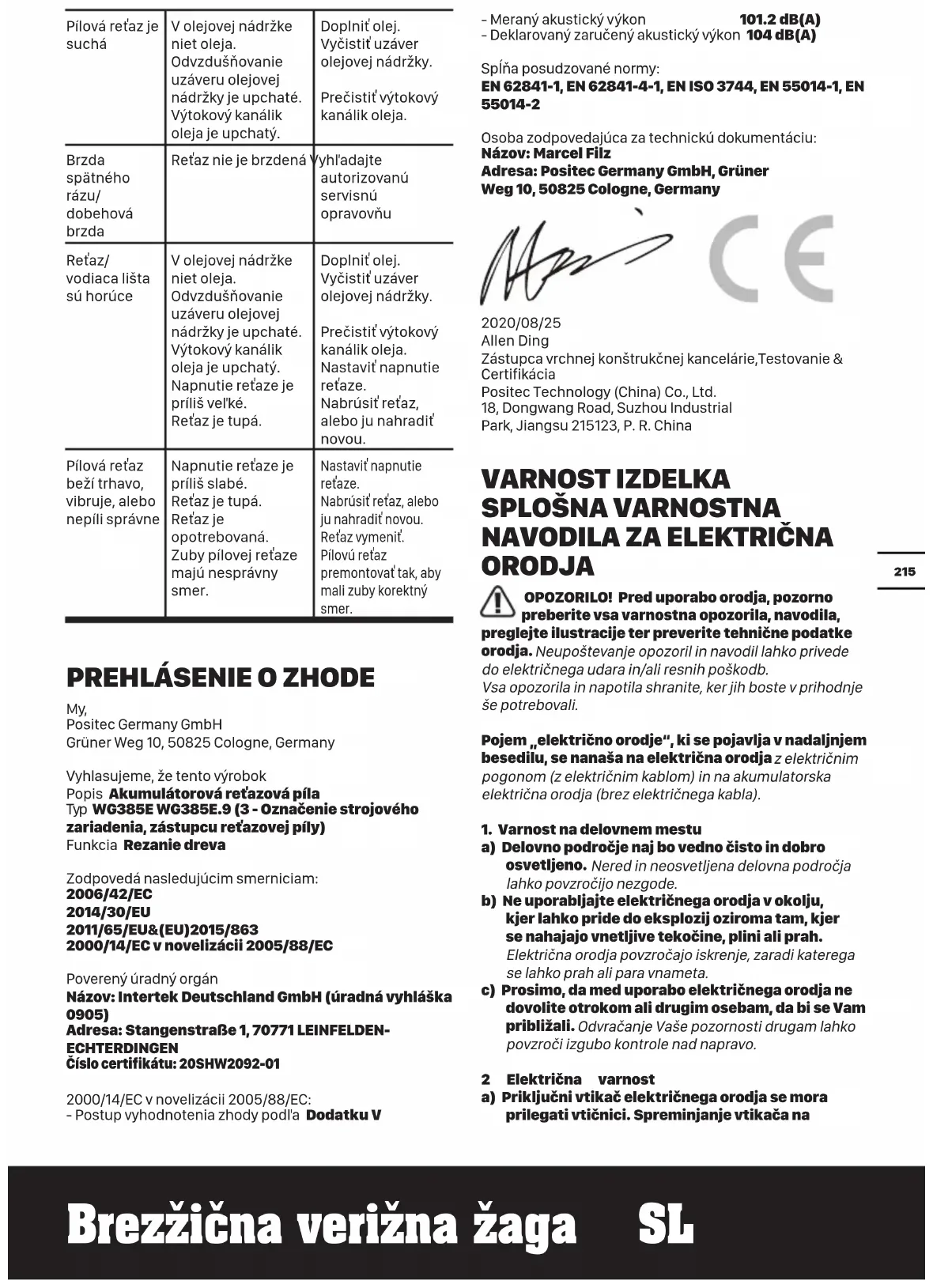 ORODJA OPOZORILO! Pred uporabo orodja, pozorno preberite vsa varnostna opozorila, navodila, preglejte ilustracije ter preverite tehnične podatke orodja. Neupoštevanje opozoril in navodil lahko privede do električnega udara in/ali resnih poškodb. Vsa opozorila in napotila shranite, ker jih boste v prihodnje še potrebovali. Pojem „električno orodje“, ki se pojavlja v nadaljnjem besedilu, se nanaša na električna orodja z električnim pogonom (z električnim kablom) in na akumulatorska električna orodja (brez električnega kabla).