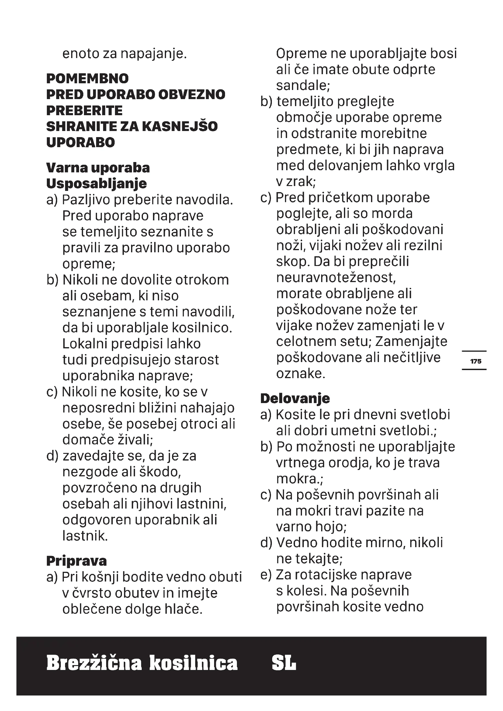 UPORABO Varna uporaba Usposabljanje a) Pazljivo preberite navodila. Pred uporabo naprave se temeljito seznanite s pravili za pravilno uporabo opreme; b) Nikoli ne dovolite otrokom ali osebam, ki niso seznanjene s temi navodili, da bi uporabljale kosilnico. Lokalni predpisi lahko tudi predpisujejo starost uporabnika naprave; c) Nikoli ne kosite, ko se v neposredni bližini nahajajo osebe, še posebej otroci ali domače živali; d) zavedajte se, da je za nezgode ali škodo, povzročeno na drugih osebah ali njihovi lastnini, odgovoren uporabnik ali lastnik. Priprava a) Pri košnji bodite vedno obuti v čvrsto obutev in imejte oblečene dolge hlače. Opreme ne uporabljajte bosi ali če imate obute odprte sandale; b) temeljito preglejte območje uporabe opreme in odstranite morebitne predmete, ki bi jih naprava med delovanjem lahko vrgla v zrak; c) Pred pričetkom uporabe poglejte, ali so morda obrabljeni ali poškodovani noži, vijaki nožev ali rezilni skop. Da bi preprečili neuravnoteženost, morate obrabljene ali poškodovane nože ter vijake nožev zamenjati le v celotnem setu; Zamenjajte poškodovane ali nečitljive oznake. Delovanje a) Kosite le pri dnevni svetlobi ali dobri umetni svetlobi.; b) Po možnosti ne uporabljajte vrtnega orodja, ko je trava mokra.; c) Na poševnih površinah ali na mokri travi pazite na varno hojo; d) Vedno hodite mirno, nikoli ne tekajte; e) Za rotacijske naprave s kolesi. Na poševnih površinah kosite vedno176 %UH]çLĀQDNRVLOQLFD 6/ v smeri prečno in nikoli navzgor in navzdol; f) Bodite zelo previdni pri spremembi smeri na pobočjih; g) Ne kosite tam, kjer so pobočja zelo strma; h) Kadar s kosilnico kosite vzvratno ali jo vlečete proti sebi, bodite še posebej pozorni;