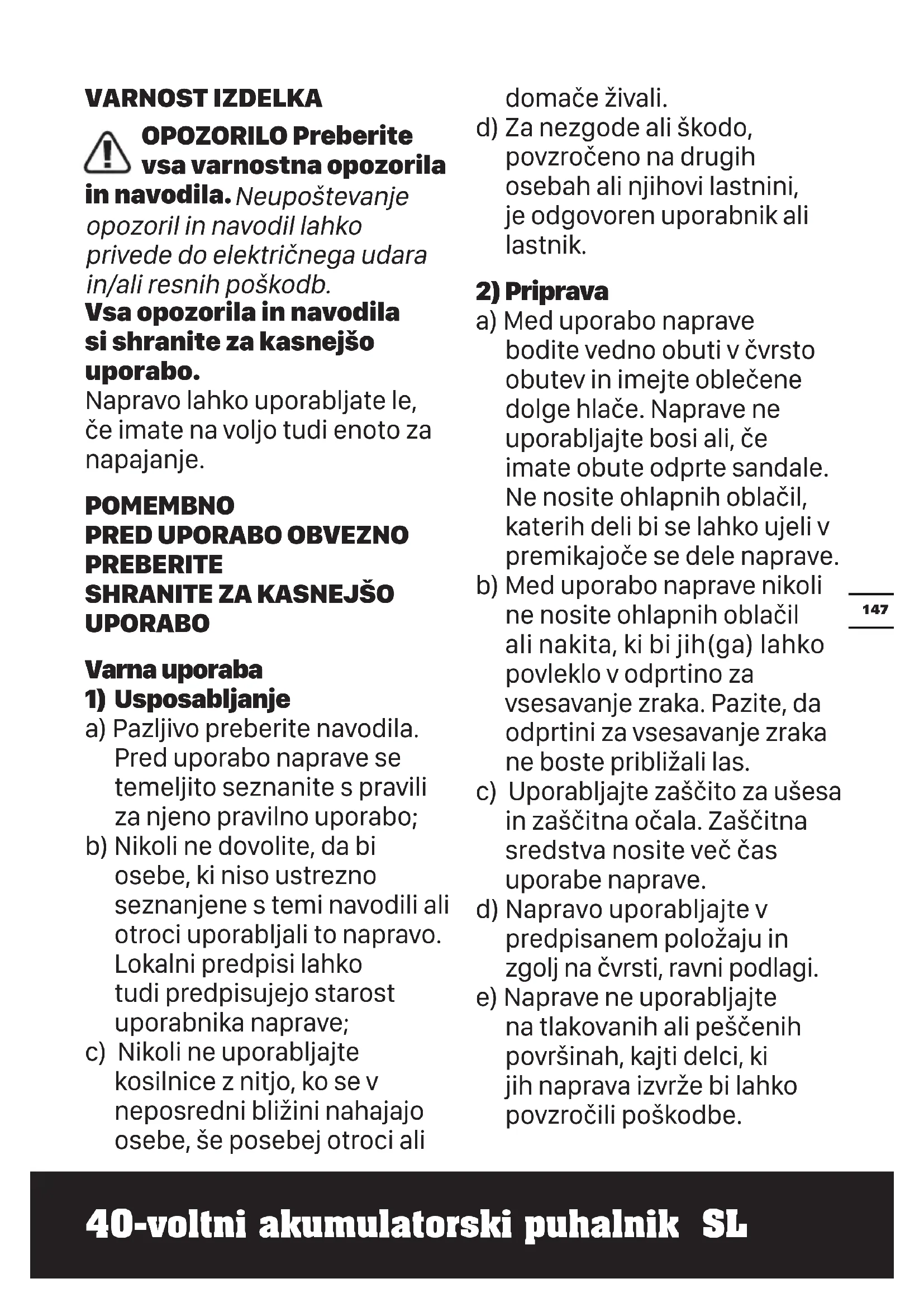 a) Med uporabo naprave bodite vedno obuti v čvrsto obutev in imejte oblečene dolge hlače. Naprave ne uporabljajte bosi ali, če imate obute odprte sandale. Ne nosite ohlapnih oblačil, katerih deli bi se lahko ujeli v premikajoče se dele naprave. b) Med uporabo naprave nikoli ne nosite ohlapnih oblačil ali nakita, ki bi jih(ga) lahko povleklo v odprtino za vsesavanje zraka. Pazite, da odprtini za vsesavanje zraka ne boste približali las. c) Uporabljajte zaščito za ušesa in zaščitna očala. Zaščitna sredstva nosite več čas uporabe naprave. d) Napravo uporabljajte v predpisanem položaju in zgolj na čvrsti, ravni podlagi. e) Naprave ne uporabljajte na tlakovanih ali peščenih površinah, kajti delci, ki jih naprava izvrže bi lahko povzročili poškodbe.148 40-voltni akumulatorski puhalnik SL f) Napravo pred uporabo vedno vizualno preglejte in preverite če so deli pritrdila dobro pričvrščena, ohišje v brezhibnem stanju, varovala in zastori pa na predpisanem mestu. Obrabljene ali poškodovane dele zamenjajte v kompletu in tako zagotovite ustrezno uravnoteženost naprave. Zamenjajte poškodovane ali nečitljive oznake.