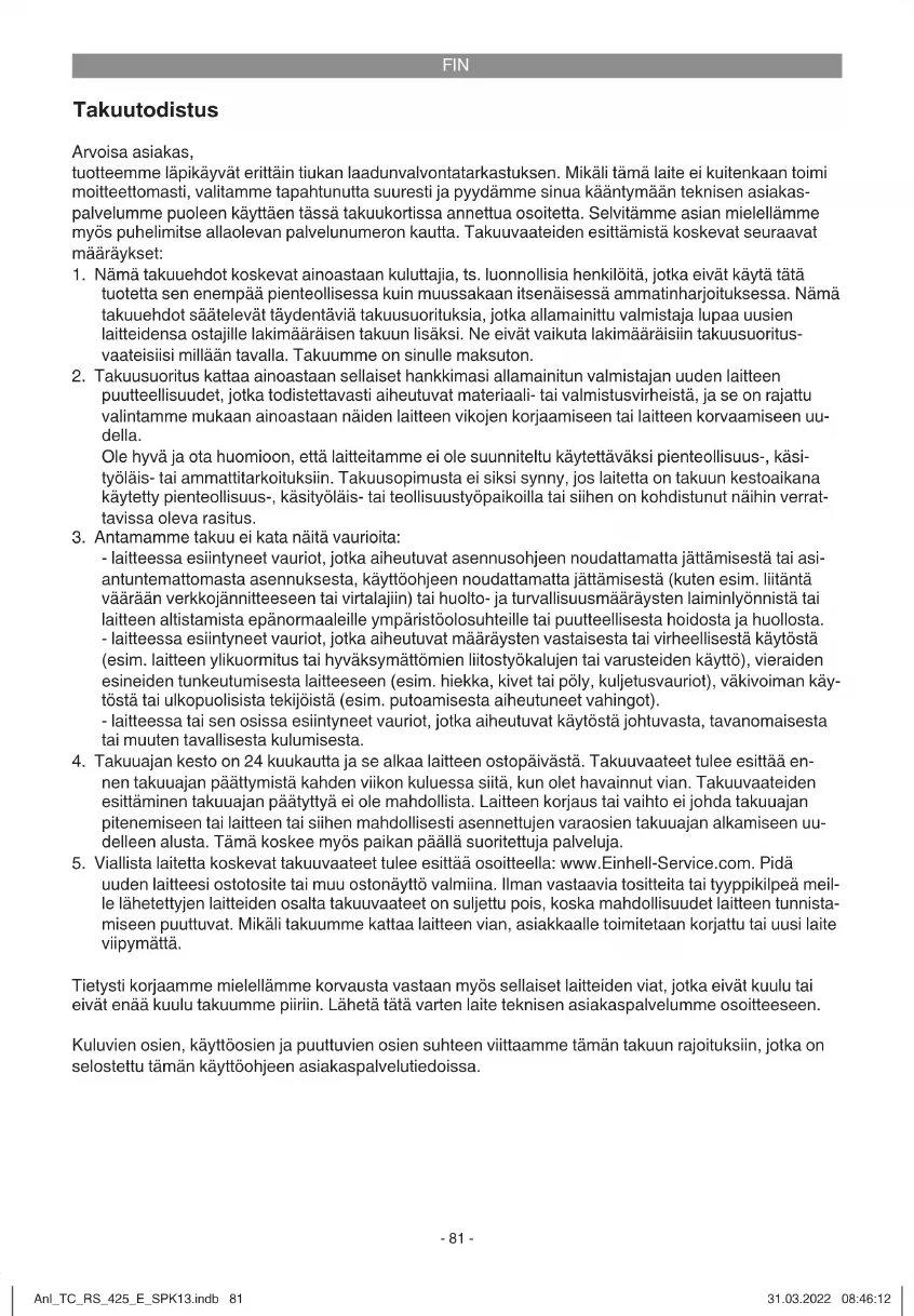 Brezplačno poiščite navodila za napravo TCRS 425 E EINHELL v formatu PDF.