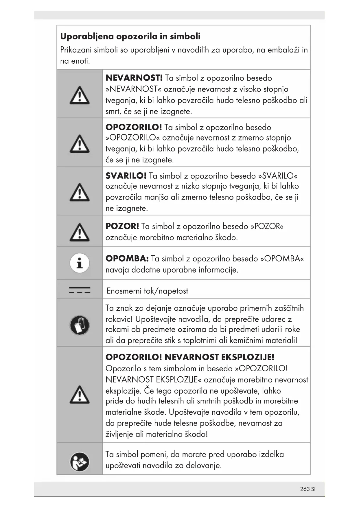 je registrirana blagovna znamka družbe USB Implementers Forum, Inc. Blagovna znamka SilverCrest in trgovsko ime sta last njunih ustreznih lastnikov. Vsa druga imena in izdelki so blagovne znamke ali registrirane blagovne znamk njihovih ustreznih lastnikov. P Obseg dobave 2 x ročni radijski oddajnik/sprejemnik 1 x polnilno podnožje 1 x kabel USB (tip A do mikro USB) – samo za polnjenje265 SI 6 x AA Ni-MH polnilna baterija 2 x sponka za pas 1 x uporabniški priročnik Varnostna navodila Preden začnete izdelek uporabljati, se seznanite z vsemi navodili za uporabo in varnostnimi napotki! Če izdelek predate drugim osebam, jim izročite tudi vse dokumente! Izdelek pred vsako uporabo preglejte, saj okvarjenega ali poškodovanega izdelka ne smete uporabljati.