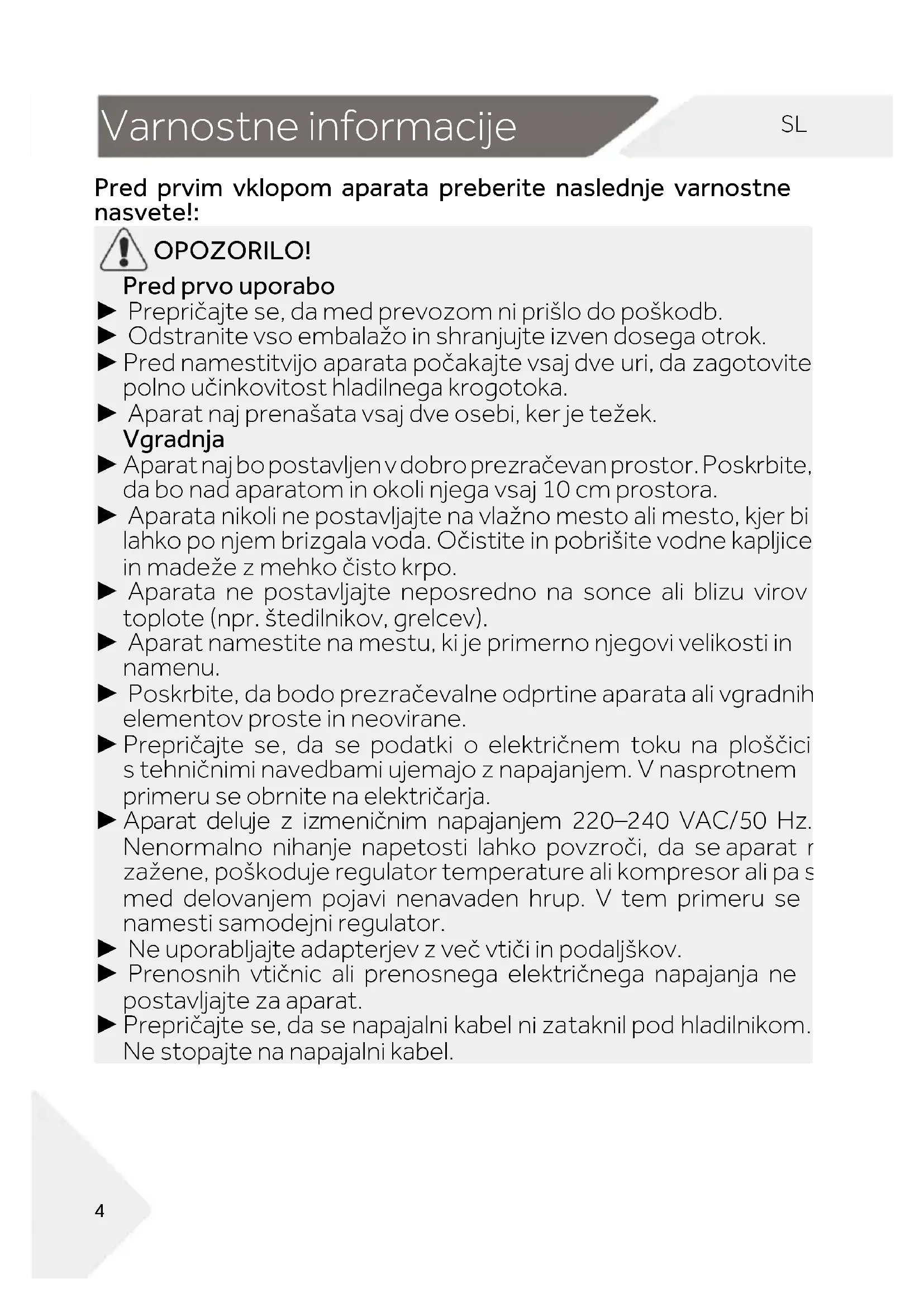 OPOZORILO! Pred prvo uporabo ► Prepričajte se, da med prevozom ni prišlo do poškodb. ► Odstranite vso embalažo in shranjujte izven dosega otrok. ► Pred namestitvijo aparata počakajte vsaj dve uri, da zagotovite polno učinkovitost hladilnega krogotoka. ► Aparat naj prenašata vsaj dve osebi, ker je težek. Vgradnja ► Aparat naj bo postavljen v dobro prezračevan prostor. Poskrbite, da bo nad aparatom in okoli njega vsaj 10 cm prostora. ► Aparata nikoli ne postavljajte na vlažno mesto ali mesto, kjer bi lahko po njem brizgala voda. Očistite in pobrišite vodne kapljice in madeže z mehko čisto krpo. ► Aparata ne postavljajte neposredno na sonce ali blizu virov toplote (npr. štedilnikov, grelcev). ► Aparat namestite na mestu, ki je primerno njegovi velikosti in namenu. ► Poskrbite, da bodo prezračevalne odprtine aparata ali vgradnih elementov proste in neovirane. ► Prepričajte se, da se podatki o električnem toku na ploščici s tehničnimi navedbami ujemajo z napajanjem. V nasprotnem primeru se obrnite na električarja. ► Aparat deluje z izmeničnim napajanjem 220–240 VAC/50 Hz. Nenormalno nihanje napetosti lahko povzroči, da se aparat ne zažene, poškoduje regulator temperature ali kompresor ali pa se med delovanjem pojavi nenavaden hrup. V tem primeru se namesti samodejni regulator. ► Ne uporabljajte adapterjev z več vtiči in podaljškov. ► Prenosnih vtičnic ali prenosnega električnega napajanja ne postavljajte za aparat. ► Prepričajte se, da se napajalni kabel ni zataknil pod hladilnikom. Ne stopajte na napajalni kabel.SL Varnostne informacije