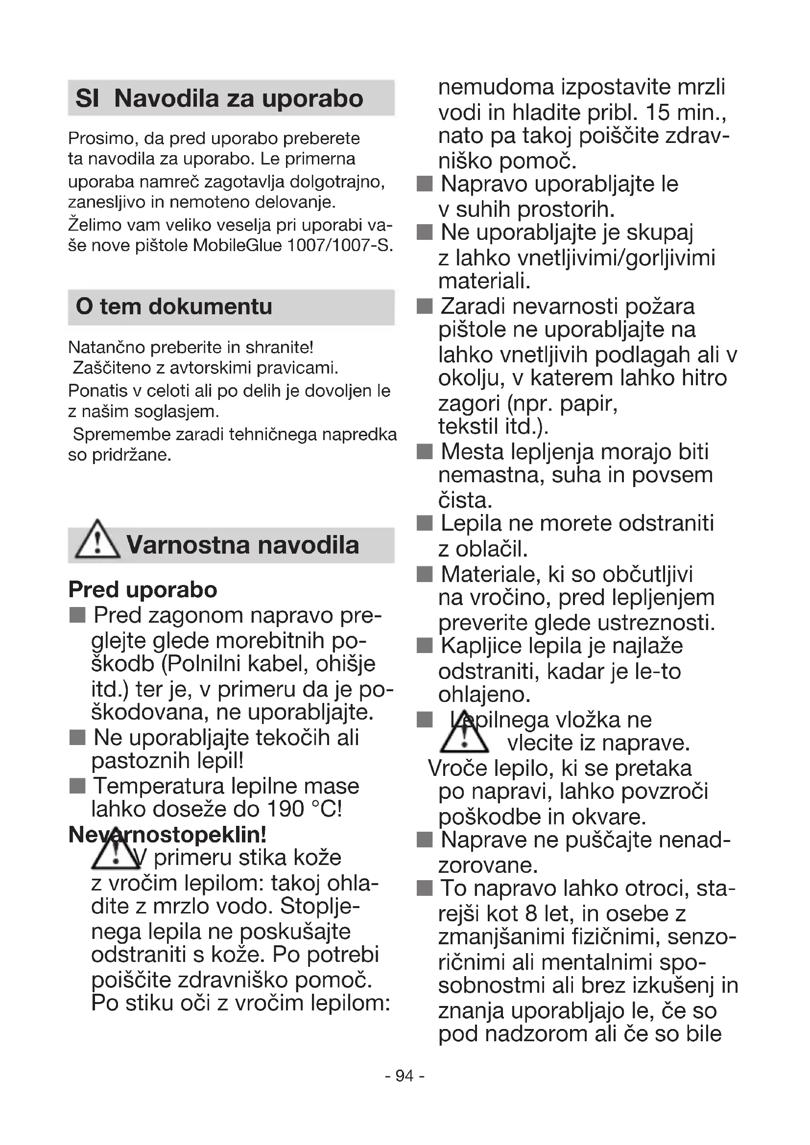GARANŢIA PRODUCĂTORULUI ANI GARANŢIA PRODUCĂTORULUI ANI GARANŢIA RO- 94 - SI Navodila za uporabo Prosimo, da pred uporabo preberete ta navodila za uporabo. Le primerna uporaba namreč zagotavlja dolgotrajno, zanesljivo in nemoteno delovanje. Želimo vam veliko veselja pri uporabi va- še nove pištole MobileGlue 1007/1007-S. O tem dokumentu Natančno preberite in shranite! Zaščiteno z avtorskimi pravicami. Ponatis v celoti ali po delih je dovoljen le z našim soglasjem. Spremembe zaradi tehničnega napredka so pridržane. Pred uporabo Pred zagonom napravo pre- glejte glede morebitnih po- škodb (Polnilni kabel, ohišje itd.) ter je, v primeru da je po- škodovana, ne uporabljajte. Ne uporabljajte tekočih ali pastoznih lepil! Temperatura lepilne mase lahko doseže do 190 °C! Nevarnost opeklin! V primeru stika kože z vročim lepilom: takoj ohla- dite z mrzlo vodo. Stoplje- nega lepila ne poskušajte odstraniti s kože. Po potrebi poiščite zdravniško pomoč. Po stiku oči z vročim lepilom: Varnostna navodila nemudoma izpostavite mrzli vodi in hladite pribl. 15 min., nato pa takoj poiščite zdrav- niško pomoč. Napravo uporabljajte le v suhih prostorih. Ne uporabljajte je skupaj z lahko vnetljivimi/gorljivimi materiali. Zaradi nevarnosti požara pištole ne uporabljajte na lahko vnetljivih podlagah ali v okolju, v katerem lahko hitro zagori (npr. papir, tekstil itd.). Mesta lepljenja morajo biti nemastna, suha in povsem čista. Lepila ne morete odstraniti z oblačil. Materiale, ki so občutljivi na vročino, pred lepljenjem preverite glede ustreznosti. Kapljice lepila je najlaže odstraniti, kadar je le-to ohlajeno. Lepilnega vložka ne vlecite iz naprave. Vroče lepilo, ki se pretaka po napravi, lahko povzroči poškodbe in okvare. Naprave ne puščajte nenad- zorovane. To napravo lahko otroci, sta- rejši kot 8 let, in osebe z zmanjšanimi fizičnimi, senzo- ričnimi ali mentalnimi spo- sobnostmi ali brez izkušenj in znanja uporabljajo le, če so pod nadzorom ali če so bile- 95 - poučene o varni uporabi na- prave in razumejo nevarnosti, ki izvirajo iz uporabe. Otroci se z napravo ne smejo igrati. Čiščenja in vzdrževa- nja, ki ga opravlja uporabnik, otroci ne smejo izvajati brez nadzora. Brezhibno delovanje boste zagotovili le z uporabo origi- nalnih lepilnih vložkov znam- ke STEINEL. Polnilni kabel USB Polnilni kabel naj bo čist. Zaradi umazanije obstaja ne- varnost električnega udara. Napravo shranjujte pri tem- peraturah med 0 °C in 35 °C. Napravo polnite samo s prilo- ženim polnilnim kablom USB (tip 15.3841). Ne polnite ba- terij drugih proizvajalcev. V nasprotnem primeru obstaja nevarnost požara in eksplo- zije. Akumulator Ne odpirajte ali razstavljajte akumulatorja in naprave. Pride lahko do kratkega sti- ka. Akumulatorja ne odstrani- te. Pri težavah se obrnite na prodajalca. Litij-ionsko baterijo lahko polnite kadarkoli, brez da bi s tem vplivali na njeno življenj- sko dobo. Prekinitev polnje- nja akumulatorju ne škodi. Če naprave dlje časa ne boste uporabljali, jo shranite Namenska uporaba To električno orodje je primerno le za lepljenje za gospodinjstva običajnih materialov za rokodelstvo in modelar- stvo z lepili, ki ne vsebujejo topil. z napolnjenim akumulator- jem. S tem boste podaljšali življenjsko dobo litij-ionske baterije. V primeru neustrezne upo- rabe ali poškodovanja aku- mulatorja lahko pride do uhajanja par ali elektrolitnih tekočin. V tem primeru zago- tovite dotok svežega zraka in v primeru težav obiščite zdravnika. Pare lahko dražijo dihalne poti. Področje uporabe Baterijski peresnik za vroče z lepljenje litij-ionskim akumulatorjem. Optimalno univerzalno lepilo za modeliranje, dekori- ranje in popravila Primerno za: papir, lepenko, pluto, les, usnje, tekstil, plastiko, keramiko, peno, ploščice... SI- 96 - Opis naprave Polnilni kabel USB Prikazovalnik LED Vtičnica za polnilni kabel Gumb ON/OFF Odbitek za pomik Lepilni vložek Delovanje in uporaba ■ Pred prvo uporabo pištolo do konca napolnite (2-3 ure), da boste zagoto- vili daljšo življenjsko dobo akumula- torja. (gl. polnjenje/uporaba) ■ Lepilni vložek vstavite v kanal za segrevanje zadaj. ■ Ob prvem zagonu večkrat pritisnite na podajanje, da grelno komoro na- polnite z lepilom. Po potrebi na kratko pritisnite na lepilno pištolo. ■ Da se naprave ne bi vklopilo pomo- toma, je prirejena tako, da je tipko potrebno pritisniti za pribl. 2 sekunde. Zelena LED utripa 15 sekund. ■ Aktivirajte podajanje ter na eno stran nanesite lepilo. ■ Materiale, ki jih lepite, močno pritisnite skupaj, ter jih po potrebi poravnajte. ■ Mesto, ki ste ga zlepili, lahko že po kratkem času (pribl. 2 minuti) obreme- njujete! ■ Točkasto lepljenje priporočamo pri obdelovanju dolgih predmetov z veli- ko površino. ■ Brez težav se da obdelovati tudi trdo peno (npr. stiropor). Pri tem je potreb- no upoštevati le, da se vroče lepilo nanese na podlago in ne na stiropor. ■ Pri lepljenju tekstila ali dr. materialov priporočamo nanašanje vročega lepila v „vijugah“. ■ Napravo po uporabi odložite na stojalo in jo pustite, da se ohladi. Polnjenje / uporaba Akumulator za neo 2 je dobavljen delno poln. Akumulator pred prvo uporabo do konca napolnite (ca. 2-3 ure), da zagoto- vite polno moč. Med postopkom polnjenja neo 2 ne uporabljajte. Prekinitev polnjenja akumulatorju ne škodi. LLitij-ionsko baterijo lahko polnite kadarkoli, brez da bi s tem vplivali na njeno življenjsko dobo. Z "Elektronic Cell Protection (ECP)" je akumulator zaščiten pred globokim izpraznjenjem. Če je akumulator prazen, neo 2 izklopi zaščitno stikalo, lepilo pa se več ne ogreva.- 97 - Postopek polnjenja polnilna naprava USB Tipka rdeča LED zelena LED IZKL./ VKL. Postopek na podstavku za polnjenje Naprava časovno omejeno pripravljena na uporabo Postopek polnjenja končan, akumulator do konca poln Uporaba/lepljenje Tipka rdeča LED zelena LED VKL. Vklopite. Za pribl. 2 sek. pridržite t