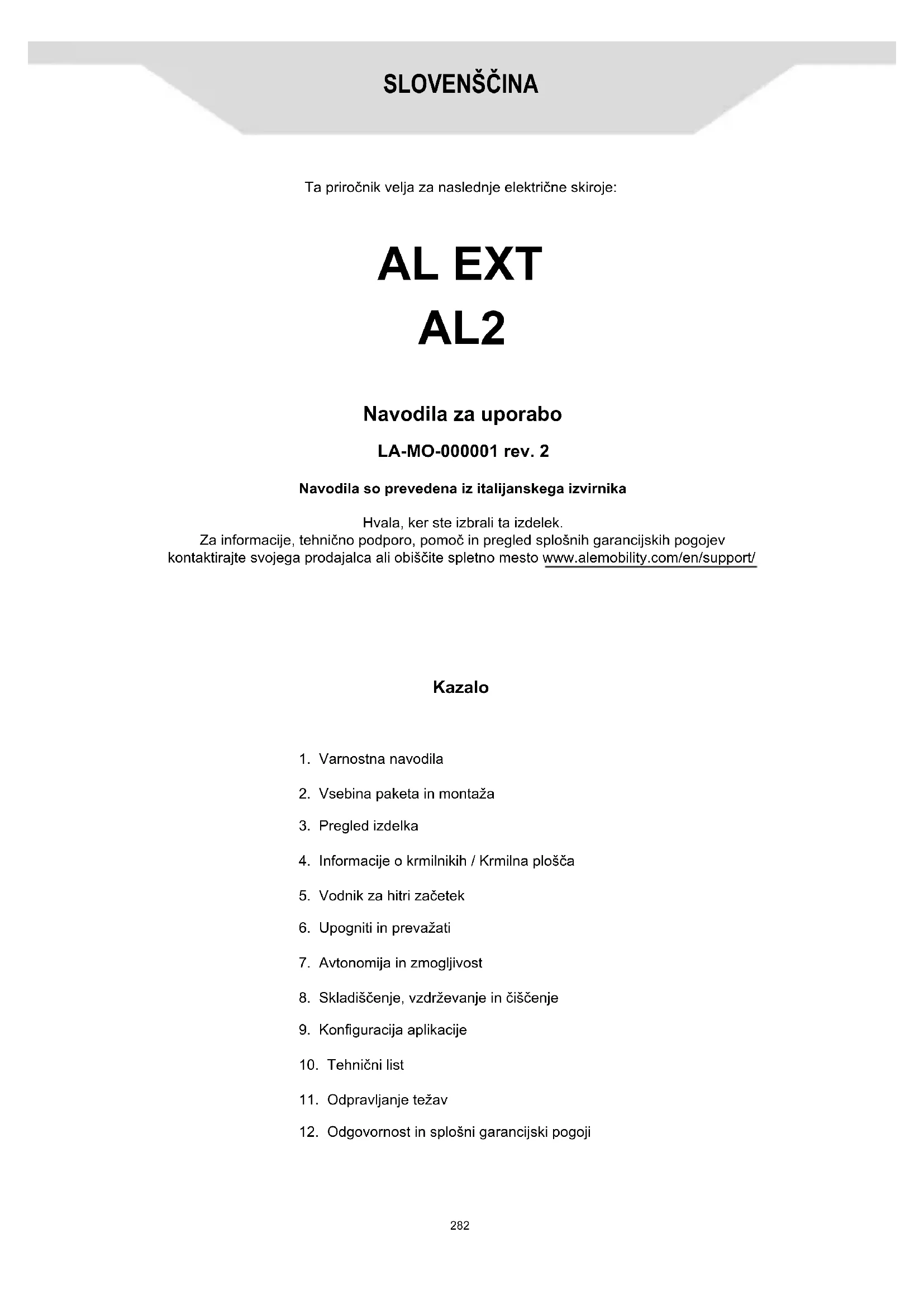 - poškodbe in / ali okvare, ki izhajajo iz uporabe neoriginalnih nadomestnih delov. Vabimo vas, da si ogledate najnovejšo različico garancijskih pogojev, ki so na voljo na spletnem mestu www.alemobility.com/en/support/309