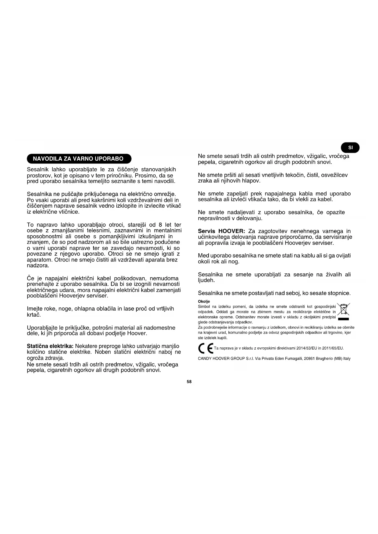 Sesalnik lahko uporabljate le za čiščenje stanovanjskih prostorov, kot je opisano v tem priročniku. Prosimo, da se pred uporabo sesalnika temeljito seznanite s temi navodili. Sesalnika ne puščajte priključenega na električno omrežje. Po vsaki uporabi ali pred kakršnimi koli vzdrževalnimi deli in čiščenjem naprave sesalnik vedno izklopite in izvlecite vtikač iz električne vtičnice. To napravo lahko uporabljajo otroci, starejši od 8 let ter osebe z zmanjšanimi telesnimi, zaznavnimi in mentalnimi sposobnostmi ali osebe s pomanjkljivimi izkušnjami in znanjem, če so pod nadzorom ali so bile ustrezno podučene o varni uporabi naprave ter se zavedajo nevarnosti, ki so povezane z njegovo uporabo. Otroci se ne smejo igrati z aparatom. Otroci ne smejo čistiti ali vzdrževati aparata brez nadzora. Če je napajalni električni kabel poškodovan, nemudoma prenehajte z uporabo sesalnika. Da bi se izognili nevarnosti električnega udara, mora napajalni električni kabel zamenjati pooblaščeni Hooverjev serviser. Imejte roke, noge, ohlapna oblačila in lase proč od vrtljivih krtač. Uporabljajte le priključke, potrošni material ali nadomestne dele, ki jih priporoča ali dobavi podjetje Hoover. Statična elektrika: Nekatere preproge lahko ustvarjajo manjšo količino statične elektrike. Noben statični električni naboj ne ogroža zdravja. Ne smete sesati trdih ali ostrih predmetov, vžigalic, vročega pepela, cigaretnih ogorkov ali drugih podobnih snovi. Ne smete sesati trdih ali ostrih predmetov, vžigalic, vročega pepela, cigaretnih ogorkov ali drugih podobnih snovi. Ne smete pršiti ali sesati vnetljivih tekočin, čistil, osvežilcev zraka ali njihovih hlapov. Ne smete zapeljati prek napajalnega kabla med uporabo sesalnika ali izvleči vtikača tako, da bi vlekli za kabel. Ne smete nadaljevati z uporabo sesalnika, če opazite nepravilnosti v delovanju. Servis HOOVER: Za zagotovitev nenehnega varnega in učinkovitega delovanja naprave priporočamo, da servisiranje ali popravila izvaja le pooblaščeni Hooverjev serviser. Med uporabo sesalnika ne smete stati na kablu ali si ga ovijati okoli rok ali nog. Sesalnika ne smete uporabljati za sesanje na živalih ali ljudeh. Sesalnika ne smete postavljati nad seboj, ko sesate stopnice. Okolje Simbol na izdelku pomeni, da izdelka ne smete odstraniti kot gospodinjski odpadek. Oddati ga morate na zbirnem mestu za recikliranje električne in elektronske opreme. Odstranitev morate izvesti v skladu z okoljskimi predpisi glede odstranjevanja odpadkov. Za podrobneješe informacije o ravnanju z izdelkom, obnovi in recikliranju izdelka se obrnite na krajevni urad, komunalno podjetje za odvoz gospodinjskih odpadkov ali trgovino, kjer ste izdelek kupili. Ta naprava je v skladu z evropskimi direktivami 2014/53/EU in 2011/65/EU. CANDY HOOVER GROUP S.r.l. Via Privata Eden Fumagalli, 20861 Brugherio (MB) Italy SI59 SESTAVLJANJE SESALNIKA Iz embalaže odstranite vse sestavne dele.
