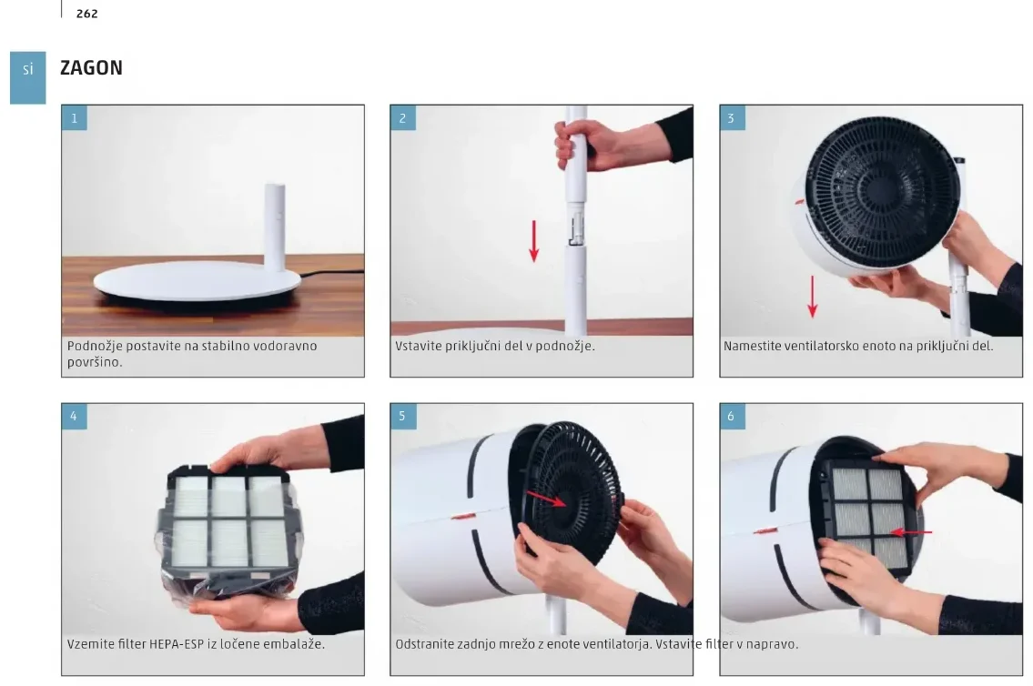 Enoto ventilatorja spet zaprite z zadnjo mrežo. Priključite električni kabel v električno omrežje. Prilagodite zmogljivost s pomočjo gumba. Pritiskajte nanjo, dokler ne začutite klika. Modela BONECO F220CC in BONECO F230CC se razlikujeta samo v tem, da ima BONECO F230CC še drugi priključni del. Ventilatorsko enoto lahko uporabljate z enim, obema ali brez priključnih delov. Lahko jo prilagodite svojim potrebam. Bodite natančni, ko nameščate mrežo, saj se naprava sicer ne bo vključila. Ob prvem vklopu ali če ventilatorja niste uporabljali dalj časa, boste prvih nekaj minut delovanja morda slišali zvok prasketanja. To je fil- ter HEPA ESP, ki se navzema električnega naboja za delovanje v funkciji visokoučinkovitega zračnega filtra.264