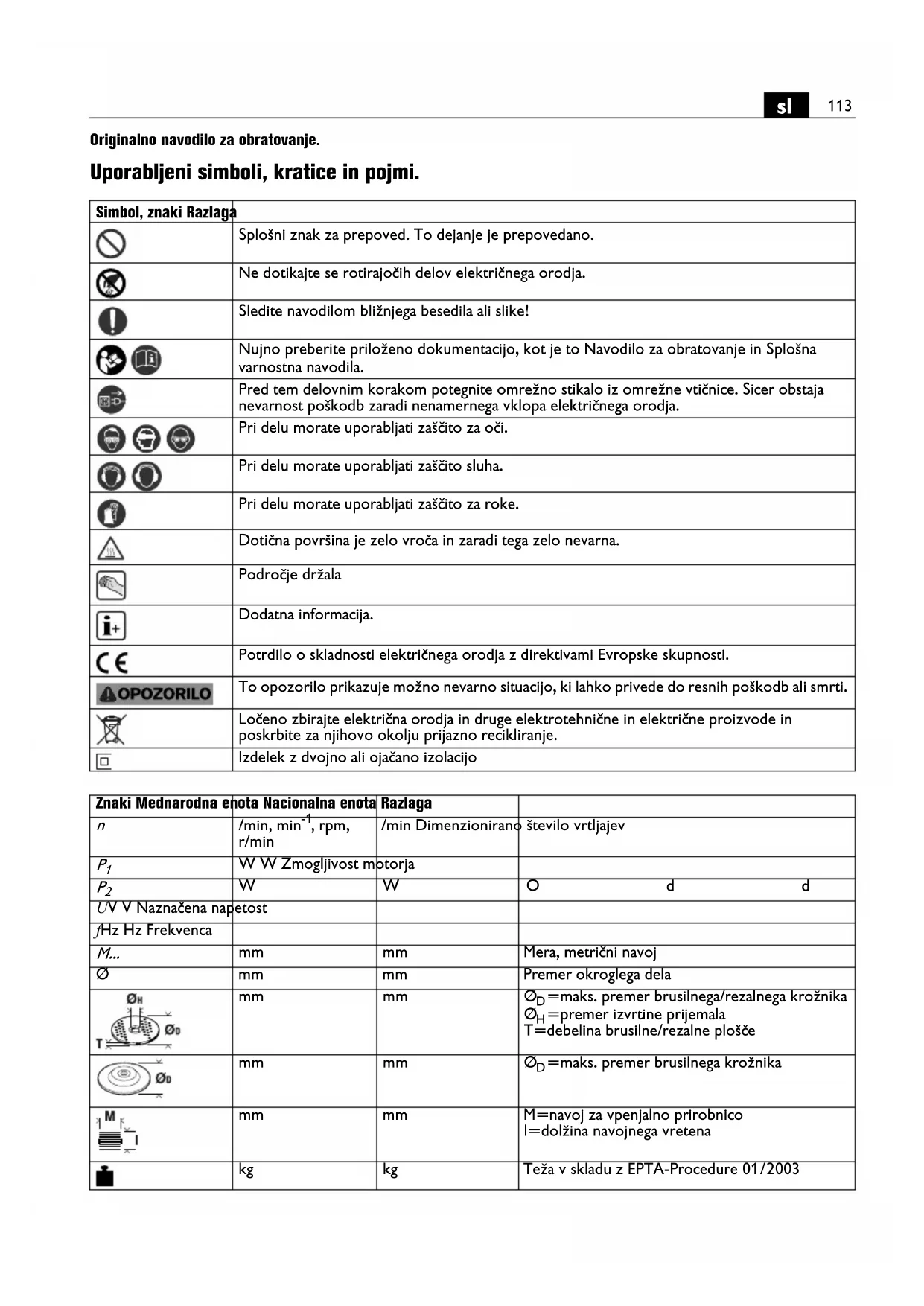 Originalno navodilo za obratovanje. Uporabljeni simboli, kratice in pojmi. Simbol, znaki Razlaga Splošni znak za prepoved. To dejanje je prepovedano. Ne dotikajte se rotirajočih delov električnega orodja. Sledite navodilom bližnjega besedila ali slike! Nujno preberite priloženo dokumentacijo, kot je to Navodilo za obratovanje in Splošna varnostna navodila. Pred tem delovnim korakom potegnite omrežno stikalo iz omrežne vtičnice. Sicer obstaja nevarnost poškodb zaradi nenamernega vklopa električnega orodja. Pri delu morate uporabljati zaščito za oči. Pri delu morate uporabljati zaščito sluha. Pri delu morate uporabljati zaščito za roke. Dotična površina je zelo vroča in zaradi tega zelo nevarna. Področje držala Dodatna informacija. Potrdilo o skladnosti električnega orodja z direktivami Evropske skupnosti. To opozorilo prikazuje možno nevarno situacijo, ki lahko privede do resnih poškodb ali smrti. Ločeno zbirajte električna orodja in druge elektrotehnične in električne proizvode in poskrbite za njihovo okolju prijazno recikliranje. Izdelek z dvojno ali ojačano izolacijo Znaki Mednarodna enota Nacionalna enota Razlaga