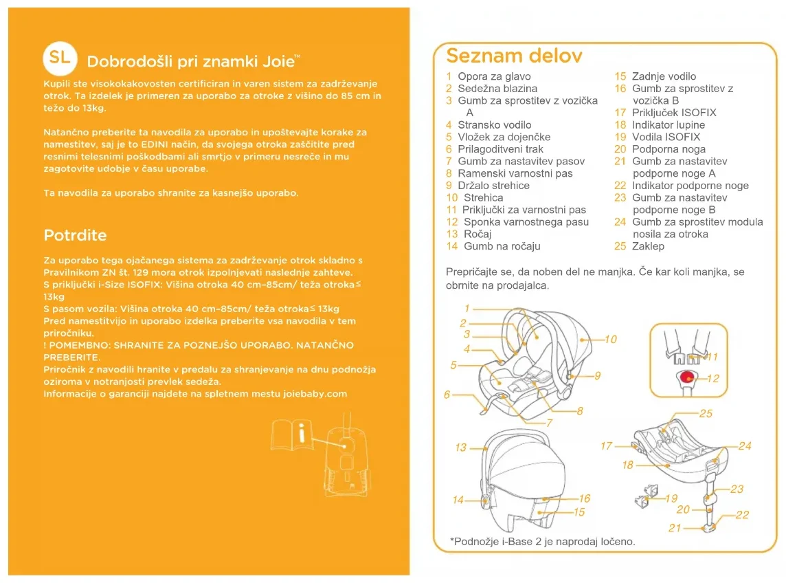 13kg S pasom vozila: Višina otroka 40cm–85cm/ teža otroka 13kgPred namestitvijo in uporabo izdelka preberite vsa navodila v tem priročniku.! POMEMBNO: SHRANITE ZA POZNEJŠO UPORABO. NATANČNO PREBERITE.Priročnik z navodili hranite v predalu za shranjevanje na dnu podnožja oziroma v notranjosti prevlek sedeža.Informacije o garanciji najdete na spletnem mestu joiebaby.com *Podnožje i-Base 2 je naprodaj ločeno.