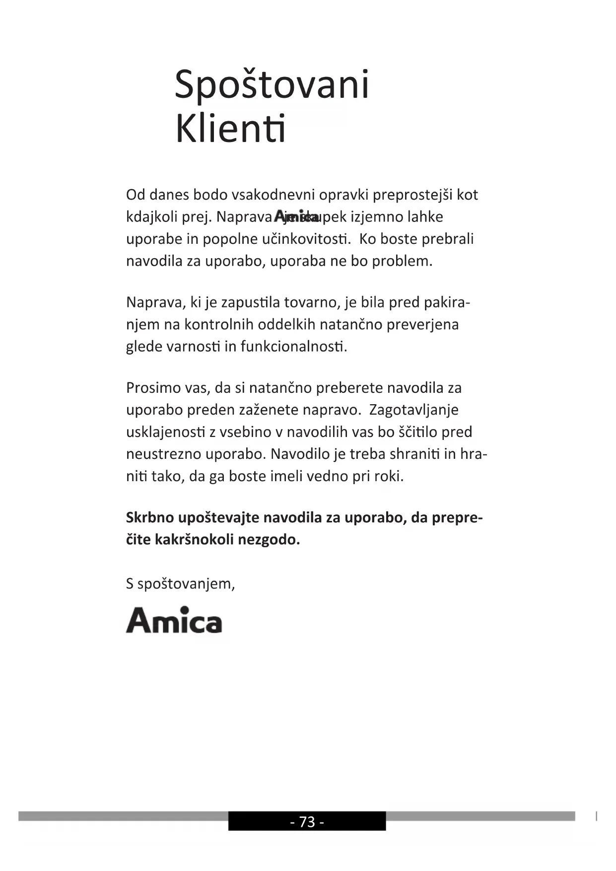 - uredbe RoHS 2011/65/EC i zato je proizvod označen te je izdana izjava o sukladnosti koja je dostupna ustanovama za nadzor tržišta.- 73 - Spoštovani Klien Od danes bodo vsakodnevni opravki preprostejši kot kdajkoli prej. Naprava je skupek izjemno lahke uporabe in popolne učinkovitos. Ko boste prebrali navodila za uporabo, uporaba ne bo problem. Naprava, ki je zapusla tovarno, je bila pred pakira- njem na kontrolnih oddelkih natančno preverjena glede varnos in funkcionalnos. Prosimo vas, da si natančno preberete navodila za uporabo preden zaženete napravo. Zagotavljanje usklajenos z vsebino v navodilih vas bo ščilo pred neustrezno uporabo. Navodilo je treba shrani in hra- ni tako, da ga boste imeli vedno pri roki. Skrbno upoštevajte navodila za uporabo, da prepre- čite kakršnokoli nezgodo. S spoštovanjem,- 74 -