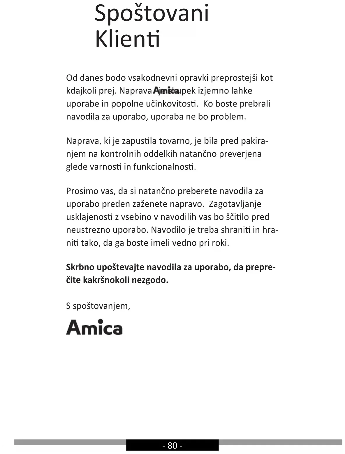 - uredbe RoHS 2011/65/EC i zato je proizvod označen te je izdana izjava o sukladnosti koja je dostupna ustanovama za nadzor tržišta.- 80 - Spoštovani Klien Od danes bodo vsakodnevni opravki preprostejši kot kdajkoli prej. Naprava je skupek izjemno lahke uporabe in popolne učinkovitos. Ko boste prebrali navodila za uporabo, uporaba ne bo problem. Naprava, ki je zapusla tovarno, je bila pred pakira- njem na kontrolnih oddelkih natančno preverjena glede varnos in funkcionalnos. Prosimo vas, da si natančno preberete navodila za uporabo preden zaženete napravo. Zagotavljanje usklajenos z vsebino v navodilih vas bo ščilo pred neustrezno uporabo. Navodilo je treba shrani in hra- ni tako, da ga boste imeli vedno pri roki. Skrbno upoštevajte navodila za uporabo, da prepre- čite kakršnokoli nezgodo. S spoštovanjem,- 81 -