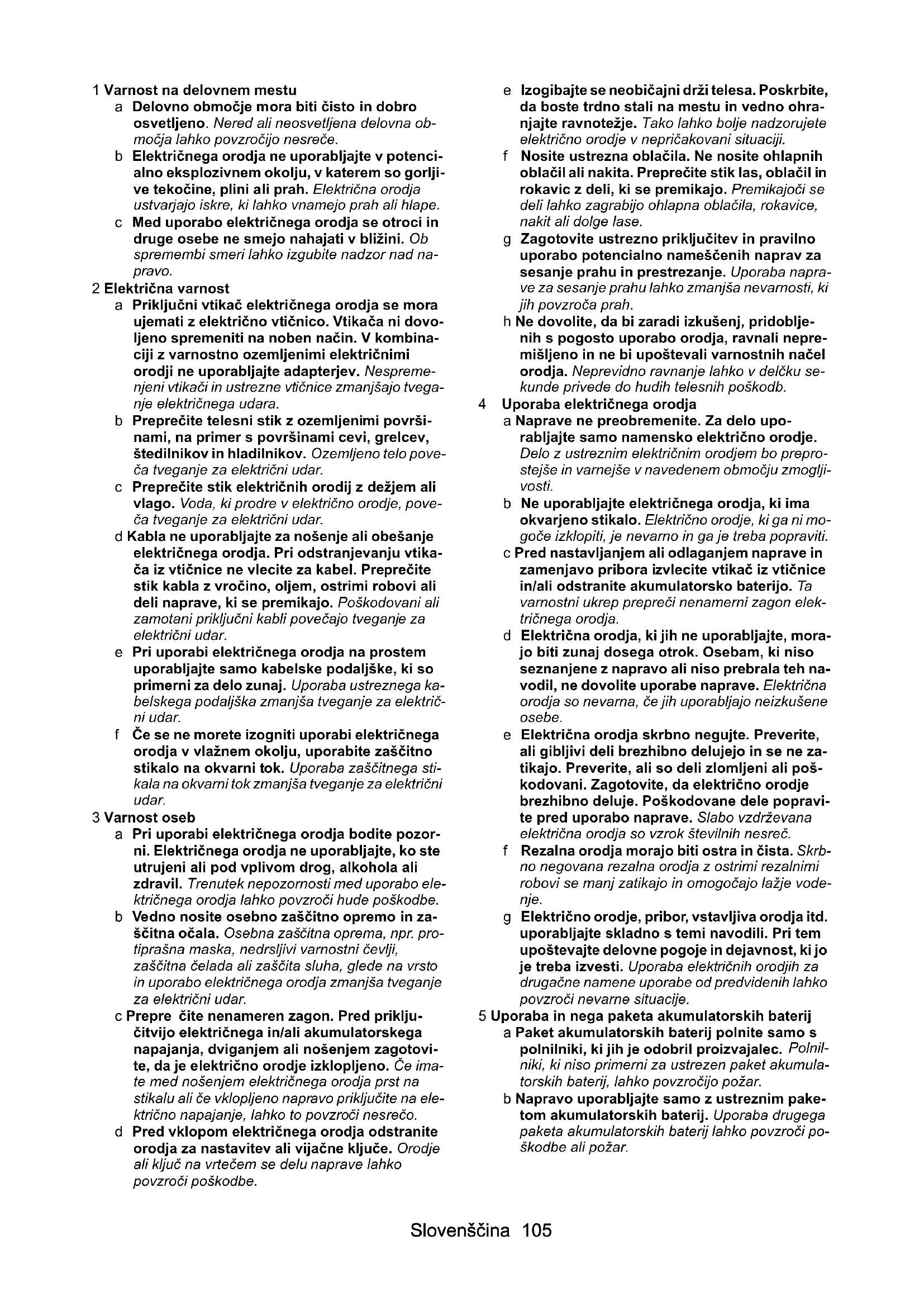 • Izjava EU o skladnosti Slovenščina 105 1 Varnost na delovnem mestu a Delovno območje mora biti čisto in dobro osvetljeno. Nered ali neosvetljena delovna ob- močja lahko povzročijo nesreče. b Električnega orodja ne uporabljajte v potenci- alno eksplozivnem okolju, v katerem so gorlji- ve tekočine, plini ali prah. Električna orodja ustvarjajo iskre, ki lahko vnamejo prah ali hlape. c Med uporabo električnega orodja se otroci in druge osebe ne smejo nahajati v bližini. Ob spremembi smeri lahko izgubite nadzor nad na- pravo. 2 Električna varnost a Priključni vtikač električnega orodja se mora ujemati z električno vtičnico. Vtikača ni dovo- ljeno spremeniti na noben način. V kombina- ciji z varnostno ozemljenimi električnimi orodji ne uporabljajte adapterjev. Nespreme- njeni vtikači in ustrezne vtičnice zmanjšajo tvega- nje električnega udara. b Preprečite telesni stik z ozemljenimi površi- nami, na primer s površinami cevi, grelcev, štedilnikov in hladilnikov. Ozemljeno telo pove- ča tveganje za električni udar. c Preprečite stik električnih orodij z dežjem ali vlago. Voda, ki prodre v električno orodje, pove- ča tveganje za električni udar. d Kabla ne uporabljajte za nošenje ali obešanje električnega orodja. Pri odstranjevanju vtika- ča iz vtičnice ne vlecite za kabel. Preprečite stik kabla z vročino, oljem, ostrimi robovi ali deli naprave, ki se premikajo. Poškodovani ali zamotani priključni kabli povečajo tveganje za električni udar. e Pri uporabi električnega orodja na prostem uporabljajte samo kabelske podaljške, ki so primerni za delo zunaj. Uporaba ustreznega ka- belskega podaljška zmanjša tveganje za električ- ni udar. f Če se ne morete izogniti uporabi električnega orodja v vlažnem okolju, uporabite zaščitno stikalo na okvarni tok. Uporaba zaščitnega sti- kala na okvarni tok zmanjša tveganje za električni udar. 3 Varnost oseb a Pri uporabi električnega orodja bodite pozor- ni. Električnega orodja ne uporabljajte, ko ste utrujeni ali pod vplivom drog, alkohola ali zdravil. Trenutek nepozornosti med uporabo ele- ktričnega orodja lahko povzroči hude poškodbe. b Vedno nosite osebno zaščitno opremo in za- ščitna očala. Osebna zaščitna oprema, npr. pro- tiprašna maska, nedrsljivi varnostni čevlji, zaščitna čelada ali zaščita sluha, glede na vrsto in uporabo električnega orodja zmanjša tveganje za električni udar. c Prepre čite nenameren zagon. Pred priklju- čitvijo električnega in/ali akumulatorskega napajanja, dviganjem ali nošenjem zagotovi- te, da je električno orodje izklopljeno. Če ima- te med nošenjem električnega orodja prst na stikalu ali če vklopljeno napravo priključite na ele- ktrično napajanje, lahko to povzroči nesrečo. d Pred vklopom električnega orodja odstranite orodja za nastavitev ali vijačne ključe. Orodje ali ključ na vrtečem se delu naprave lahko povzroči poškodbe. e Izogibajte se neobičajni drži telesa. Poskrbite, da boste trdno stali na mestu in vedno ohra- njajte ravnotežje. Tako lahko bolje nadzorujete električno orodje v nepričakovani situaciji. f Nosite ustrezna oblačila. Ne nosite ohlapnih oblačil ali nakita. Preprečite stik las, oblačil in rokavic z deli, ki se premikajo. Premikajoči se deli lahko zagrabijo ohlapna oblačila, rokavice, nakit ali dolge lase. g Zagotovite ustrezno priključitev in pravilno uporabo potencialno nameščenih naprav za sesanje prahu in prestrezanje. Uporaba napra- ve za sesanje prahu lahko zmanjša nevarnosti, ki jih povzroča prah. h Ne dovolite, da bi zaradi izkušenj, pridoblje- nih s pogosto uporabo orodja, ravnali nepre- mišljeno in ne bi upoštevali varnostnih načel orodja. Neprevidno ravnanje lahko v delčku se- kunde privede do hudih telesnih poškodb. 4 Uporaba električnega orodja a Naprave ne preobremenite. Za delo upo- rabljajte samo namensko električno orodje. Delo z ustreznim električnim orodjem bo prepro- stejše in varnejše v navedenem območju zmoglji- vosti. b Ne uporabljajte električnega orodja, ki ima okvarjeno stikalo. Električno orodje, ki ga ni mo- goče izklopiti, je nevarno in ga je treba popraviti. c Pred nastavljanjem ali odlaganjem naprave in zamenjavo pribora izvlecite vtikač iz vtičnice in/ali odstranite akumulatorsko baterijo. Ta varnostni ukrep prepreči nenamerni zagon elek- tričnega orodja. d Električna orodja, ki jih ne uporabljajte, mora- jo biti zunaj dosega otrok. Osebam, ki niso seznanjene z napravo ali niso prebrala teh na- vodil, ne dovolite uporabe naprave. Električna orodja so nevarna, če jih uporabljajo neizkušene osebe. e Električna orodja skrbno negujte. Preverite, ali gibljivi deli brezhibno delujejo in se ne za- tikajo. Preverite, ali so deli zlomljeni ali poš- kodovani. Zagotovite, da električno orodje brezhibno deluje. Poškodovane dele popravi- te pred uporabo naprave. Slabo vzdrževana električna orodja so vzrok številnih nesreč. f Rezalna orodja morajo biti ostra in čista. Skrb- no negovana rezalna orodja z ostrimi rezalnimi robovi se manj zatikajo in omogočajo lažje vode- nje. g Električno orodje, pribor, vstavljiva orodja itd. uporabljajte skladno s temi navodili. Pri tem upoštevajte delovne pogoje in dejavnost, ki jo je treba izvesti. Uporaba električnih orodjih za drugačne namene uporabe od predvidenih lahko povzroči nevarne situacije. 5 Uporaba in nega paketa akumulatorskih baterij a Paket akumulatorskih baterij polnite samo s polnilniki, ki jih je odobril proizvajalec. Polnil- niki, ki niso primerni za ustrezen paket akumula- torskih baterij, lahko povzročijo požar. b Napravo uporabljajte samo z ustreznim pake- tom akumulatorskih baterij. Uporaba drugega paketa akumulatorskih baterij lahko povzroči po- škodbe ali požar.106 Slovenščina c Preprečite stik paketa akumulatorskih baterij, ki ga ne uporabljajte, s kovinskimi predmeti kot so sponke, kovanci, ključi, žeblji, vijaki ali drugimi majhnimi kovinskimi predmeti, ki lah-