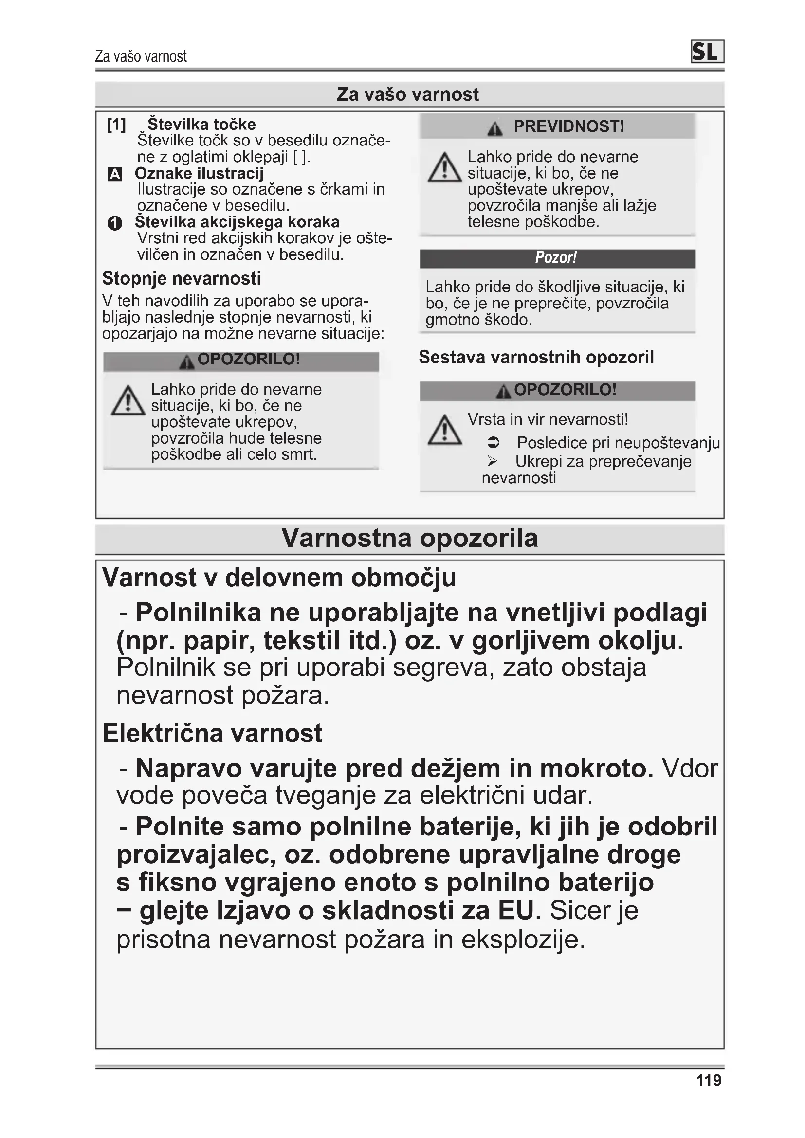 Številka akcijskega koraka Vrstni red akcijskih korakov je ošte- vilčen in označen v besedilu. Stopnje nevarnosti V teh navodilih za uporabo se upora- bljajo naslednje stopnje nevarnosti, ki opozarjajo na možne nevarne situacije: OPOZORILO! Lahko pride do nevarne situacije, ki bo, če ne upoštevate ukrepov, povzročila hude telesne poškodbe ali celo smrt. PREVIDNOST! Lahko pride do nevarne situacije, ki bo, če ne upoštevate ukrepov, povzročila manjše ali lažje telesne poškodbe. Pozor! Lahko pride do škodljive situacije, ki bo, če je ne preprečite, povzročila gmotno škodo. Sestava varnostnih opozoril OPOZORILO! Vrsta in vir nevarnosti! Â Posledice pri neupoštevanju ¾ Ukrepi za preprečevanje nevarnosti Varnostna opozorila Varnostvdelovnemobmočju - Polnilnika ne uporabljajte na vnetljivi podlagi (npr. papir, tekstil itd.) oz. v gorljivem okolju. Polnilnik se pri uporabi segreva, zato obstaja nevarnost požara. Električnavarnost - Napravovarujtepreddežjeminmokroto. Vdor vode poveča tveganje za električni udar. - Polnite samo polnilne baterije, ki jih je odobril proizvajalec, oz. odobrene upravljalne droge sksnovgrajenoenotospolnilnobaterijo −glejteIzjavooskladnostizaEU.Sicer je prisotna nevarnost požara in eksplozije.Za vašo varnost
