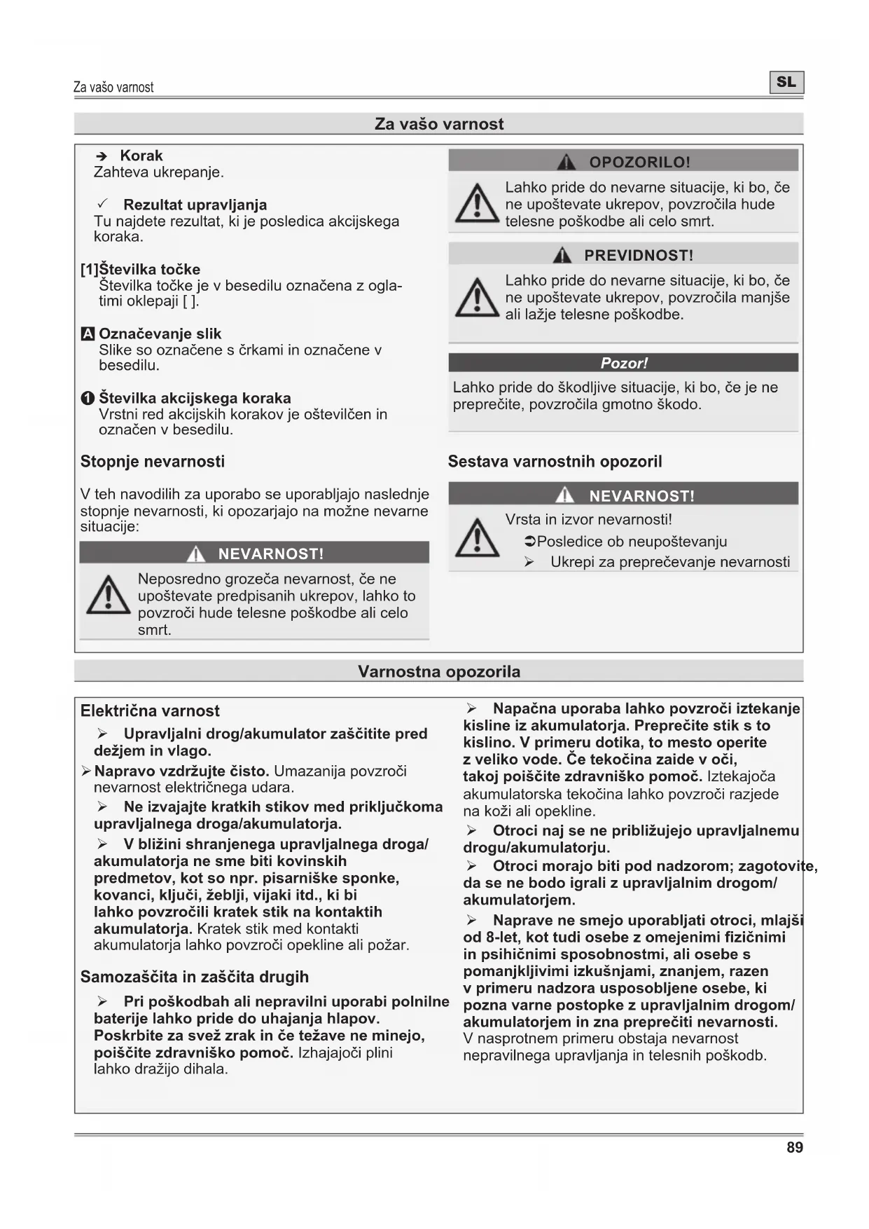 Številka akcijskega koraka Vrstni red akcijskih korakov je oštevilčen in označen v besedilu. Stopnje nevarnosti V teh navodilih za uporabo se uporabljajo naslednje stopnje nevarnosti, ki opozarjajo na možne nevarne situacije: NEVARNOST! Neposredno grozeča nevarnost, če ne upoštevate predpisanih ukrepov, lahko to povzroči hude telesne poškodbe ali celo smrt. OPOZORILO! Lahko pride do nevarne situacije, ki bo, če ne upoštevate ukrepov, povzročila hude telesne poškodbe ali celo smrt. PREVIDNOST! Lahko pride do nevarne situacije, ki bo, če ne upoštevate ukrepov, povzročila manjše ali lažje telesne poškodbe. Pozor! Lahko pride do škodljive situacije, ki bo, če je ne preprečite, povzročila gmotno škodo. Sestava varnostnih opozoril NEVARNOST! Vrsta in izvor nevarnosti! ÂPosledice ob neupoštevanju ¾ Ukrepi za preprečevanje nevarnosti Varnostna opozorila Električnavarnost ¾ Upravljalnidrog/akumulatorzaščititepred dežjeminvlago. ¾ Napravovzdržujtečisto.Umazanija povzroči nevarnost električnega udara. ¾ Neizvajajtekratkihstikovmedpriključkoma upravljalnega droga/akumulatorja. ¾ Vbližinishranjenegaupravljalnegadroga/ akumulatorja ne sme biti kovinskih predmetov, kot so npr. pisarniške sponke, kovanci,ključi,žeblji,vijakiitd.,kibi lahkopovzročilikratekstiknakontaktih akumulatorja. Kratek stik med kontakti akumulatorja lahko povzroči opekline ali požar. Samozaščitainzaščitadrugih ¾ Pri poškodbah ali nepravilni uporabi polnilne baterije lahko pride do uhajanja hlapov. Poskrbitezasvežzrakinčetežaveneminejo, poiščitezdravniškopomoč.Izhajajoči plini lahko dražijo dihala. ¾ Napačnauporabalahkopovzročiiztekanje kislineizakumulatorja.Preprečitestiksto kislino. V primeru dotika, to mesto operite zvelikovode.Četekočinazaidevoči, takojpoiščitezdravniškopomoč.Iztekajoča akumulatorska tekočina lahko povzroči razjede na koži ali opekline. ¾ Otrocinajsenepribližujejoupravljalnemu drogu/akumulatorju. ¾ Otroci morajo biti pod nadzorom; zagotovite, da se ne bodo igrali z upravljalnim drogom/ akumulatorjem. ¾ Naprave ne smejo uporabljati otroci, mlajši od8-let,kottudiosebezomejenimizičnimi inpsihičnimisposobnostmi,aliosebes pomanjkljivimi izkušnjami, znanjem, razen v primeru nadzora usposobljene osebe, ki pozna varne postopke z upravljalnim drogom/ akumulatorjeminznapreprečitinevarnosti. V nasprotnem primeru obstaja nevarnost nepravilnega upravljanja in telesnih poškodb.Varnostna opozorila