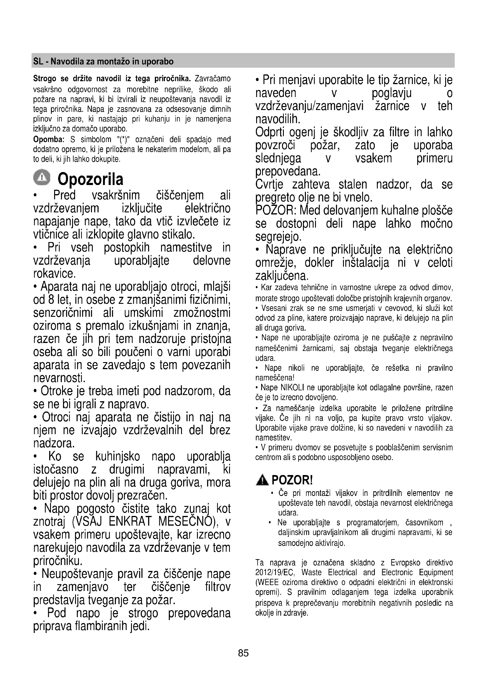 - Pri menjavi uporabite le tip žarnice, ki je naveden v poglavju o vzdrževanju/zamenjavi žarnice v teh navodilih. Odprti ogenj je škodljiv za filtre in lahko povzroči požar, zato je uporaba slednjega v vsakem primeru prepovedana. Cvrtje zahteva stalen nadzor, da se pregreto olje ne bi vnelo. POZOR: Med delovanjem kuhalne plošče se dostopni deli nape lahko močno segrejejo.