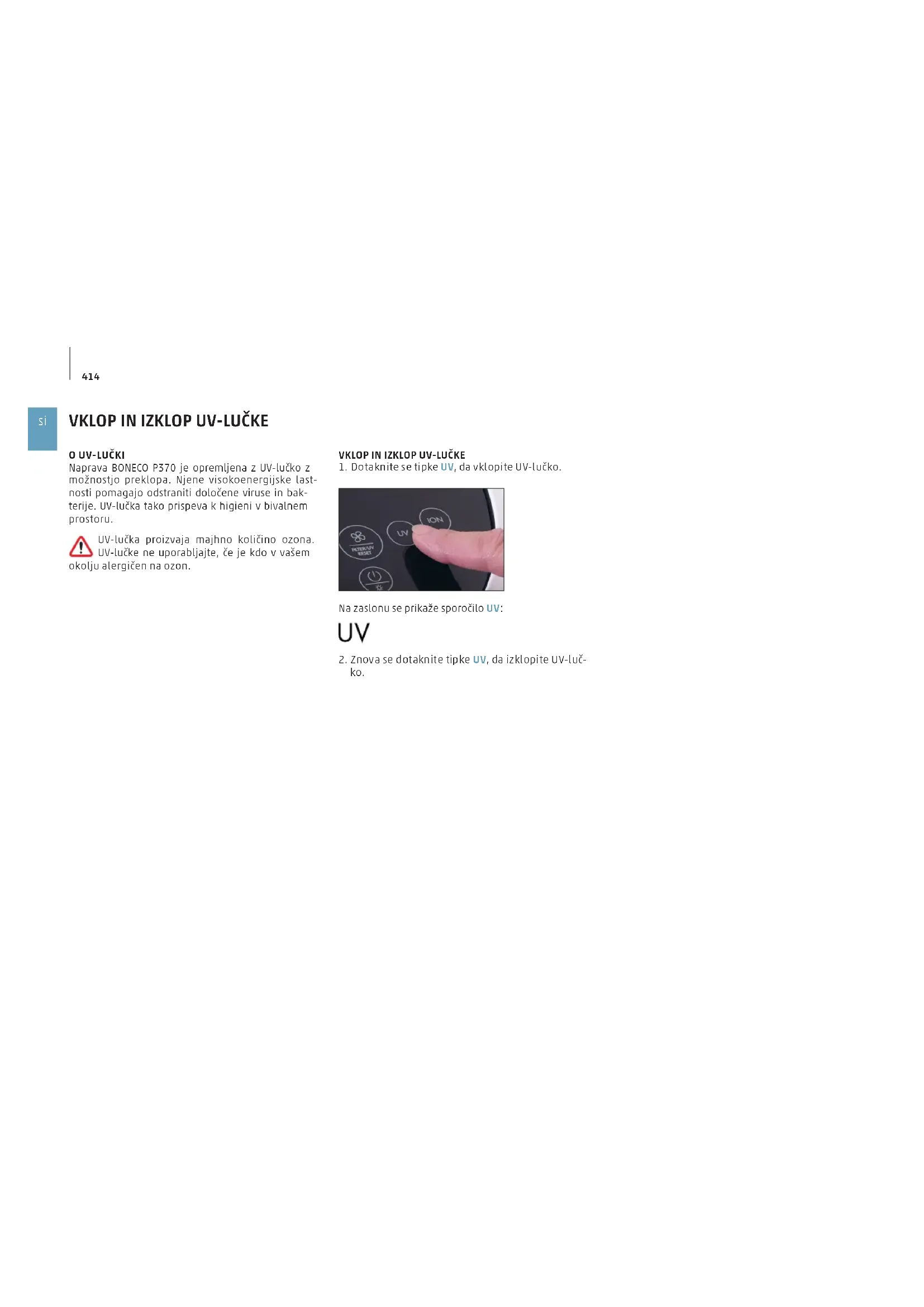 Naprava BONECO P370 je opremljena z UV-lučko z možnostjo preklopa. Njene visokoenergijske last- nosti pomagajo odstraniti določene viruse in bak- terije. UV-lučka tako prispeva k higieni v bivalnem prostoru. UV-lučka proizvaja majhno količino ozona. UV-lučke ne uporabljajte, če je kdo v vašem okolju alergičen na ozon.415