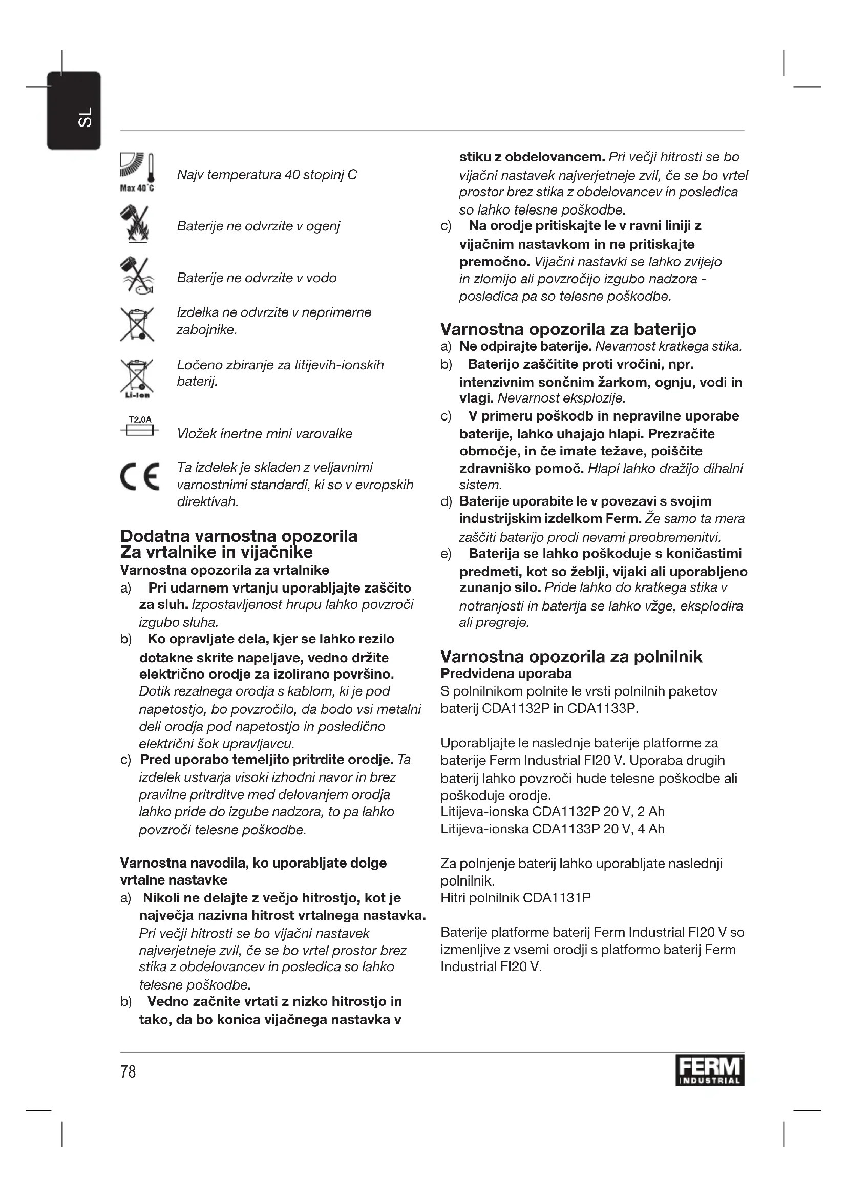 Baterije uporabite le v povezavi s svojim industrijskim izdelkom Ferm. Že samo ta mera zaščiti baterijo prodi nevarni preobremenitvi. e) Baterijaselahkopoškodujeskoničastimi predmeti,kotsožeblji,vijakialiuporabljeno zunanjo silo. Pride lahko do kratkega stika v notranjosti in baterija se lahko vžge, eksplodira ali pregreje. Varnostna opozorila za polnilnik Predvidena uporaba S polnilnikom polnite le vrsti polnilnih paketov baterij CDA1132P in CDA1133P. Uporabljajte le naslednje baterije platforme za baterije Ferm Industrial FI20 V. Uporaba drugih baterij lahko povzroči hude telesne poškodbe ali poškoduje orodje. Litijeva-ionska CDA1132P 20 V, 2 Ah Litijeva-ionska CDA1133P 20 V, 4 Ah Za polnjenje baterij lahko uporabljate naslednji polnilnik. Hitri polnilnik CDA1131P Baterije platforme baterij Ferm Industrial FI20 V so izmenljive z vsemi orodji s platformo baterij Ferm Industrial FI20 V.79