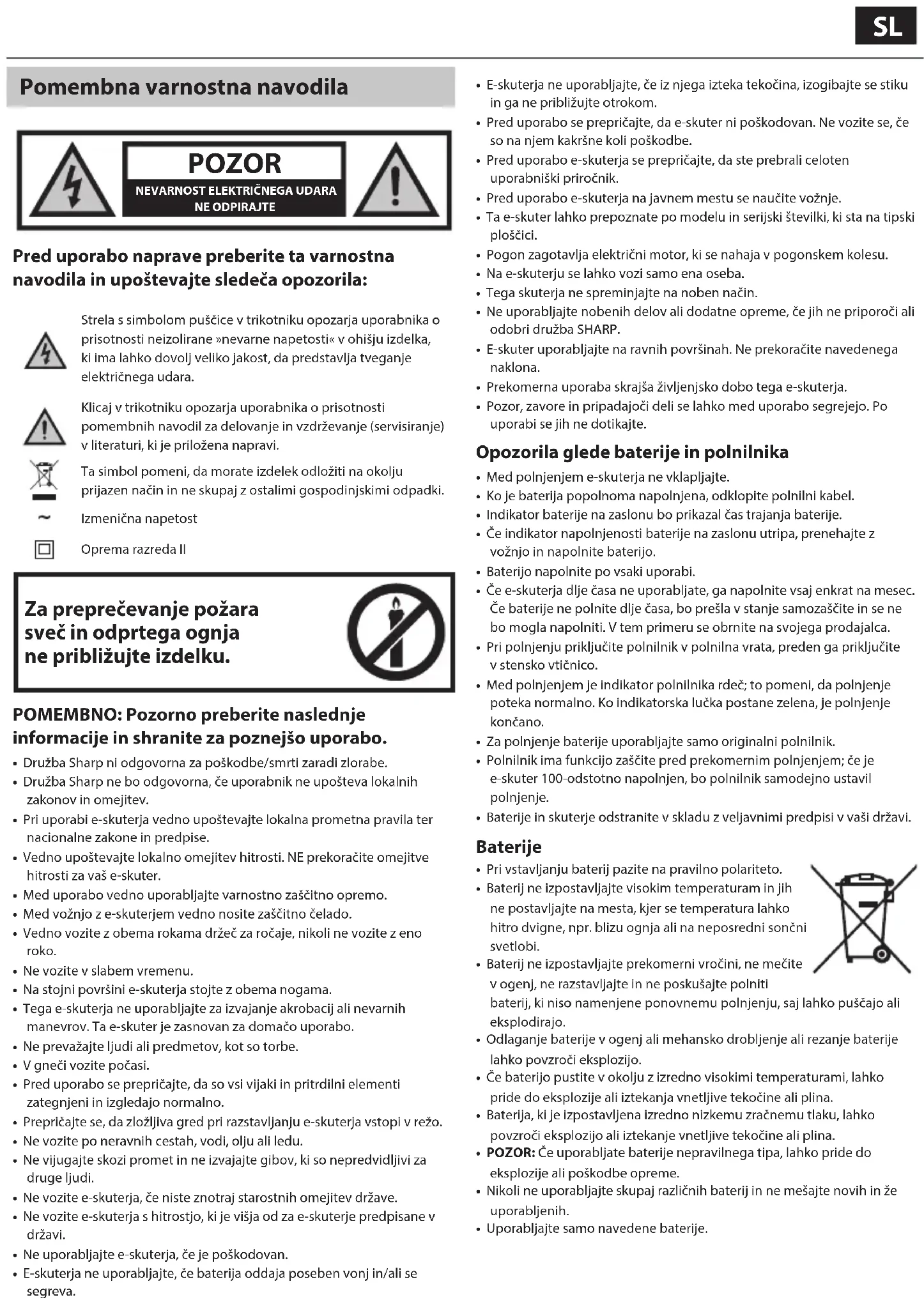 - Družba Sharp ni odgovorna za poškodbe/smrti zaradi zlorabe.• Družba Sharp ne bo odgovorna, če uporabnik ne upošteva lokalnih zakonov in omejitev.• Pri uporabi e-skuterja vedno upoštevajte lokalna prometna pravila ter nacionalne zakone in predpise.• Vedno upoštevajte lokalno omejitev hitrosti. NE prekoračite omejitve hitrosti za vaš e-skuter.• Med uporabo vedno uporabljajte varnostno zaščitno opremo.• Med vožnjo z e-skuterjem vedno nosite zaščitno čelado.• Vedno vozite z obema rokama držeč za ročaje, nikoli ne vozite z eno roko.• Ne vozite v slabem vremenu.• Na stojni površini e-skuterja stojte z obema nogama.• Tega e-skuterja ne uporabljajte za izvajanje akrobacij ali nevarnih manevrov. Ta e-skuter je zasnovan za domačo uporabo.• Ne prevažajte ljudi ali predmetov, kot so torbe.• V gneči vozite počasi.• Pred uporabo se prepričajte, da so vsi vijaki in pritrdilni elementi zategnjeni in izgledajo normalno.• Prepričajte se, da zložljiva gred pri razstavljanju e-skuterja vstopi v režo.• Ne vozite po neravnih cestah, vodi, olju ali ledu.• Ne vijugajte skozi promet in ne izvajajte gibov, ki so nepredvidljivi za druge ljudi.• Ne vozite e-skuterja, če niste znotraj starostnih omejitev države.• Ne vozite e-skuterja s hitrostjo, ki je višja od za e-skuterje predpisane v državi.• Ne uporabljajte e-skuterja, če je poškodovan.• E-skuterja ne uporabljajte, če baterija oddaja poseben vonj in/ali se segreva.• E-skuterja ne uporabljajte, če iz njega izteka tekočina, izogibajte se stiku in ga ne približujte otrokom.• Pred uporabo se prepričajte, da e-skuter ni poškodovan. Ne vozite se, če so na njem kakršne koli poškodbe.• Pred uporabo e-skuterja se prepričajte, da ste prebrali celoten uporabniški priročnik.• Pred uporabo e-skuterja na javnem mestu se naučite vožnje.• Ta e-skuter lahko prepoznate po modelu in serijski številki, ki sta na tipski ploščici.• Pogon zagotavlja električni motor, ki se nahaja v pogonskem kolesu.• Na e-skuterju se lahko vozi samo ena oseba.• Tega skuterja ne spreminjajte na noben način.• Ne uporabljajte nobenih delov ali dodatne opreme, če jih ne priporoči ali odobri družba SHARP.• E-skuter uporabljajte na ravnih površinah. Ne prekoračite navedenega naklona.• Prekomerna uporaba skrajša življenjsko dobo tega e-skuterja.• Pozor, zavore in pripadajoči deli se lahko med uporabo segrejejo. Po uporabi se jih ne dotikajte. Opozorila glede baterije in polnilnika