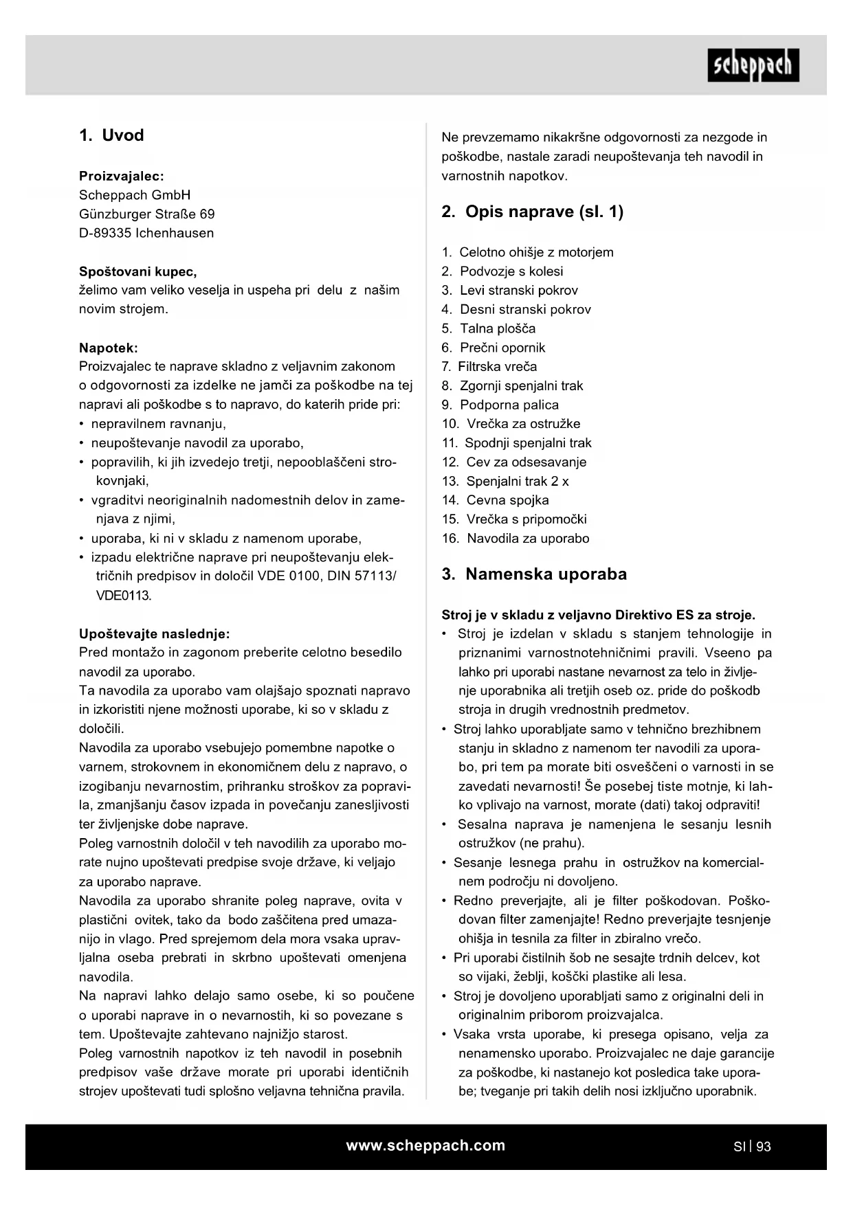 - izpadu električne naprave pri neupoštevanju elek- tričnih predpisov in določil VDE 0100, DIN 57113/ VDE0113. Upoštevajte naslednje: Pred montažo in zagonom preberite celotno besedilo navodil za uporabo. Ta navodila za uporabo vam olajšajo spoznati napravo in izkoristiti njene možnosti uporabe, ki so v skladu z določili. Navodila za uporabo vsebujejo pomembne napotke o varnem, strokovnem in ekonomičnem delu z napravo, o izogibanju nevarnostim, prihranku stroškov za popravi- la, zmanjšanju časov izpada in povečanju zanesljivosti ter življenjske dobe naprave. Poleg varnostnih določil v teh navodilih za uporabo mo- rate nujno upoštevati predpise svoje države, ki veljajo za uporabo naprave. Navodila za uporabo shranite poleg naprave, ovita v plastični ovitek, tako da bodo zaščitena pred umaza- nijo in vlago. Pred sprejemom dela mora vsaka uprav- ljalna oseba prebrati in skrbno upoštevati omenjena navodila. Na napravi lahko delajo samo osebe, ki so poučene o uporabi naprave in o nevarnostih, ki so povezane s tem. Upoštevajte zahtevano najnižjo starost. Poleg varnostnih napotkov iz teh navodil in posebnih predpisov vaše države morate pri uporabi identičnih strojev upoštevati tudi splošno veljavna tehnična pravila.www.scheppach.com