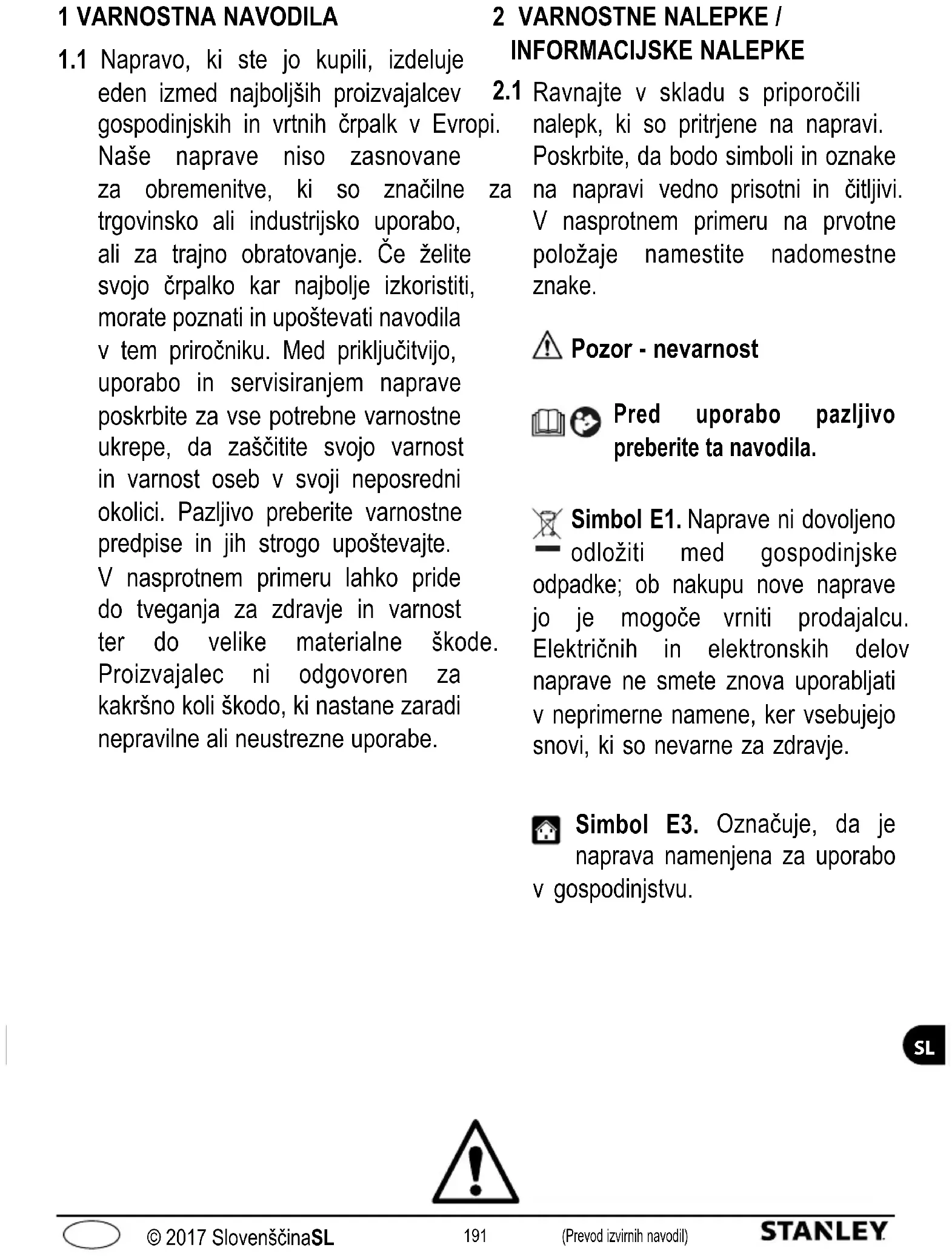 Ravnajte v skladu s priporočili nalepk, ki so pritrjene na napravi. Poskrbite, da bodo simboli in oznake na napravi vedno prisotni in čitljivi. V nasprotnem primeru na prvotne položaje namestite nadomestne znake. Pozor - nevarnost Pred uporabo pazljivo preberite ta navodila. Simbol E1. Naprave ni dovoljeno odložiti med gospodinjske odpadke; ob nakupu nove naprave jo je mogoče vrniti prodajalcu. Električnih in elektronskih delov naprave ne smete znova uporabljati v neprimerne namene, ker vsebujejo snovi, ki so nevarne za zdravje. Simbol E3. Označuje, da je naprava namenjena za uporabo v gospodinjstvu.192 (Prevod izvirnih navodil) © 2017 Slovenščina SlovenščinaSL