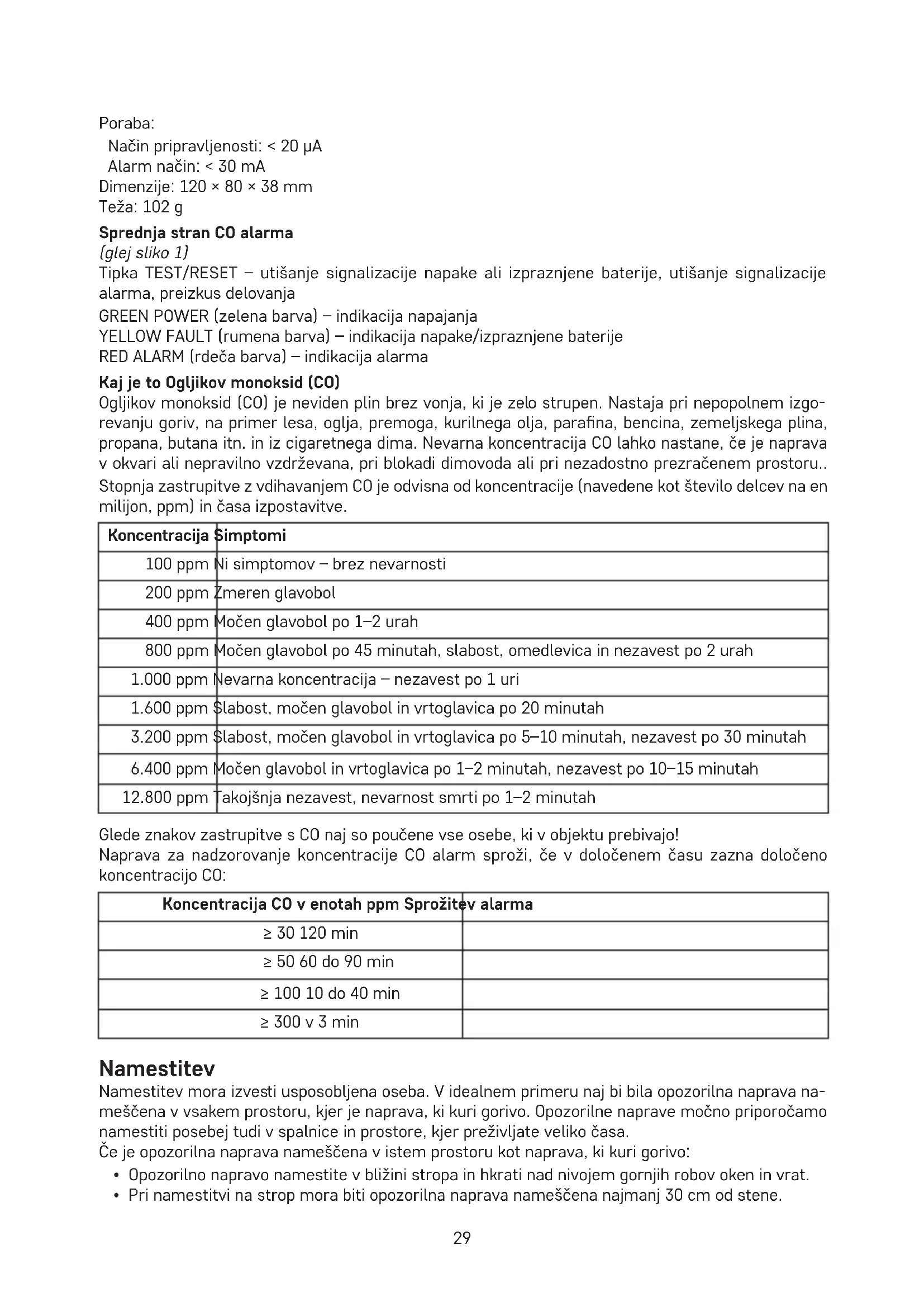 Če alarm izmeri nevarne vrednosti CO, se sproži optično in zvočno opozorilo. Vsakih 5 sekund sočasno 4× zapiska/4× utripne rdeča LED RED ALARM. Prvih 10 sekund bo glasnost zvočnega opozorila nižja kot 85db, potem bo višja. Opozorilo bo aktivno ves čas prisotnosti CO, dokler nivo CO ne pade pod varen nivo ali se ne utiša ročno. ROČNO UTIŠANJE ALARMA PRI ZAZNAVI CO Zvočni signal se lahko pri signalizaciji CO začasno utiša. Pritisnite na tipko TEST/SILENCE, zvočni signal se za 10 minut utiša. Medtem bo še vedno utripala rdeča LED RED ALARM.32 Opomba: Opozorilo bo spet aktivno najpozneje v 10 minutah od pritiska na tipko TEST/SILENCE, če bo raven CO enaka ali višja kot 50 ppm. Utišanja ni možno aktivirati, če bo raven CO enaka ali višja kot 200 ppm. KAKO SE OBNAŠATI PRI ZAZNAVI CO V OBJEKTU Če se signalizira prisotnost CO v objektu, ostanite mirni in ukrepajte, kot sledi: Nehajte uporabljati vse naprave, ki kurijo gorivo, in če je možno, jih izklopite. Alarm utišajte s pomočjo tipke TEST/RESET. O nastali situaciji obvestite vse osebe v objektu! Odprite vsa okna in vrata ter prezračite. Če alarm še vedno traja, objekt zapustite. Pokličite 112 in servisno organizacijo aparata in dobavitelja prosite za pomoči s iskanjem in odstranitev vira ogljikovega monoksida. Preverite, ali so objekt zapustile vse osebe! Okna in vrata pustite odprta, dokler se alarm ne konča. Za vse osebe z učinki zastrupitve z ogljikovim monoksidom (glavobol, slabost) zagotovite zdravniško pomoč. Zdravnika opozorite na sum vdihavanja ogljikovega monoksida. Aparatov, ki kurijo gorivo, nadalje ne uporabljajte, če niso bili ponovno preverjeni s strani osebe, ki je za to pooblaščena. Opomba: Poleg naprav, ki kurijo gorivo lahko obstajajo drugi viri ogljikovega monoksida. Npr.: emisije iz tlenja, večja količina tobačnega dima. Opozorilo: Nekatere snovi lahko vplivajo na občutljivost senzorja znotraj alarma, npr.: metan, propan, izobuten, izopropanol, etilen, bencol, toluen, etilacetat, vodikov suld, žveplov dioksid, pripravki na osnovi alkohola, barve, redčila, topila, lepila, razpršila za lase, vodice po britju, parfumi in nekatera čistilna sredstva. Skrb in vzdrževanje Izdelek je zasnovan tako, da ob primerni uporabi zanesljivo deluje vrsto let. Tu je nekaj nasvetov za pravilno uporabo: