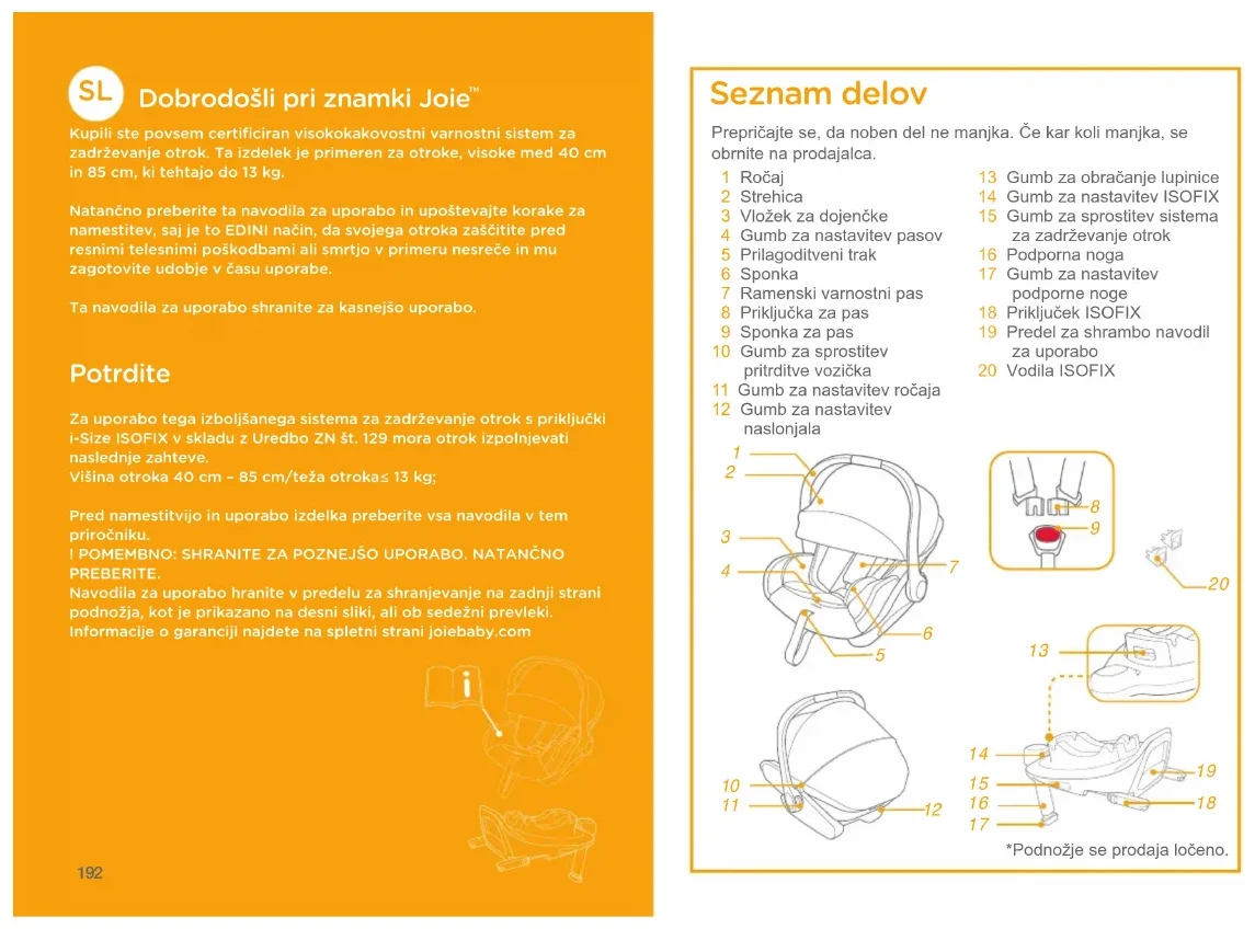 Kupili ste povsem certificiran visokokakovostni varnostni sistem za zadrževanje otrok. Ta izdelek je primeren za otroke﹐ visoke med 40 cm in 85 cm﹐ ki tehtajo do 13 kg.Natančno preberite ta navodila za uporabo in upoštevajte korake za namestitev﹐ saj je to EDINI način﹐ da svojega otroka zaščitite pred resnimi telesnimi poškodbami ali smrtjo v primeru nesreče in mu zagotovite udobje v času uporabe.Ta navodila za uporabo shranite za kasnejšo uporabo. Potrdite Za uporabo tega izboljšanega sistema za zadrževanje otrok s priključki i-Size ISOFIX v skladu z Uredbo ZN št. 129 mora otrok izpolnjevati naslednje zahteve.Višina otroka 40cm – 85 cm/teža otroka 13 kg;Pred namestitvijo in uporabo izdelka preberite vsa navodila v tem priročniku.! POMEMBNO: SHRANITE ZA POZNEJŠO UPORABO. NATANČNO PREBERITE.Navodila za uporabo hranite v predelu za shranjevanje na zadnji strani podnožja﹐ kot je prikazano na desni sliki﹐ ali ob sedežni prevleki.Informacije o garanciji najdete na spletni strani joiebaby.com Prepričajte se, da noben del ne manjka. Če kar koli manjka, se obrnite na prodajalca. 1 Ročaj 2 Strehica 3 Vložek za dojenčke 4 Gumb za nastavitev pasov 5 Prilagoditveni trak 6 Sponka 7 Ramenski varnostni pas 8 Priključka za pas 9 Sponka za pas 10 Gumb za sprostitev pritrditve vozička 11 Gumb za nastavitev ročaja 12 Gumb za nastavitev naslonjala Seznam delov 13 Gumb za obračanje lupinice 14 Gumb za nastavitev ISOFIX 15 Gumb za sprostitev sistema za zadrževanje otrok 16 Podporna noga 17 Gumb za nastavitev podporne noge 18 Priključek ISOFIX 19 Predel za shrambo navodil za uporabo 20 Vodila ISOFIX *Podnožje se prodaja ločeno.