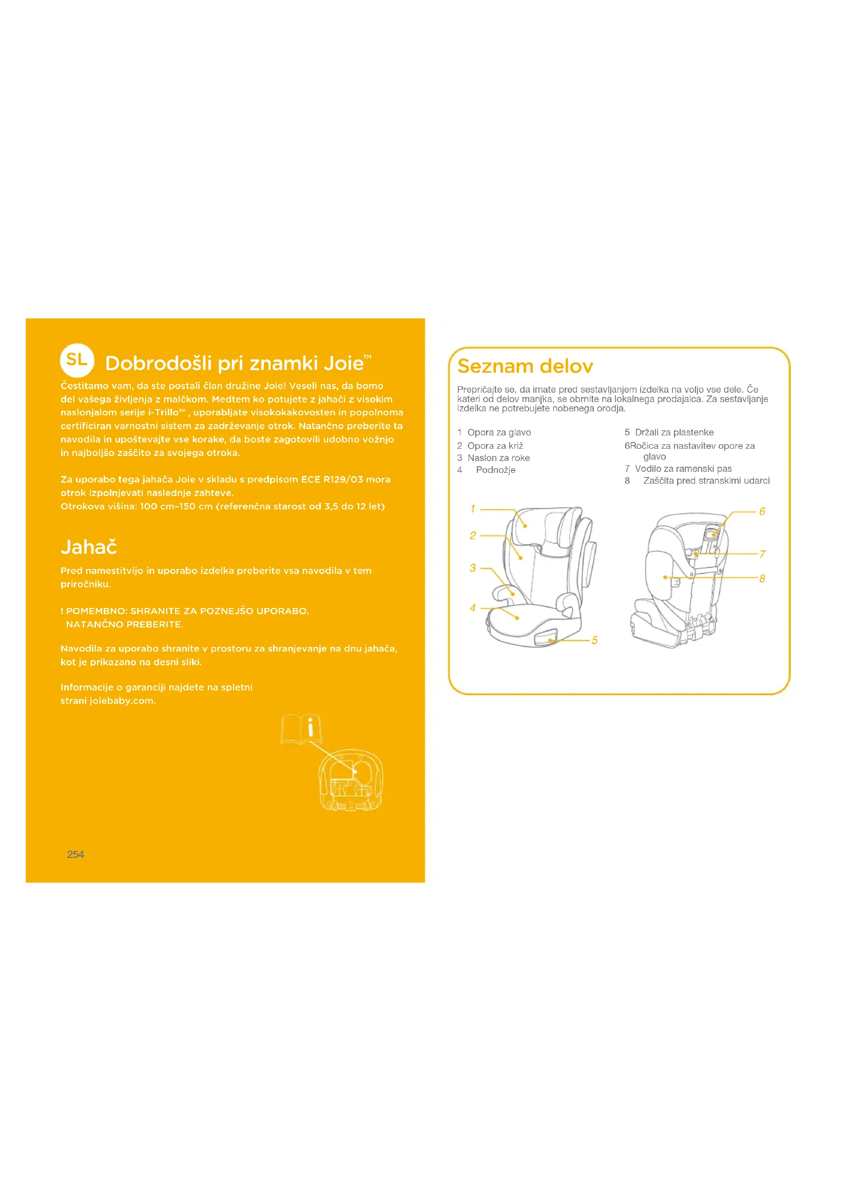 Čestitamo vam, da ste postali član družine Joie! Veseli nas, da bomo del vašega življenja z malčkom. Medtem ko potujete z jahači z visokim naslonjalom serije i-Trillo™ , uporabljate visokokakovosten in popolnoma certificiran varnostni sistem za zadrževanje otrok. Natančno preberite ta navodila in upoštevajte vse korake, da boste zagotovili udobno vožnjo in najboljšo zaščito za svojega otroka.Za uporabo tega jahača Joie v skladu s predpisom ECE R129/03 mora otrok izpolnjevati naslednje zahteve.Otrokova višina: 100cm–150cm (referenčna starost od 3,5 do 12 let) Jahač Pred namestitvijo in uporabo izdelka preberite vsa navodila v tem priročniku.! POMEMBNO: SHRANITE ZA POZNEJŠO UPORABO.NATANČNO PREBERITE.Navodila za uporabo shranite v prostoru za shranjevanje na dnu jahača, kot je prikazano na desni sliki.Informacije o garanciji najdete na spletni strani joiebaby.com.