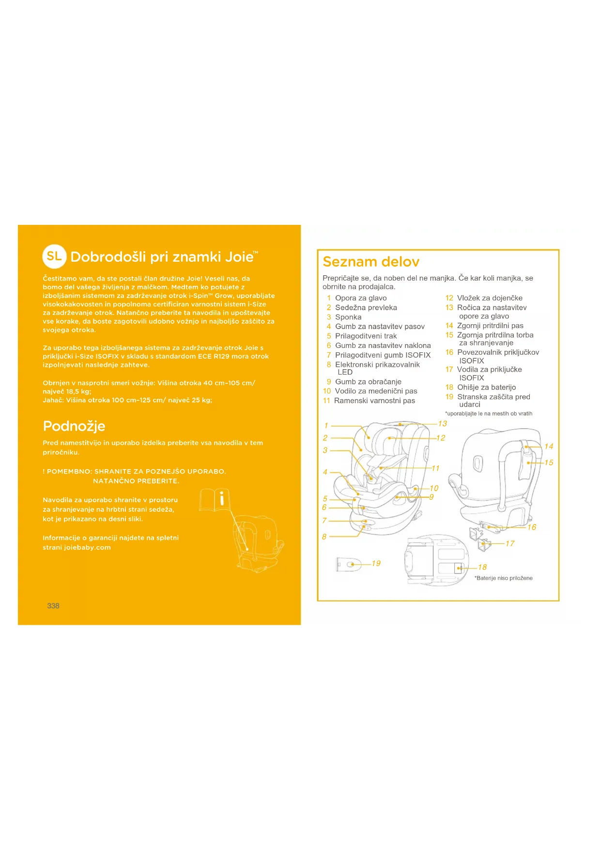 Čestitamo vam, da ste postali član družine Joie! Veseli nas, da bomo del vašega življenja z malčkom. Medtem ko potujete z izboljšanim sistemom za zadrževanje otrok i-Spin™ Grow, uporabljate visokokakovosten in popolnoma certificiran varnostni sistem i-Size za zadrževanje otrok. Natančno preberite ta navodila in upoštevajte vse korake, da boste zagotovili udobno vožnjo in najboljšo zaščito za svojega otroka.Za uporabo tega izboljšanega sistema za zadrževanje otrok Joie s priključki i-Size ISOFIX v skladu s standardom ECE R129 mora otrok izpolnjevati naslednje zahteve.Obrnjen v nasprotni smeri vožnje: Višina otroka 40 cm–105 cm/ največ 18,5 kg;Jahač: Višina otroka 100 cm–125 cm/ največ 25 kg; Podnožje Pred namestitvijo in uporabo izdelka preberite vsa navodila v tem priročniku.! POMEMBNO: SHRANITE ZA POZNEJŠO UPORABO.NATANČNO PREBERITE.Navodila za uporabo shranite v prostoru za shranjevanje na hrbtni strani sedeža, kot je prikazano na desni sliki.Informacije o garanciji najdete na spletni strani joiebaby.com Seznam delov 1 Opora za glavo 2 Sedežna prevleka 3 Sponka 4 Gumb za nastavitev pasov 5 Prilagoditveni trak 6 Gumb za nastavitev naklona 7 Prilagoditveni gumb ISOFIX 8 Elektronski prikazovalnik LED 9 Gumb za obračanje10 Vodilo za medenični pas11 Ramenski varnostni pas12 Vložek za dojenčke13 Ročica za nastavitev opore za glavo14 Zgornji pritrdilni pas15 Zgornja pritrdilna torba za shranjevanje16 Povezovalnik priključkov ISOFIX17 Vodila za priključke ISOFIX 18 Ohišje za baterijo19 Stranska zaščita pred udarciPrepričajte se, da noben del ne manjka. Če kar koli manjka, se obrnite na prodajalca.
