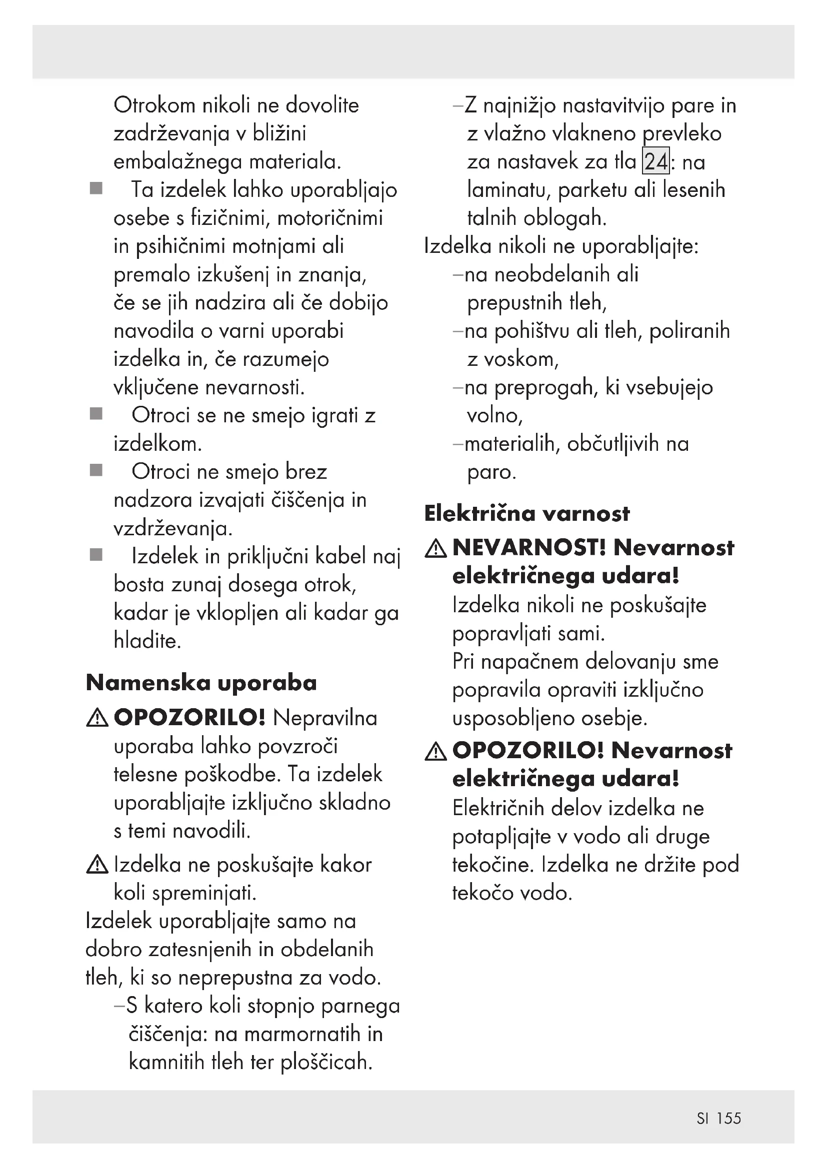 Izdelka ne poskušajte kakor koli spreminjati. Izdelek uporabljajte samo na dobro zatesnjenih in obdelanih tleh, ki so neprepustna za vodo. – S katero koli stopnjo parnega čiščenja: na marmornatih in kamnitih tleh ter ploščicah. – Z najnižjo nastavitvijo pare in z vlažno vlakneno prevleko za nastavek za tla []: na laminatu, parketu ali lesenih talnih oblogah. Izdelka nikoli ne uporabljajte: – na neobdelanih ali prepustnih tleh, – na pohištvu ali tleh, poliranih z voskom, – na preprogah, ki vsebujejo volno, – materialih, občutljivih na paro. Električna varnost