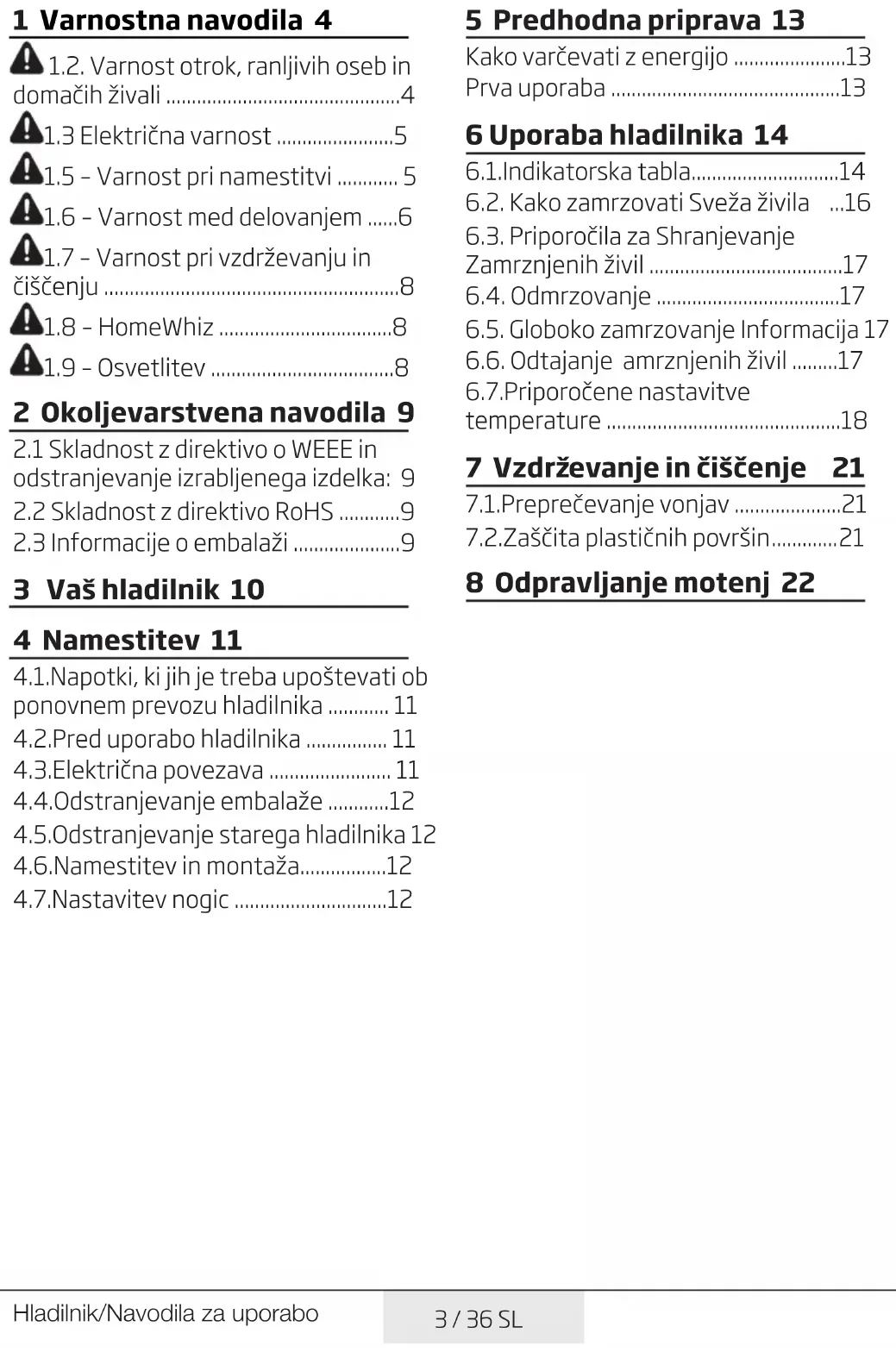 - Ne poškodujte cevi hladilnega sistema z ostrimi ali koničastimi predmeti. Hladilno sredstvo, ki se lahko razprši v primeru predrtja cevi za hladilno sredstvo, podaljškov cevi ali površinskih prevlek, povzroči draženje kože in poškodbe oči.7 / 36 SL Hladilnik/Navodila za uporabo Varnost navodila