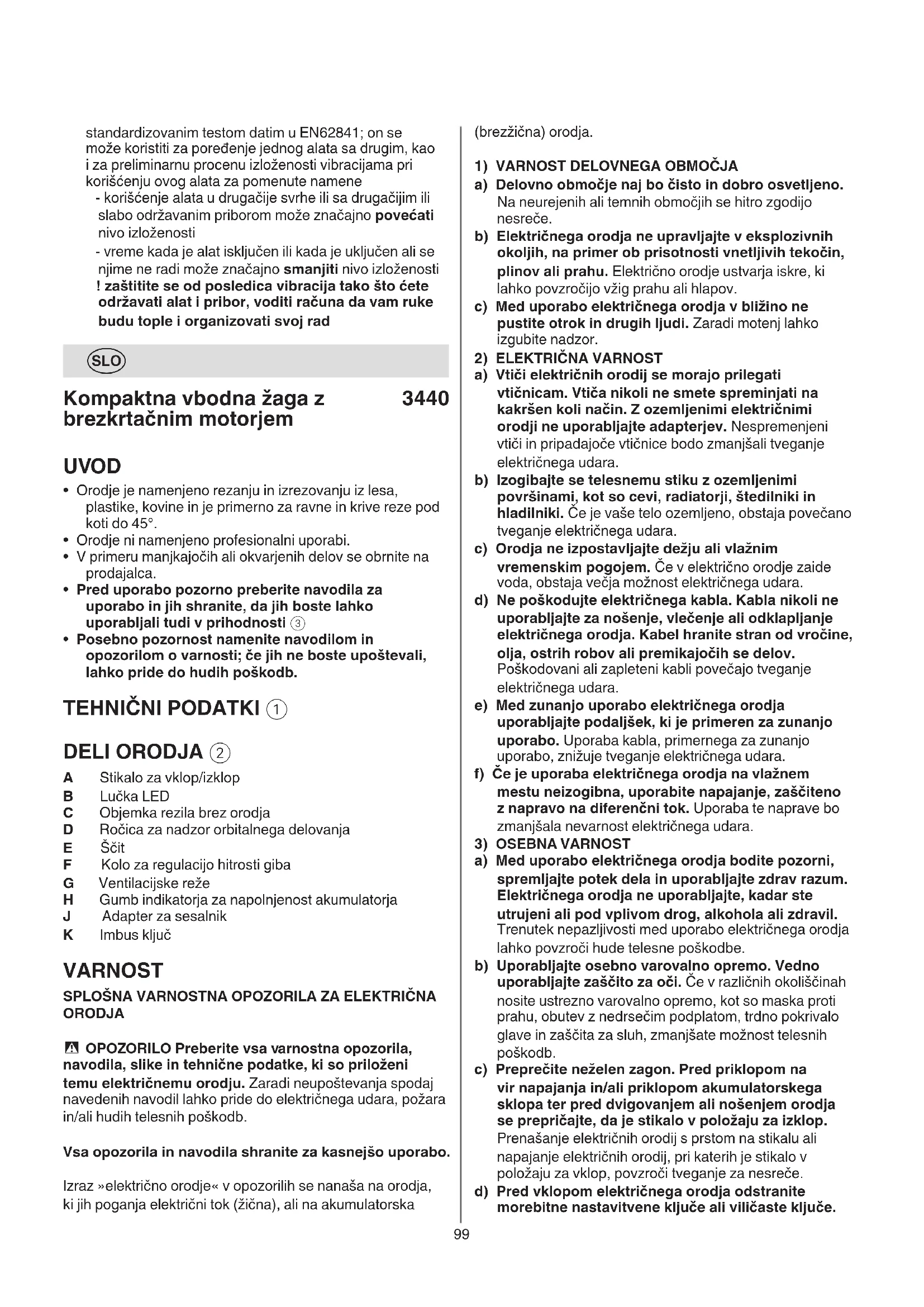 a) Električnegaorodjanepreobremenjujte.Uporabite električnoorodje,kijeprimernozavašedelo. Ustrezno električno orodje bo nalogo opravilo bolje in varneje pri zmogljivosti, za katero je bilo zasnovano. b) Neuporabljajteelektričnegaorodja,čegani mogočevklopitiinizklopitisstikalom.Kakršno koli električno orodje, ki ga ni mogoče nadzirati s stikalom, je nevarno in ga je potrebno popraviti. c) Odklopitevtičizviranapajanjain/aliodstranite baterijskisklop,čejesnemljiv,predenopravite kakršne koli prilagoditve, menjate nastavke ali shraniteelektričnoorodje.Tovrstni preventivni varnostni ukrepi zmanjšujejo tveganje nenamernega zagona električnega orodja. d) Električnaorodja,kinisovuporabi,shranjujteizven dosegaotrokinnedovolite,dabielektričnoorodje uporabljaleosebe,kinisoseznanjenezelektričnim orodjem ali s temi navodili. Električno orodje je v rokah neusposobljenih uporabnikov nevarno. e) Električnaorodjaindodatkevzdržujte.Preverite morebitnoneporavnanostalipovezavopremikajočih sedelov,zlomedelovalimorebitnodrugačno stanje,kibilahkovplivalonadelovanjeelektričnega orodja.Čejeelektričnoorodjepoškodovano,ga pred ponovno uporabo nesite na popravilo. Mnogo nesreč se pripeti zaradi slabo vzdrževanih električnih orodij. f) Rezalnaorodjanajbodovednonabrušenainčista. Pravilno vzdrževana rezalna orodja z ostrimi rezili se težje zaskočijo in jih je lažje nadzirati. g) Električnoorodje,dodatke,deleorodjaitd. uporabljajte v skladu s temi navodili, pri tem pa upoštevajte delovne pogoje in delo, ki ga boste opravljali. Če boste električno orodje uporabljali za neustrezne namene, lahko pride do nevarnih situacij. h) Ročajiinprijemalnepovršinenajbodosuhe, čisteinbrezmadeževoljaalimasti. Drseči ročaji in prijemalne površine ne omogočajo varnega ravnanja in nadzorovanja orodja v nepričakovanih situacijah.