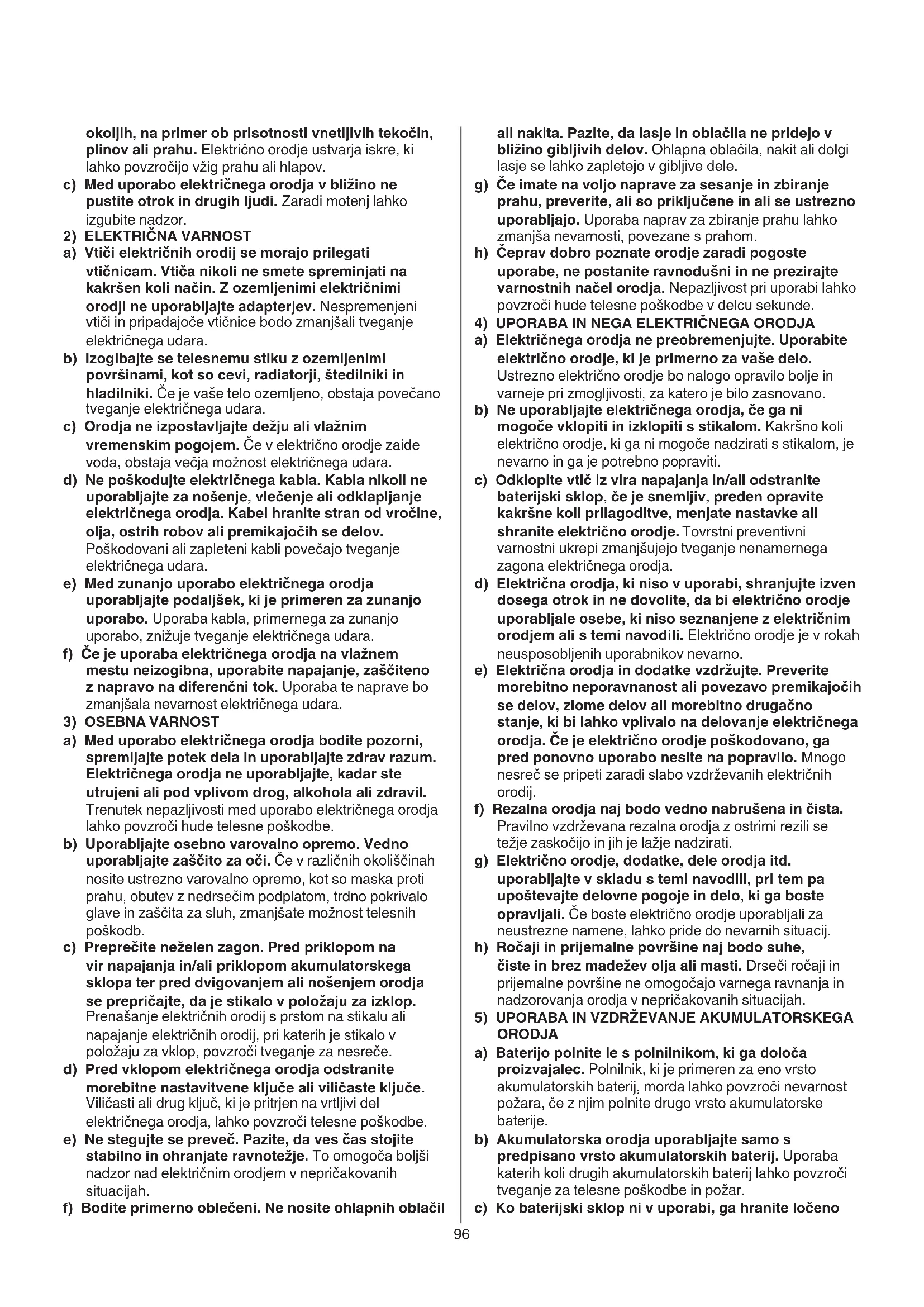 ORODJA a) Baterijo polnite le s polnilnikom, ki ga določa proizvajalec. Polnilnik, ki je primeren za eno vrsto akumulatorskih baterij, morda lahko povzroči nevarnost požara, če z njim polnite drugo vrsto akumulatorske baterije. b) Akumulatorska orodja uporabljajte samo s predpisano vrsto akumulatorskih baterij. Uporaba katerih koli drugih akumulatorskih baterij lahko povzroči tveganje za telesne poškodbe in požar. c) Ko baterijski sklop ni v uporabi, ga hranite ločeno okoljih, na primer ob prisotnosti vnetljivih tekočin, plinov ali prahu. Električno orodje ustvarja iskre, ki lahko povzročijo vžig prahu ali hlapov. c) Med uporabo električnega orodja v bližino ne pustite otrok in drugih ljudi. Zaradi motenj lahko izgubite nadzor.