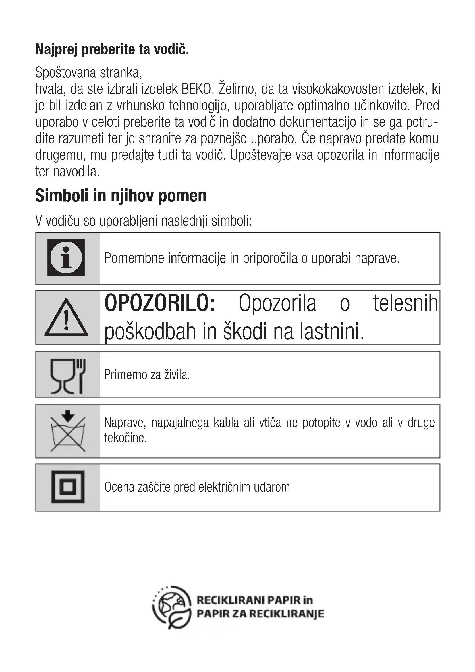 OPOZORILO: Opozorila o telesnih poškodbah in škodi na lastnini. Primerno za živila.Naprave, napajalnega kabla ali vtiča ne potopite v vodo ali v druge tekočine.Ocena zaščite pred električnim udarom88 / SL Ročni mešalnik / Uporabniški priročnik 1 Pomembna varnostna in okoljska navodila To poglavje vsebuje varnostna navodila za preprečevanje nevarnosti, ki lahko povzročijo telesne poškodbe ali materialno škodo. Kakršnakoli garancija preneha veljati, če se ne upoštevate teh navodil.