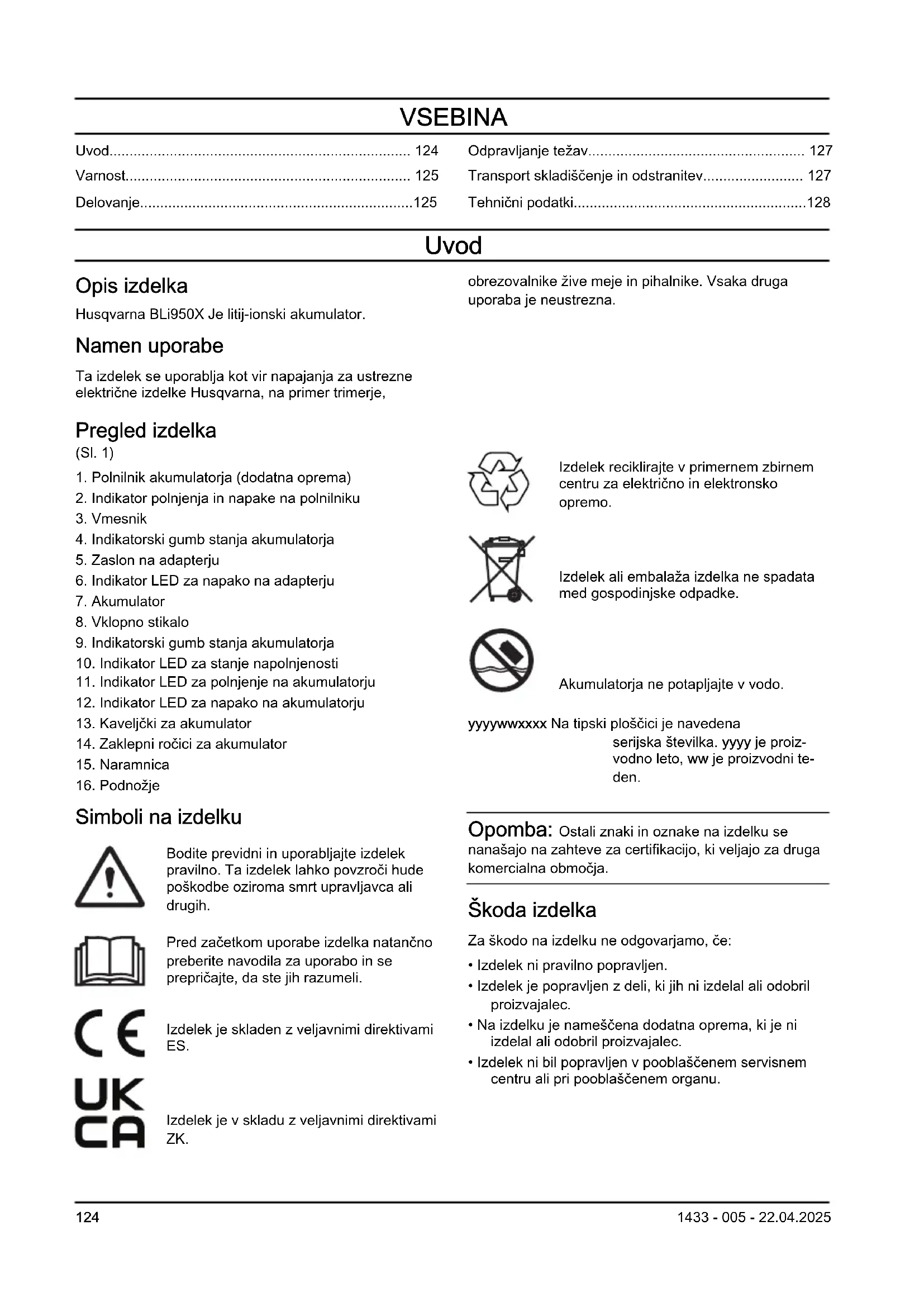 BLi950X - Baterija HUSQVARNA - Brezplačna navodila za uporabo