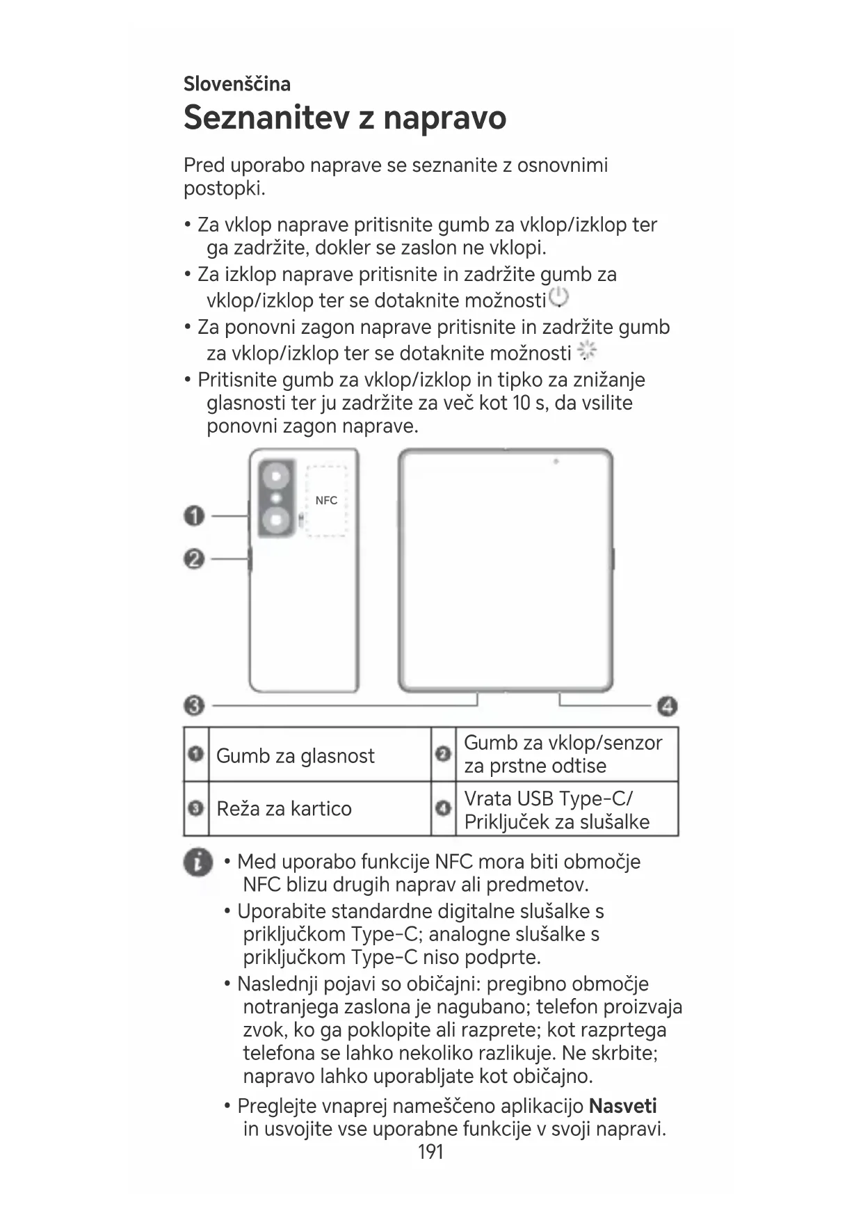 - Preglejte vnaprej nameščeno aplikacijo Nasveti in usvojite vse uporabne funkcije v svoji napravi. 191Uvod