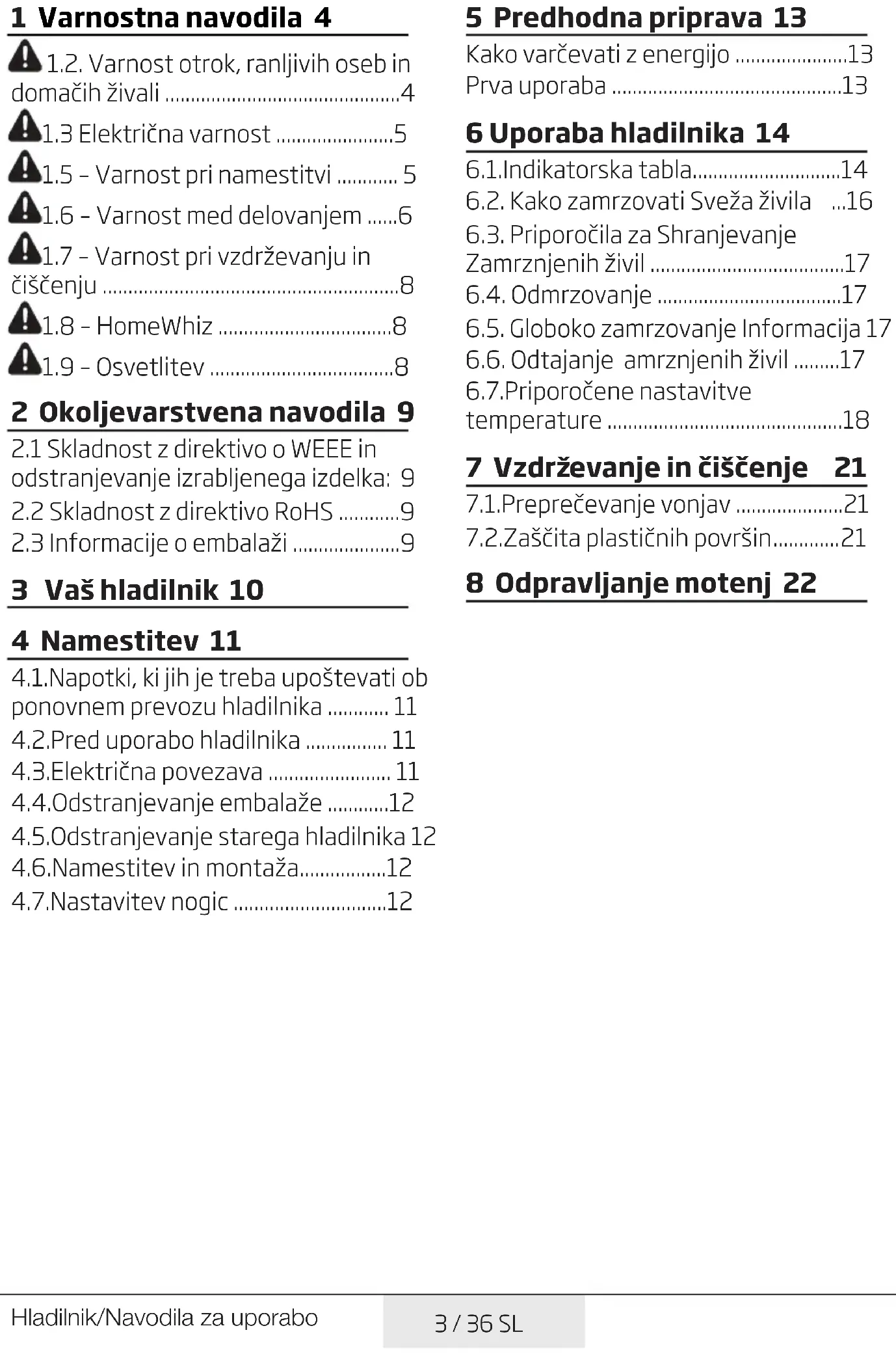 - Ne poškodujte cevi hladilnega sistema z ostrimi ali koničastimi predmeti. Hladilno sredstvo, ki se lahko razprši v primeru predrtja cevi za hladilno sredstvo, podaljškov cevi ali površinskih prevlek, povzroči draženje kože in poškodbe oči.7 / 36 SL Hladilnik/Navodila za uporabo Varnost navodila