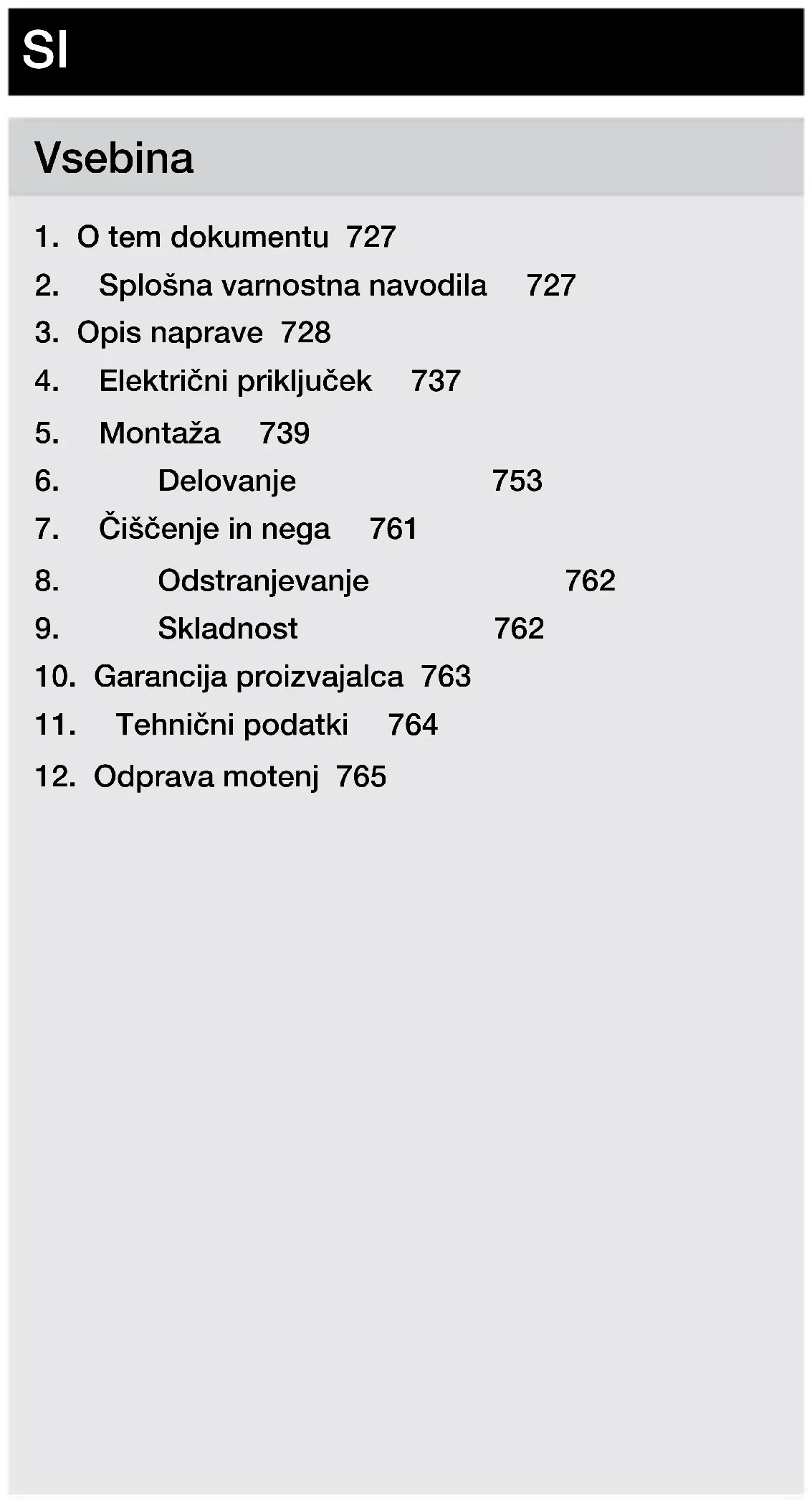 - Shranite jih na dostopnem mestu. – Ravnanje z električnim tokom lahko povzroči nevarne situacije. Dotikanje delov pod napetostjo lahko povzroči električni udar, opekline ali smrt. – Dela na omrežni napetosti lahko izvaja le usposobljeno tehnično osebje. – Upoštevajte lokalne predpise za inštalacijo in priključitev (npr. DE: VDE 0100, AT: ÖVE-ÖNORM E8001-1, CH:SEV 1000). – Uporabljajte samo originalne nadomestne dele. – Popravila naj izvajajo le strokovne delavnice.– 728 – Vsebina