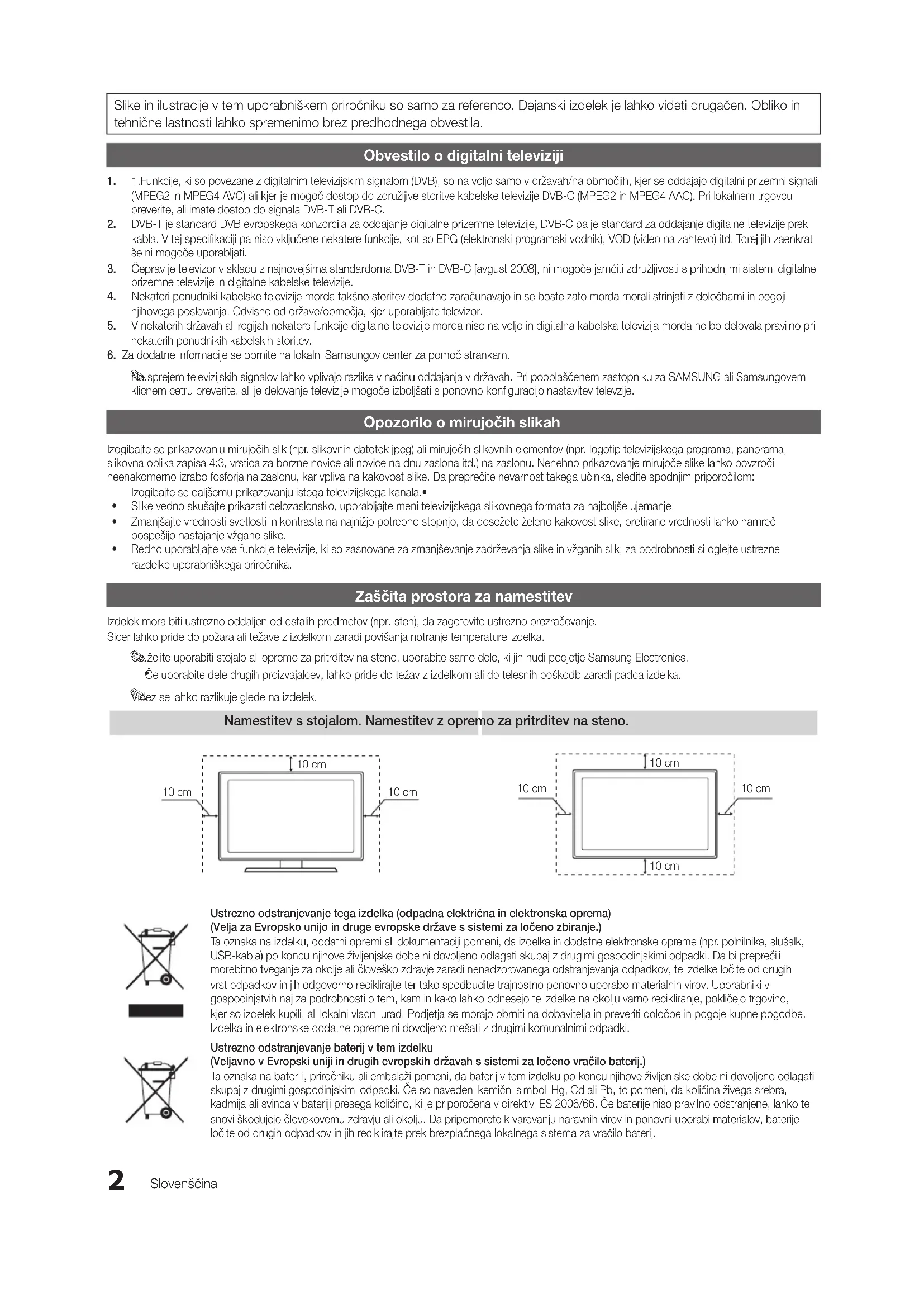 klicnem cetru preverite, ali je delovanje televizije mogoče izboljšati s ponovno konfiguracijo nastavitev televzije. Opozorilo o mirujočih slikah Izogibajte se prikazovanju mirujočih slik (npr. slikovnih datotek jpeg) ali mirujočih slikovnih elementov (npr. logotip televizijskega programa, panorama, slikovna oblika zapisa 4:3, vrstica za borzne novice ali novice na dnu zaslona itd.) na zaslonu. Nenehno prikazovanje mirujoče slike lahko povzroči neenakomerno izrabo fosforja na zaslonu, kar vpliva na kakovost slike. Da preprečite nevarnost takega učinka, sledite spodnjim priporočilom: Izogibajte se daljšemu prikazovanju istega televizijskega kanala.• Slike vedno skušajte prikazati celozaslonsko, uporabljajte meni televizijskega slikovnega formata za najboljše ujemanje.• Zmanjšajte vrednosti svetlosti in kontrasta na najnižjo potrebno stopnjo, da dosežete želeno kakovost slike, pretirane vrednosti lahko namreč • pospešijo nastajanje vžgane slike. Redno uporabljajte vse funkcije televizije, ki so zasnovane za zmanjševanje zadrževanja slike in vžganih slik; za podrobnosti si oglejte ustrezne • razdelke uporabniškega priročnika. Zaščita prostora za namestitev Izdelek mora biti ustrezno oddaljen od ostalih predmetov (npr. sten), da zagotovite ustrezno prezračevanje. Sicer lahko pride do požara ali težave z izdelkom zaradi povišanja notranje temperature izdelka. Če želite uporabiti stojalo ali opremo za pritrditev na steno, uporabite samo dele, ki jih nudi podjetje Samsung Electronics.