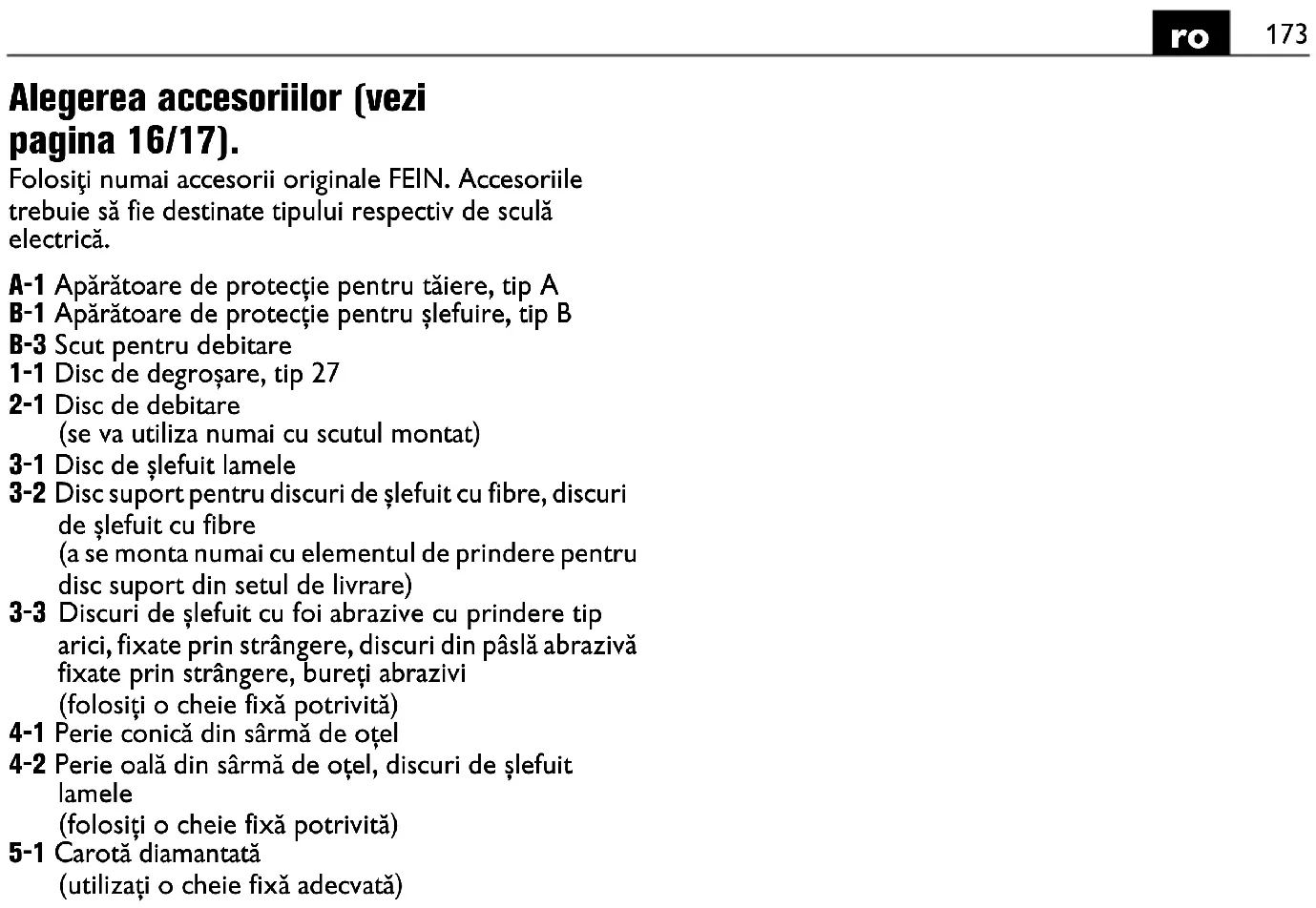 Pred uporabo varovala pred padcem preverite, ali so snemljivi deli na električnem orodju trdno nameščeni. Prepričajte se, da uporaba varovala pred padcem ne ovira uporabe električnega orodja in njegovih zaščitnih naprav. Povežite varovalo pred padcem samo na način, ki je tukaj prikazan, na za to predvideni točki za pritrditev električnega orodja (glejte stran 6). Vzdrževanje in servis. Upoštevajte, da lahko električna orodja popravljajo, servisirajo in pregledujejo samo usposobljeni električarji, saj lahko neustrezna popravila predstavljajo veliko nevarnosti za uporabnika. Pri ekstremnih pogojih uporabe se lahko v notranjosti električnega orodja sesede prevodni prah pri obdelavi kovin. Zaščitna izolacija električnega orodja je lahko okrnjena. Pogosto izpihujte notranjost električnega orodja skozi zračne reže s suhim tlačnim zrakom. Pri obdelavi mavčnih materialov se lahko mavčni prah usede v notranjosti električnega orodja in na stikalnem elementu ter se v povezavi z zračno vlago strdi. To lahko vodi do poškodovanja stikalnega mehanizma. Pogosto izpihavajte notranjost električnega orodja skozi prezračevalne odprtine in stikalni element s suhim stisnjenim zrakom brez vsebnosti olja. Izdelkov, ki so prišli v stik z azbestom, ne smete vročiti v popravilo. Izdelke, ki so prišli v stik z azbestom morate odstraniti v skladu z ustreznimi veljavnimi nacionalnimi predpisi za odstranjevanje odpadkov z vsebnostjo azbesta. Če potrebujete popravilo električnega orodja in pribora FEIN, se obrnite na službo za pomoč strankam FEIN. Naslov najdete na internetu pod naslovom www.fein.com. Pri staranju in obrabi obnovite nalepke in navodila za varnost na električnem orodju. Aktualni seznam nadomestnih delov se nahaja na spletni strani pod www.fein.com. Uporabljajte izključno originalne nadomestne dele. Naslednje dele lahko po potrebi samostojno zamenjajte: Vstavljiva orodja, dodatni ročaj, napenjalna prirobnica, zaščitni pokrov, zaščita za roke Jamstvo in garancija. Jamstvo za izdelek velja v skladu z zakonskimi pravili v državi, kjer se je izdelek dal v promet. Poleg tega vam daje FEIN garancijo v skladu z izjavo proizvajalca FEIN. V obsegu dobave električnega orodja se lahko nahaja tudi le del pribora, ki je opisan ali naslikan v tem navodilu za obratovanje. Izjava o skladnosti. Izjava CE velja samo za države Evropske unije in EFTO (Evropsko združenje za prosto trgovino) in samo za izdelke, ki so namenjeni za trg Evropske unije ali ETFE. Po dajanju izdelka v promet na trg Evropske unije, izgubi znak UKCA svojo veljavnost. Izjava UKCA velja samo za britanski trg (Anglijo, Wales in Škotsko) in samo za izdelke, ki so namenjeni za britanski trg. Po dajanju izdelka v promet na britanski trg izgubi oznaka CE svojo veljavnost. Varstvo okolja, odstranitev odpadkov. Embalaže, odpadna električnega orodja in pribor morate reciklirati v skladu z varstvom okolja. Izbor pribora (glejte stran 16/17). Uporabite le originalni pribor podjetja FEIN. Pribor mora biti namenjen za tip električnega orodja. A-1 Zaščitni pokrov za rezanje, tip A B-1 Zaščitni pokrov za brušenje, tip B B-3 Zaščitni pokrov za ločenje 1-1 Stružna plošča, tip 27 2-1 Rezalna plošča (uporabite jo samo z montiranim zaščitnim pokrovom) 3-1 Lamelna brusna plošča 3-2 Oporna plošča za vlaknene brusne plošče, vlaknene brusne plošče (namestite jo samo s pri dostavi priloženim sredstvom za napenjanje oporne plošče) 3-3 brusna plošča z ježkom, oprijemalnimi brusnimi listi, oprijemalnim brusnim flisom, gobicami (uporabite pri tem ustrezni viličasti ključ) 4-1 Stožčasta krtača iz jeklene žice 4-2 Krtača za lonce iz jeklene žice, lamelni brusilni koluti (uporabite pri tem ustrezni viličasti ključ) 5-1 Diamantni izrezovalnik lukenj (uporabite pri tem ustrezni viličasti ključ)182