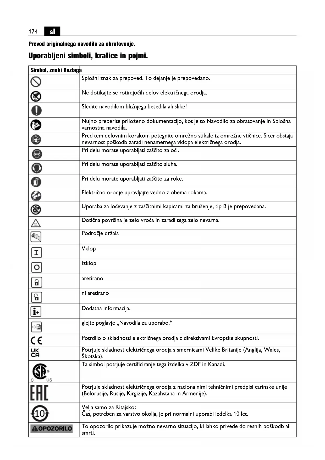 Prevod originalnega navodila za obratovanje. Uporabljeni simboli, kratice in pojmi. Simbol, znaki Razlaga Splošni znak za prepoved. To dejanje je prepovedano. Ne dotikajte se rotirajočih delov električnega orodja. Sledite navodilom bližnjega besedila ali slike! Nujno preberite priloženo dokumentacijo, kot je to Navodilo za obratovanje in Splošna varnostna navodila. Pred tem delovnim korakom potegnite omrežno stikalo iz omrežne vtičnice. Sicer obstaja nevarnost poškodb zaradi nenamernega vklopa električnega orodja. Pri delu morate uporabljati zaščito za oči. Pri delu morate uporabljati zaščito sluha. Pri delu morate uporabljati zaščito za roke. Električno orodje upravljajte vedno z obema rokama. Uporaba za ločevanje z zaščitnimi kapicami za brušenje, tip B je prepovedana. Dotična površina je zelo vroča in zaradi tega zelo nevarna. Področje držala Vklop Izklop aretirano ni aretirano Dodatna informacija. glejte poglavje „Navodila za uporabo.“ Potrdilo o skladnosti električnega orodja z direktivami Evropske skupnosti. Potrjuje skladnost električnega orodja s smernicami Velike Britanije (Anglija, Wales, Škotska). Ta simbol potrjuje certificiranje tega izdelka v ZDF in Kanadi. Potrjuje skladnost električnega orodja z nacionalnimi tehničnimi predpisi carinske unije (Belorusije, Rusije, Kirgizije, Kazahstana in Armenije). Velja samo za Kitajsko: Čas, potreben za varstvo okolja, je pri normalni uporabi izdelka 10 let. To opozorilo prikazuje možno nevarno situacijo, ki lahko privede do resnih poškodb ali smrti.175