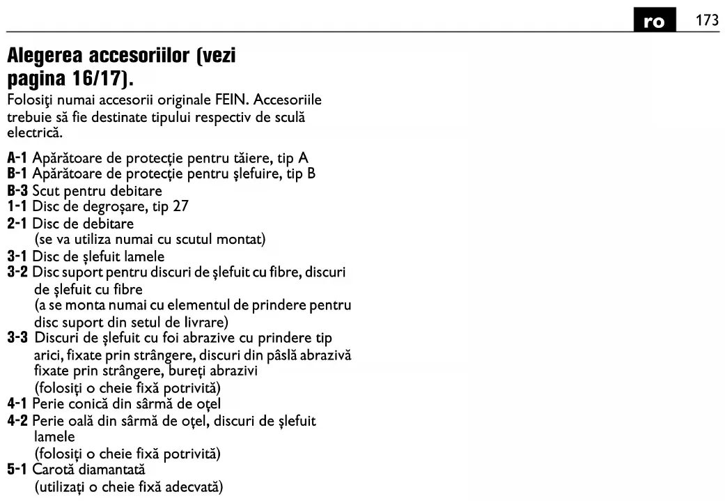 Pred uporabo varovala pred padcem preverite, ali so snemljivi deli na električnem orodju trdno nameščeni. Prepričajte se, da uporaba varovala pred padcem ne ovira uporabe električnega orodja in njegovih zaščitnih naprav. Povežite varovalo pred padcem samo na način, ki je tukaj prikazan, na za to predvideni točki za pritrditev električnega orodja (glejte stran 6). Vzdrževanje in servis. Upoštevajte, da lahko električna orodja popravljajo, servisirajo in pregledujejo samo usposobljeni električarji, saj lahko neustrezna popravila predstavljajo veliko nevarnosti za uporabnika. Pri ekstremnih pogojih uporabe se lahko v notranjosti električnega orodja sesede prevodni prah pri obdelavi kovin. Zaščitna izolacija električnega orodja je lahko okrnjena. Pogosto izpihujte notranjost električnega orodja skozi zračne reže s suhim tlačnim zrakom. Pri obdelavi mavčnih materialov se lahko mavčni prah usede v notranjosti električnega orodja in na stikalnem elementu ter se v povezavi z zračno vlago strdi. To lahko vodi do poškodovanja stikalnega mehanizma. Pogosto izpihavajte notranjost električnega orodja skozi prezračevalne odprtine in stikalni element s suhim stisnjenim zrakom brez vsebnosti olja. Izdelkov, ki so prišli v stik z azbestom, ne smete vročiti v popravilo. Izdelke, ki so prišli v stik z azbestom morate odstraniti v skladu z ustreznimi veljavnimi nacionalnimi predpisi za odstranjevanje odpadkov z vsebnostjo azbesta. Če potrebujete popravilo električnega orodja in pribora FEIN, se obrnite na službo za pomoč strankam FEIN. Naslov najdete na internetu pod naslovom www.fein.com. Pri staranju in obrabi obnovite nalepke in navodila za varnost na električnem orodju. Aktualni seznam nadomestnih delov se nahaja na spletni strani pod www.fein.com. Uporabljajte izključno originalne nadomestne dele. Naslednje dele lahko po potrebi samostojno zamenjajte: Vstavljiva orodja, dodatni ročaj, napenjalna prirobnica, zaščitni pokrov, zaščita za roke Jamstvo in garancija. Jamstvo za izdelek velja v skladu z zakonskimi pravili v državi, kjer se je izdelek dal v promet. Poleg tega vam daje FEIN garancijo v skladu z izjavo proizvajalca FEIN. V obsegu dobave električnega orodja se lahko nahaja tudi le del pribora, ki je opisan ali naslikan v tem navodilu za obratovanje. Izjava o skladnosti. Izjava CE velja samo za države Evropske unije in EFTO (Evropsko združenje za prosto trgovino) in samo za izdelke, ki so namenjeni za trg Evropske unije ali ETFE. Po dajanju izdelka v promet na trg Evropske unije, izgubi znak UKCA svojo veljavnost. Izjava UKCA velja samo za britanski trg (Anglijo, Wales in Škotsko) in samo za izdelke, ki so namenjeni za britanski trg. Po dajanju izdelka v promet na britanski trg izgubi oznaka CE svojo veljavnost. Varstvo okolja, odstranitev odpadkov. Embalaže, odpadna električnega orodja in pribor morate reciklirati v skladu z varstvom okolja. Izbor pribora (glejte stran 16/17). Uporabite le originalni pribor podjetja FEIN. Pribor mora biti namenjen za tip električnega orodja. A-1 Zaščitni pokrov za rezanje, tip A B-1 Zaščitni pokrov za brušenje, tip B B-3 Zaščitni pokrov za ločenje 1-1 Stružna plošča, tip 27 2-1 Rezalna plošča (uporabite jo samo z montiranim zaščitnim pokrovom) 3-1 Lamelna brusna plošča 3-2 Oporna plošča za vlaknene brusne plošče, vlaknene brusne plošče (namestite jo samo s pri dostavi priloženim sredstvom za napenjanje oporne plošče) 3-3 brusna plošča z ježkom, oprijemalnimi brusnimi listi, oprijemalnim brusnim flisom, gobicami (uporabite pri tem ustrezni viličasti ključ) 4-1 Stožčasta krtača iz jeklene žice 4-2 Krtača za lonce iz jeklene žice, lamelni brusilni koluti (uporabite pri tem ustrezni viličasti ključ) 5-1 Diamantni izrezovalnik lukenj (uporabite pri tem ustrezni viličasti ključ)182
