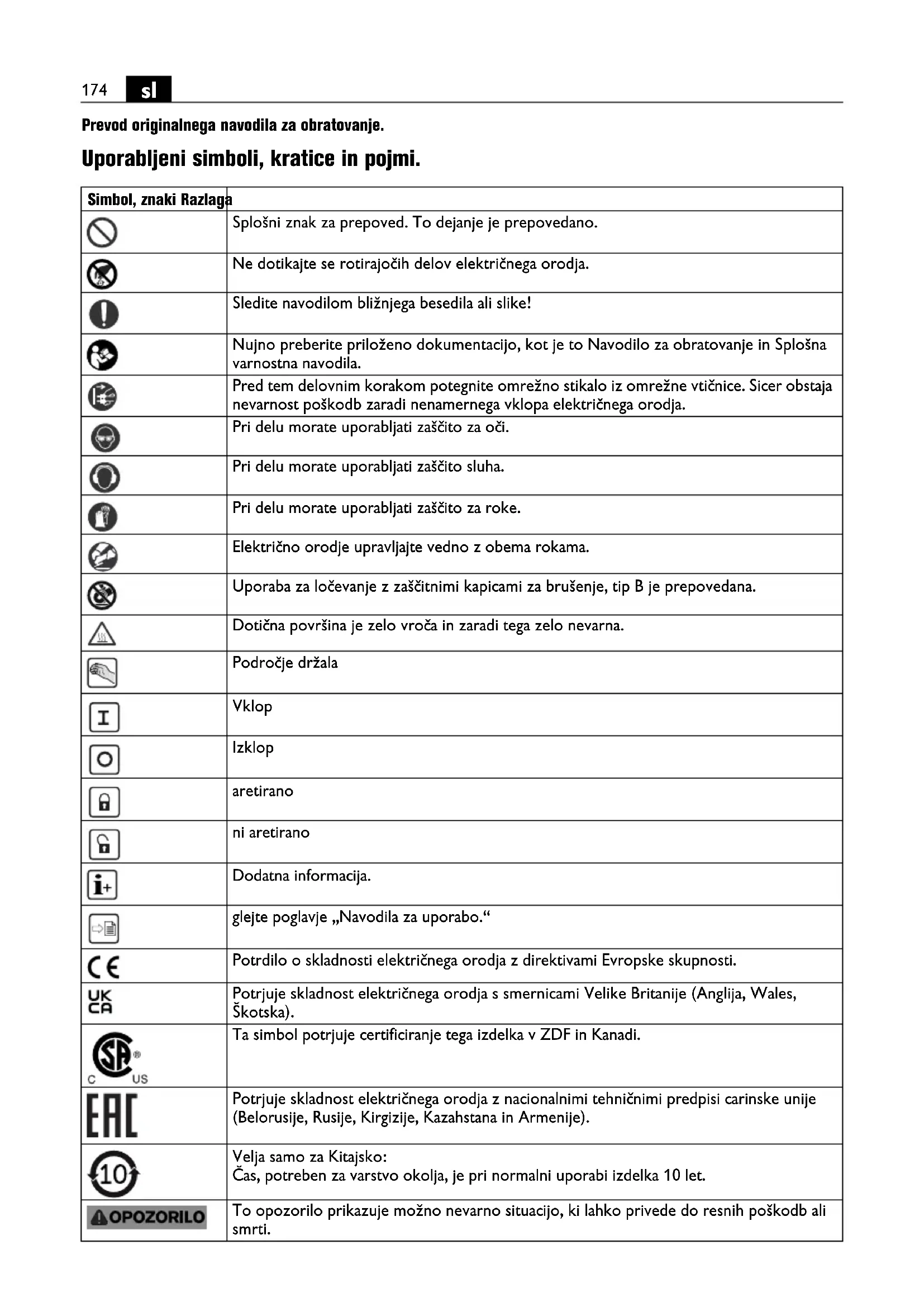 Prevod originalnega navodila za obratovanje. Uporabljeni simboli, kratice in pojmi. Simbol, znaki Razlaga Splošni znak za prepoved. To dejanje je prepovedano. Ne dotikajte se rotirajočih delov električnega orodja. Sledite navodilom bližnjega besedila ali slike! Nujno preberite priloženo dokumentacijo, kot je to Navodilo za obratovanje in Splošna varnostna navodila. Pred tem delovnim korakom potegnite omrežno stikalo iz omrežne vtičnice. Sicer obstaja nevarnost poškodb zaradi nenamernega vklopa električnega orodja. Pri delu morate uporabljati zaščito za oči. Pri delu morate uporabljati zaščito sluha. Pri delu morate uporabljati zaščito za roke. Električno orodje upravljajte vedno z obema rokama. Uporaba za ločevanje z zaščitnimi kapicami za brušenje, tip B je prepovedana. Dotična površina je zelo vroča in zaradi tega zelo nevarna. Področje držala Vklop Izklop aretirano ni aretirano Dodatna informacija. glejte poglavje „Navodila za uporabo.“ Potrdilo o skladnosti električnega orodja z direktivami Evropske skupnosti. Potrjuje skladnost električnega orodja s smernicami Velike Britanije (Anglija, Wales, Škotska). Ta simbol potrjuje certificiranje tega izdelka v ZDF in Kanadi. Potrjuje skladnost električnega orodja z nacionalnimi tehničnimi predpisi carinske unije (Belorusije, Rusije, Kirgizije, Kazahstana in Armenije). Velja samo za Kitajsko: Čas, potreben za varstvo okolja, je pri normalni uporabi izdelka 10 let. To opozorilo prikazuje možno nevarno situacijo, ki lahko privede do resnih poškodb ali smrti.175